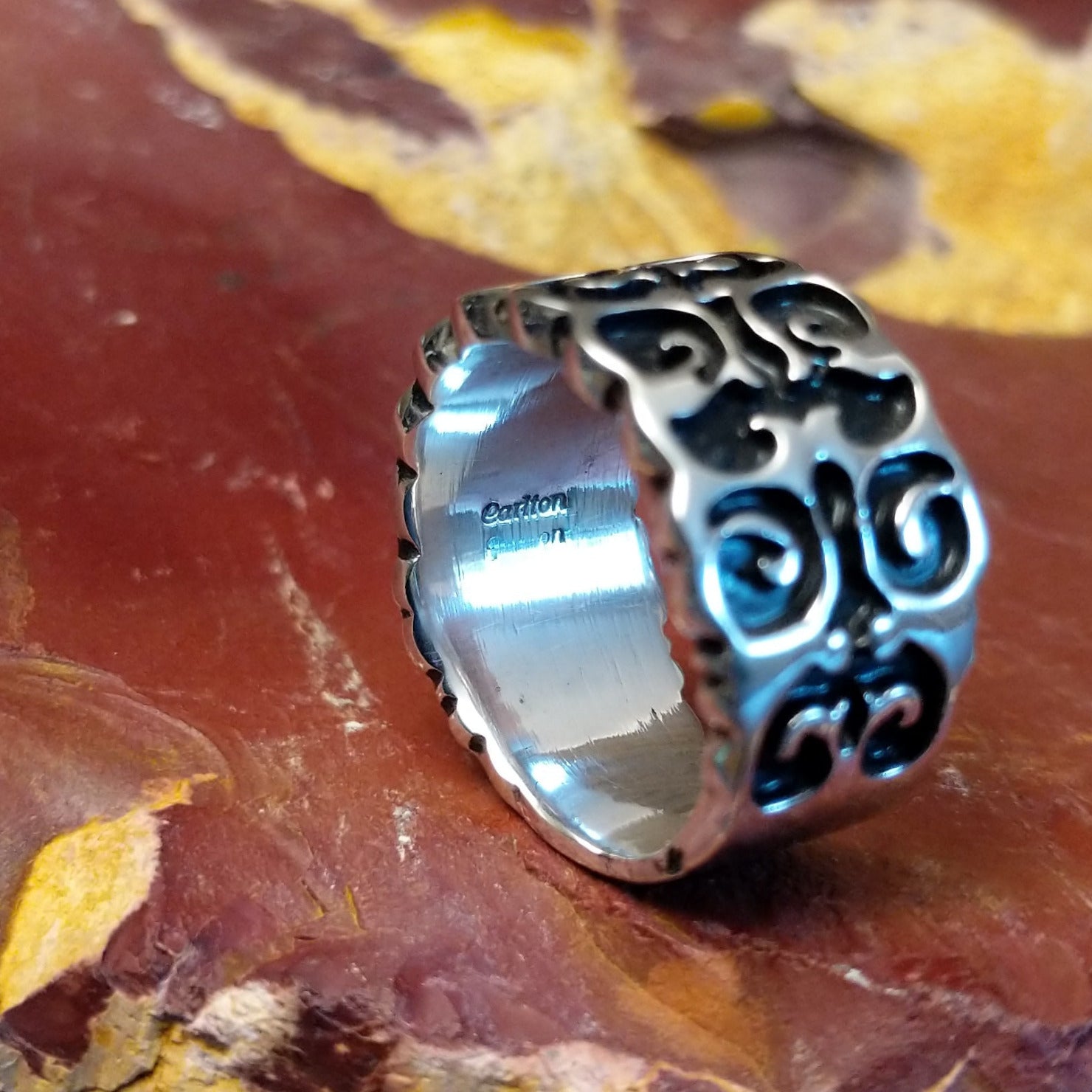 Crafted by Zuni artisan Carlton Jamon, this sterling silver ring showcases perfectly balanced symmetrical patterns that spread from the center of the band. The expert craftsmanship creates a stunning choice for discerning collectors who appreciate unique charm of the piece.