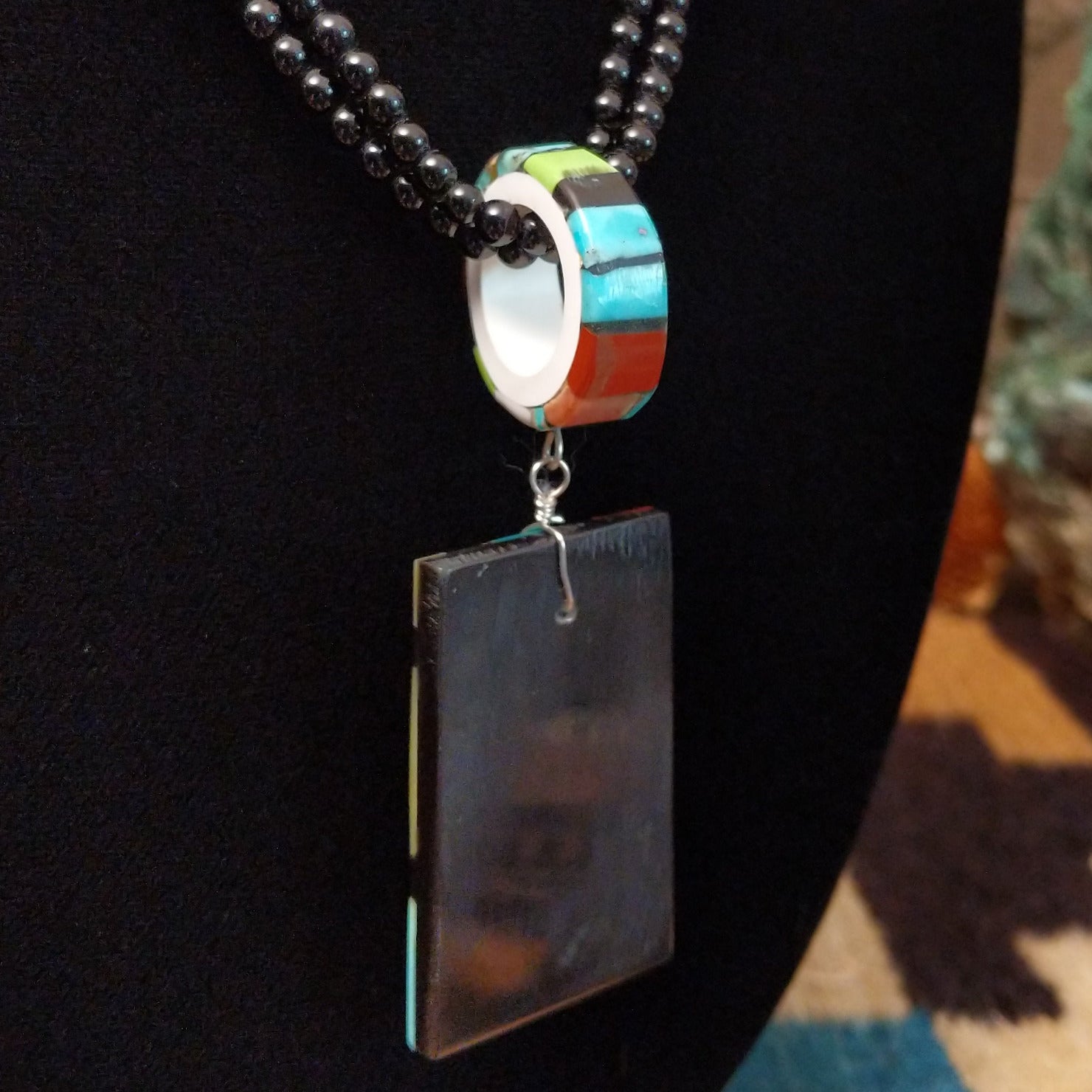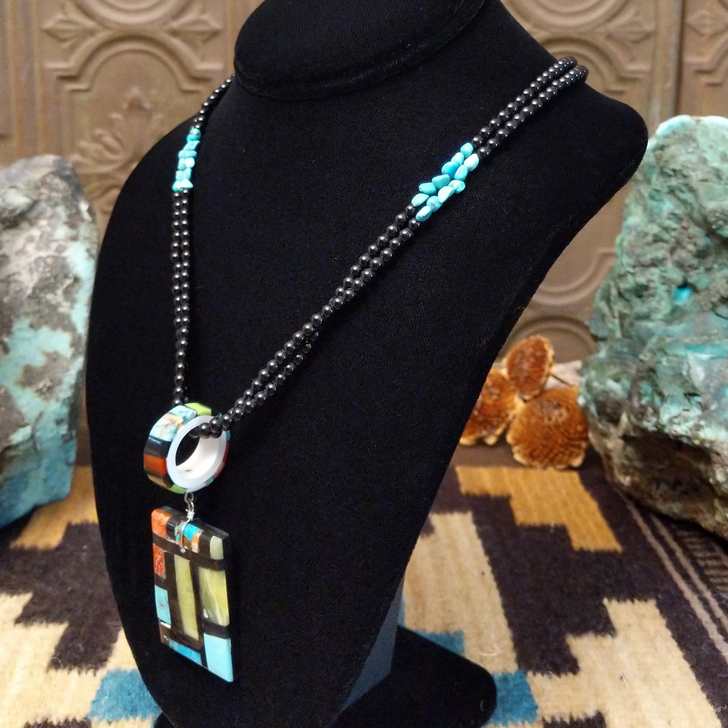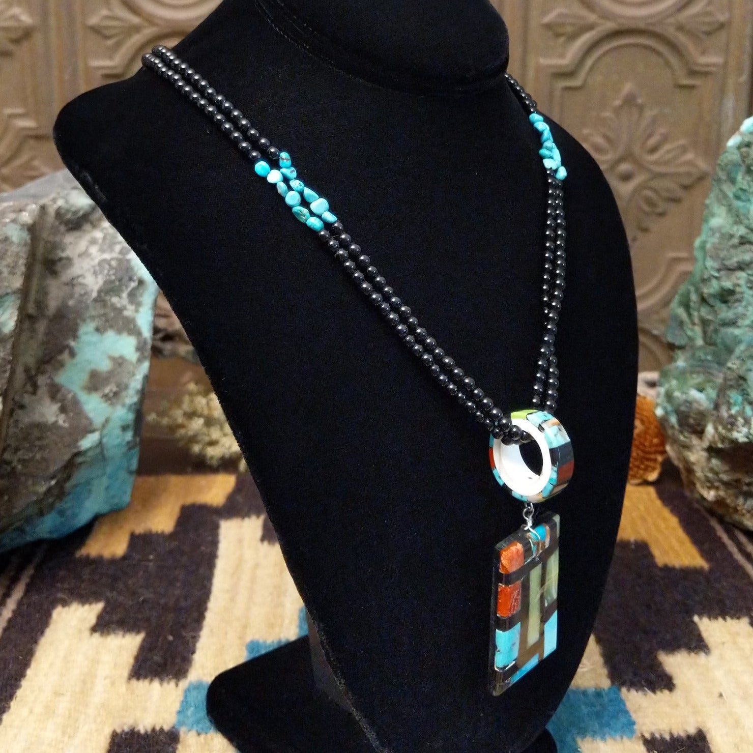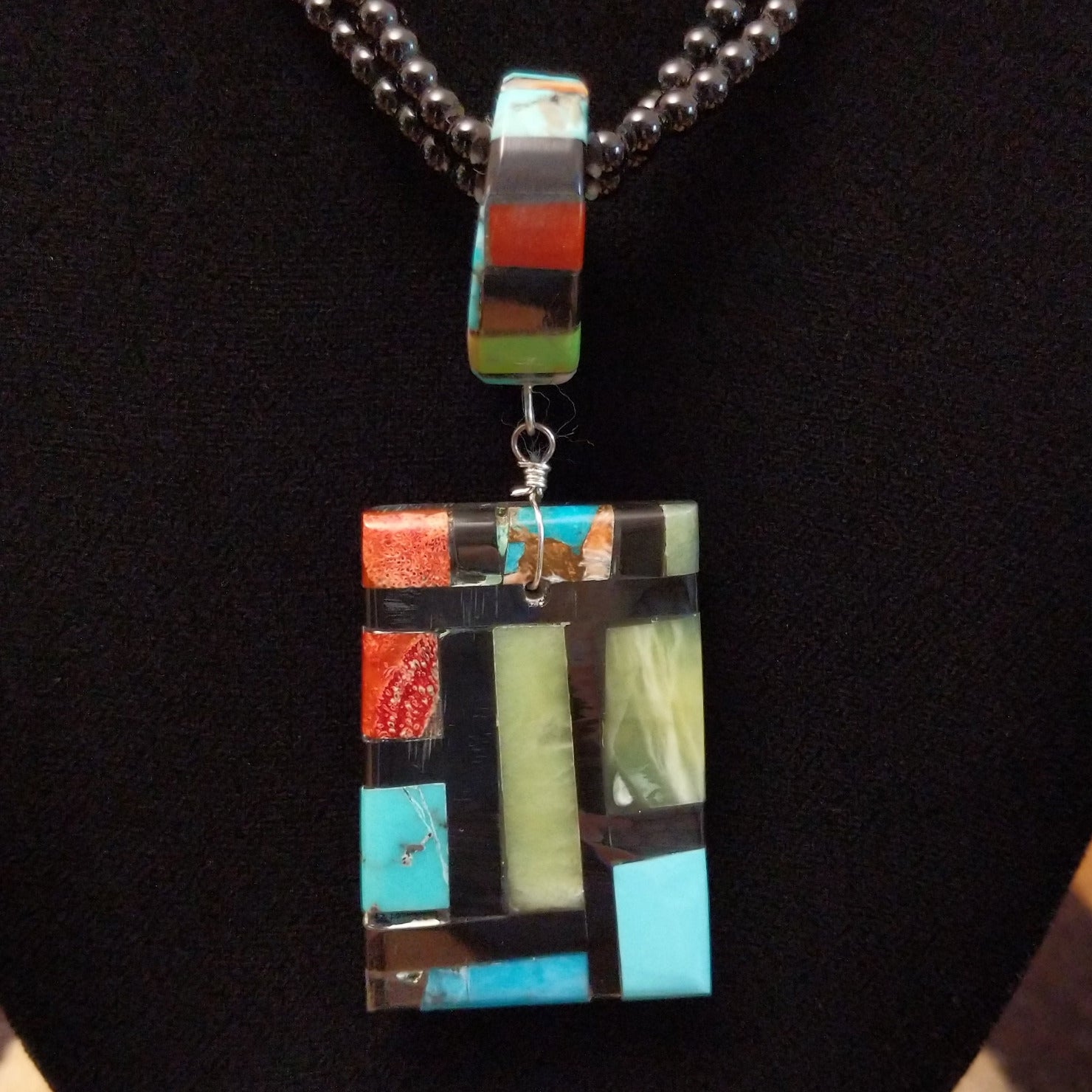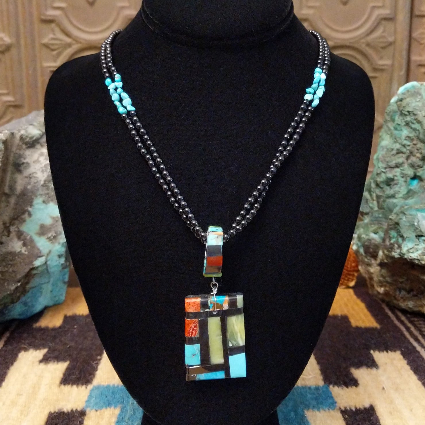 This Santo Domingo made necklace features multiple stones inlaid on the pendant that creates a vibrant, tiled design. The piece features duel beaded chains that makes this a unique and beautiful adornment for collectors.