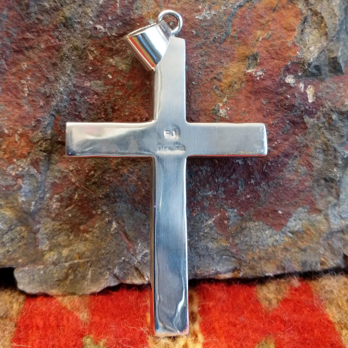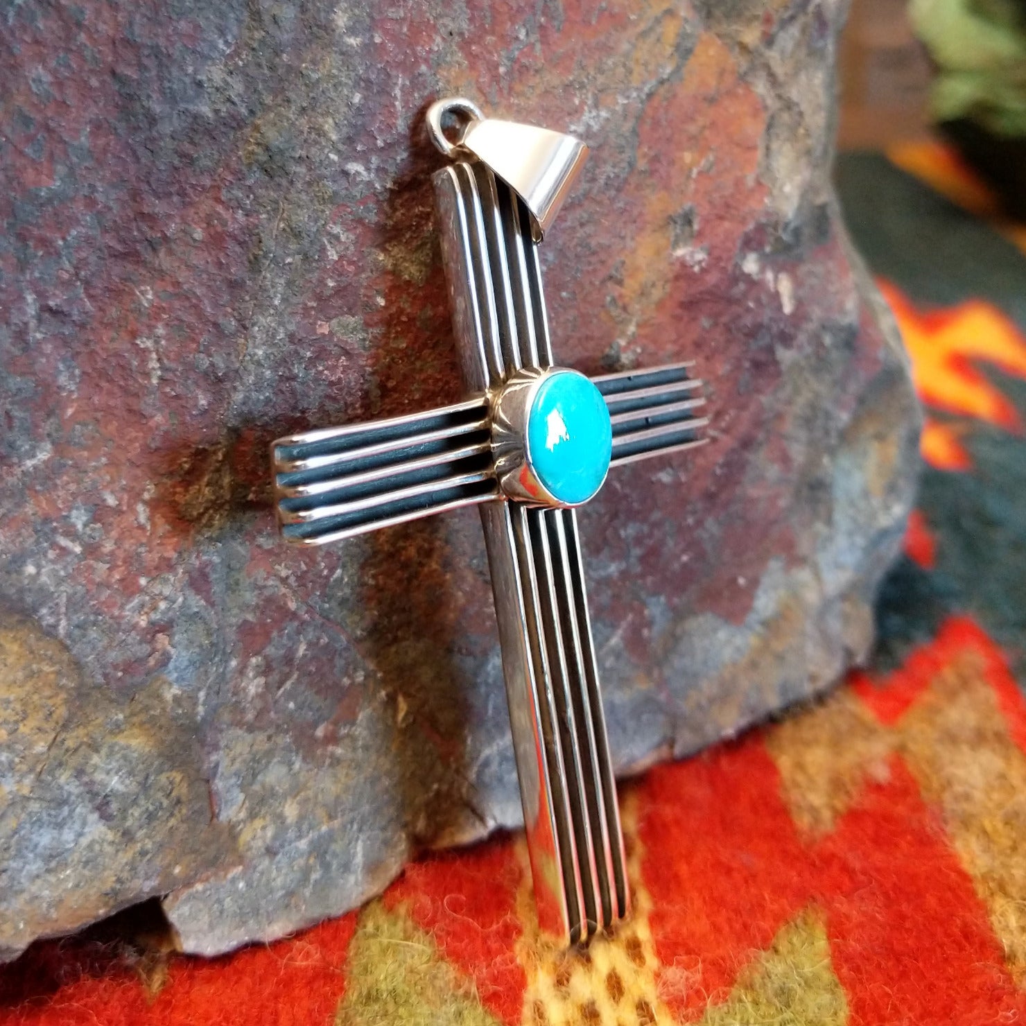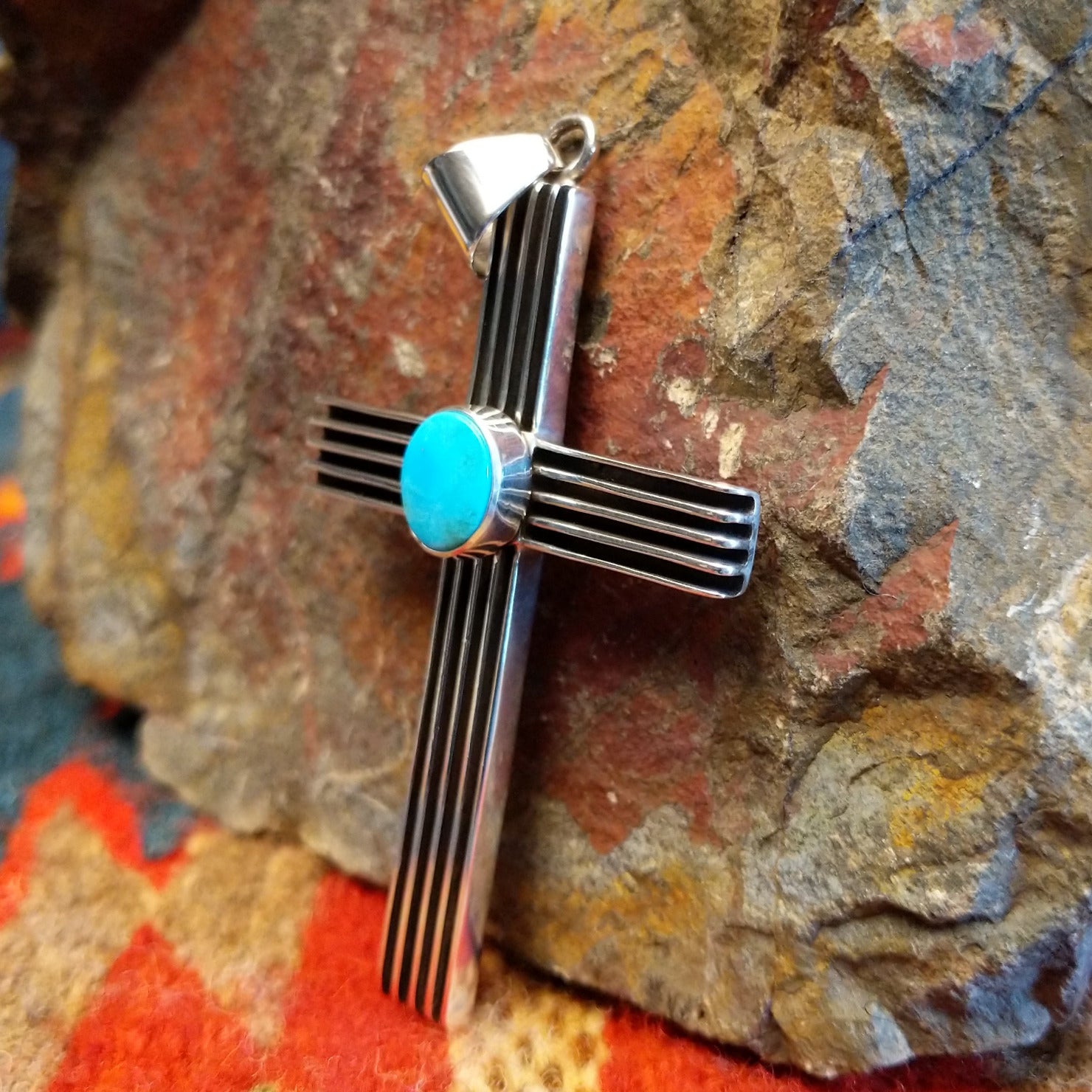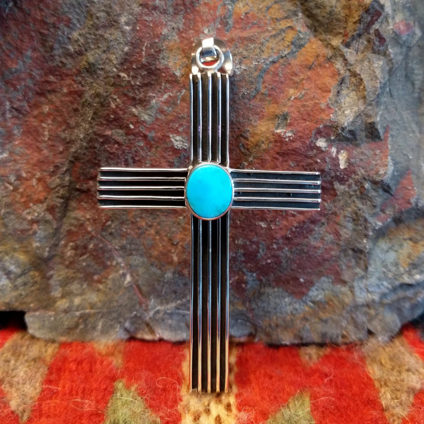 This grooved sterling silver cross pendant by Francis Jones features a single vibrant turquoise stone at its center, highlighting the beauty of the natural gem. Handcrafted with subtle grooves that add texture and dimension, the pendant reflects traditional Navajo silverwork techniques. Simple yet striking, it’s a timeless piece that showcases both skilled craftsmanship and cultural artistry.