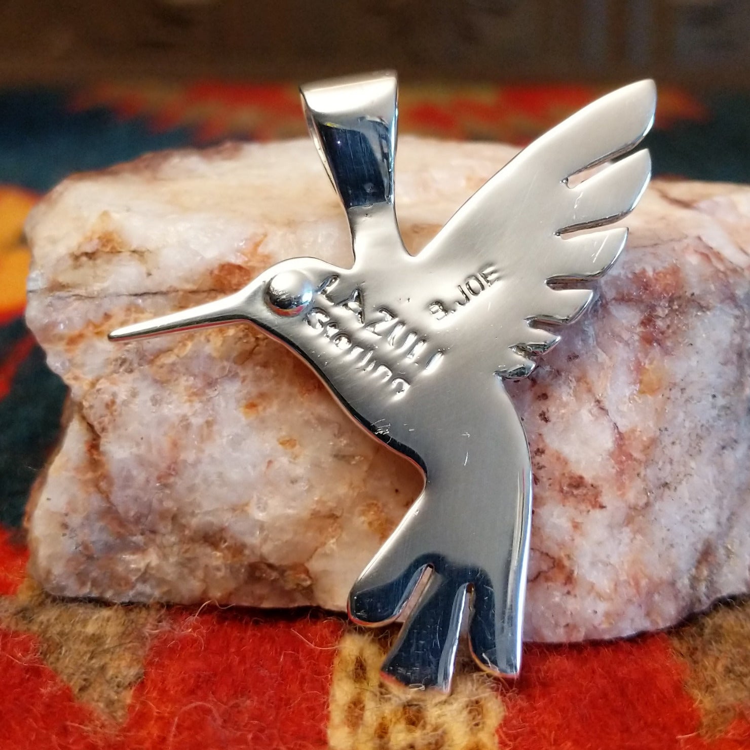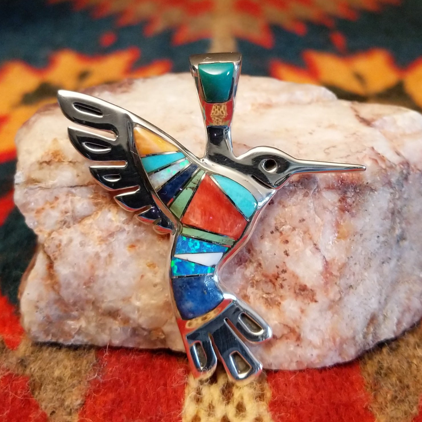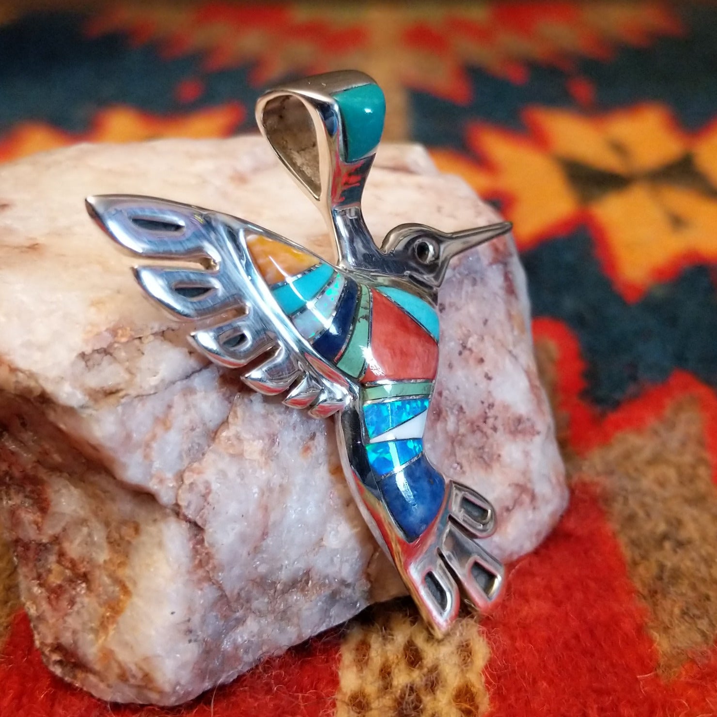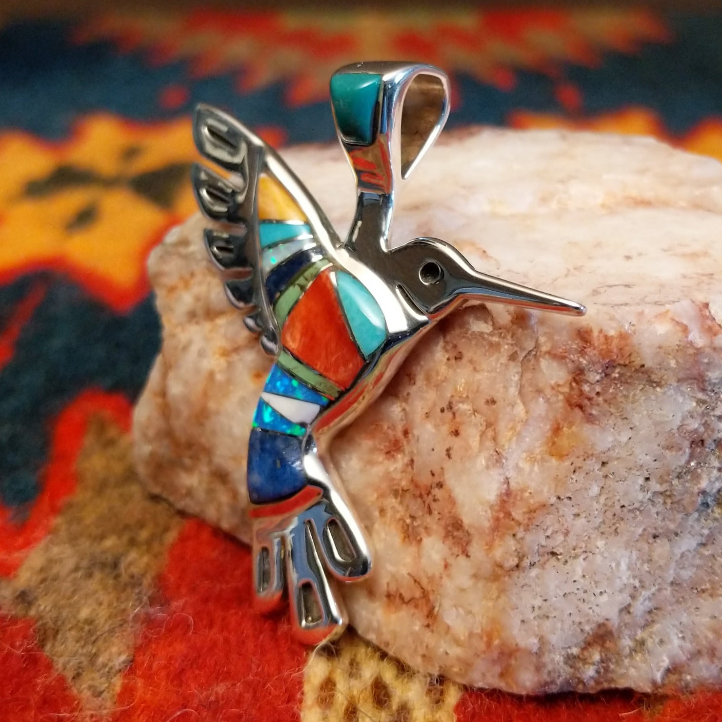 This multistone hummingbird pendant by Betty Joe is handcrafted in sterling silver and features vibrant inlay of orange and red spiny oyster shell, turquoise, denim lapis, blue manmade opal, and magnesite. The colorful mosaic design highlights the graceful hummingbird, creating a bright and eye-catching Southwestern statement piece.