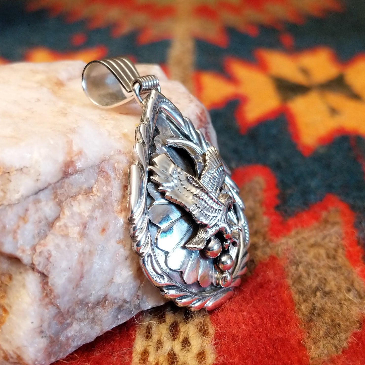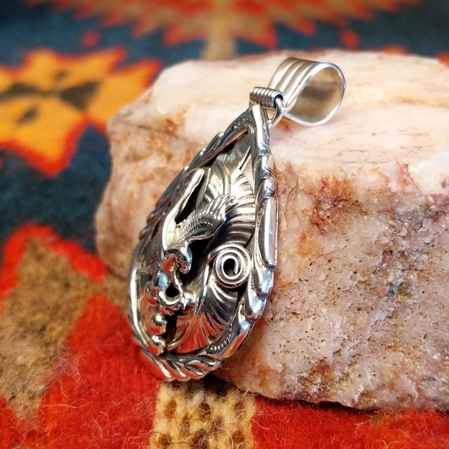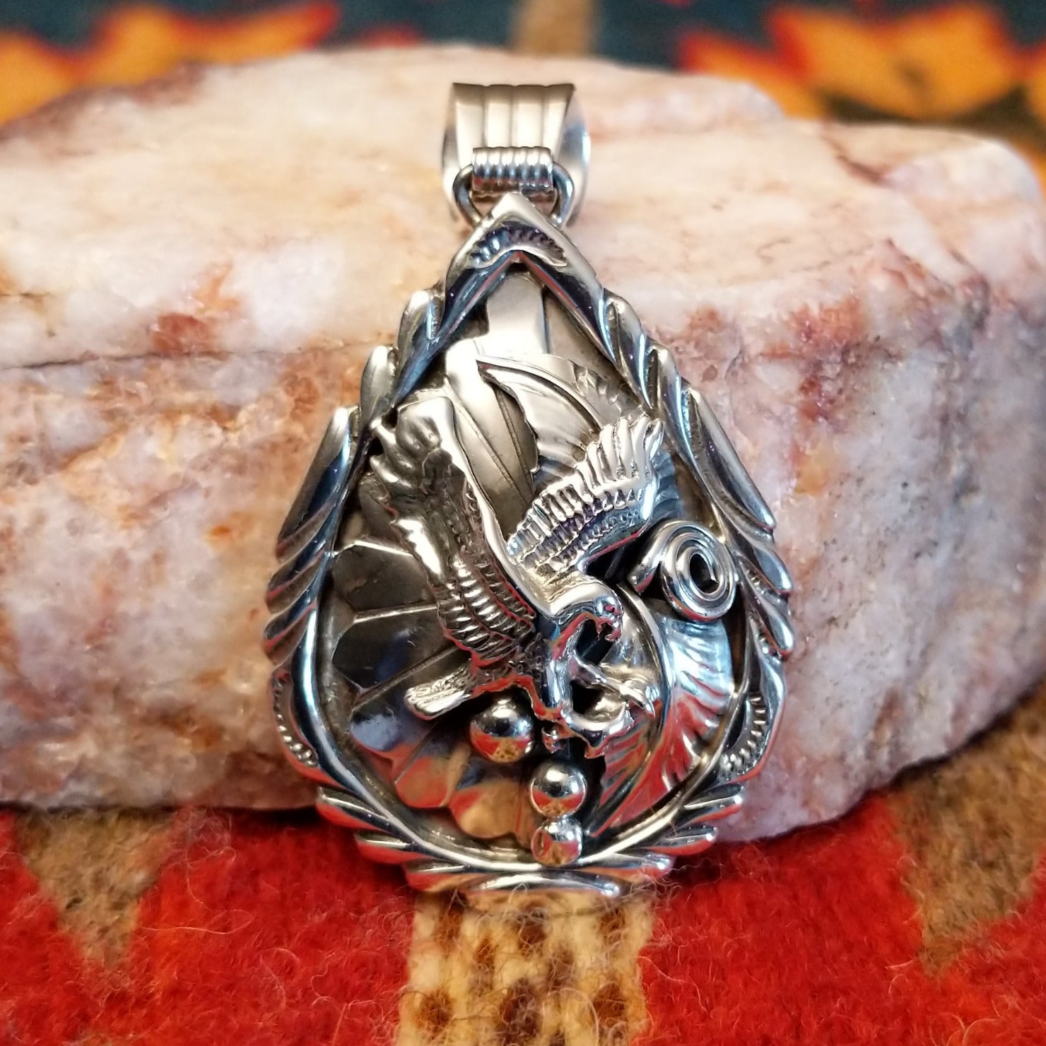 This Navajo Eagle pendant is beautifully handcrafted in sterling silver, featuring a detailed soaring eagle set within a feathered and scrollwork frame. The dimensional design showcases intricate stamping and polished accents that highlight the strength and symbolism of the eagle. A bold and meaningful Southwestern piece, representing freedom, courage, and tradition.