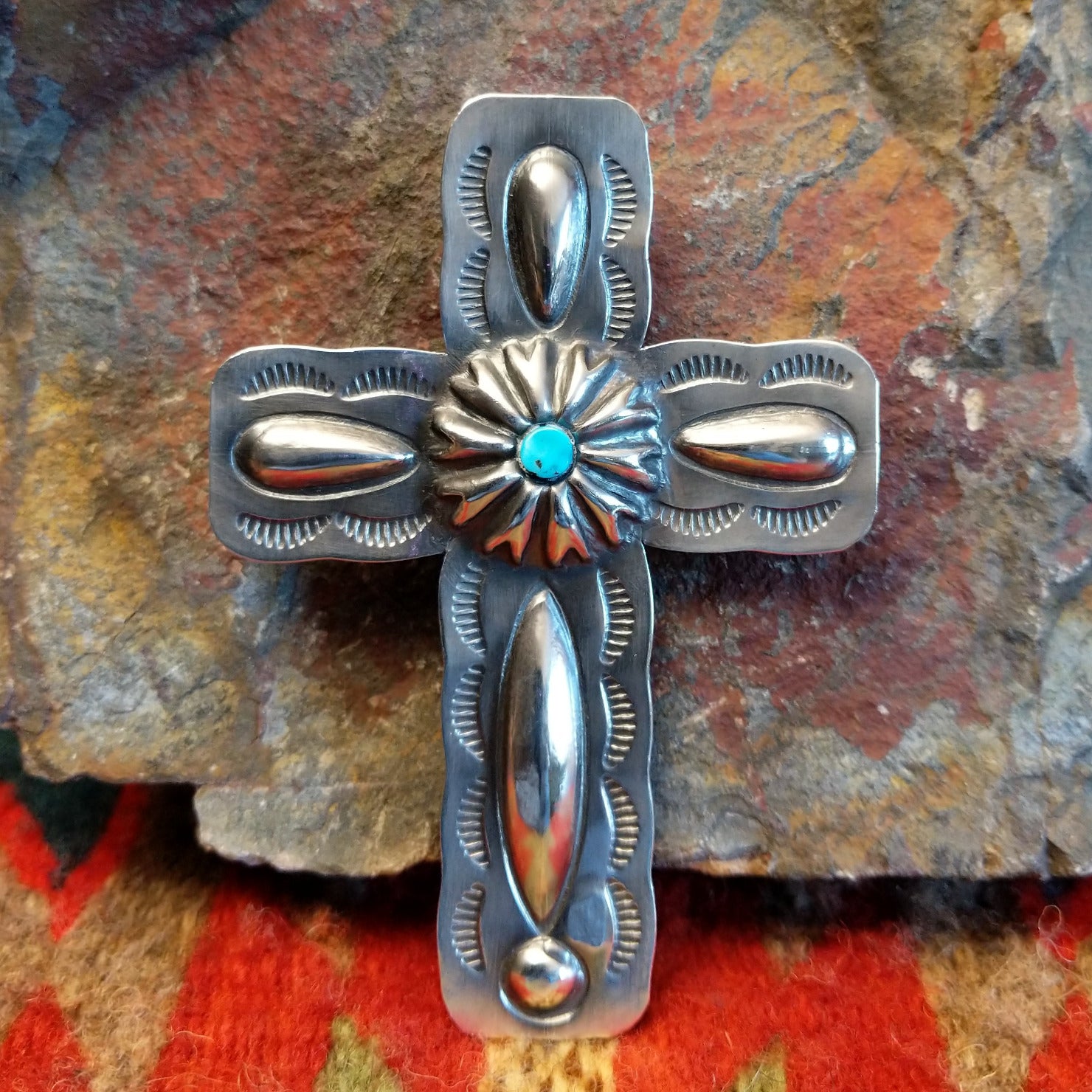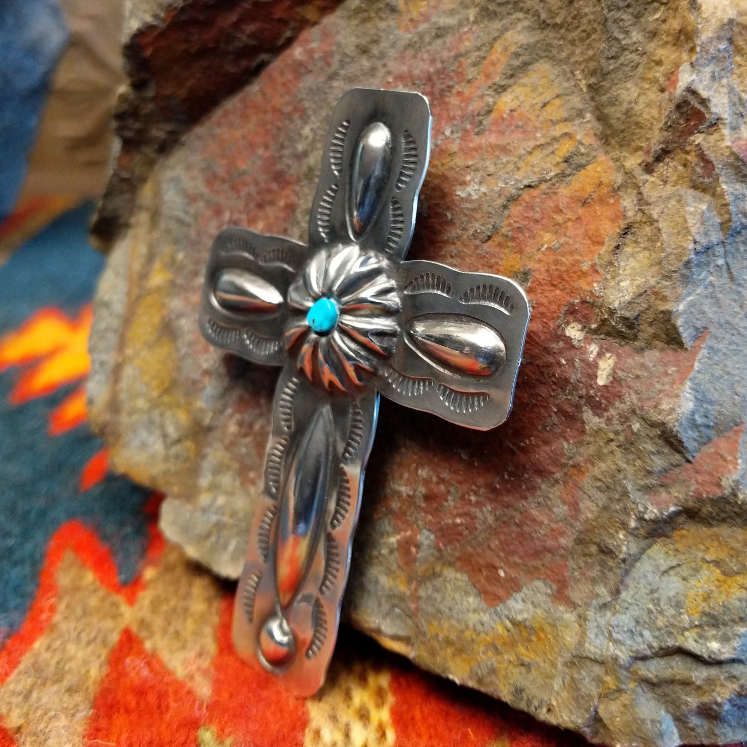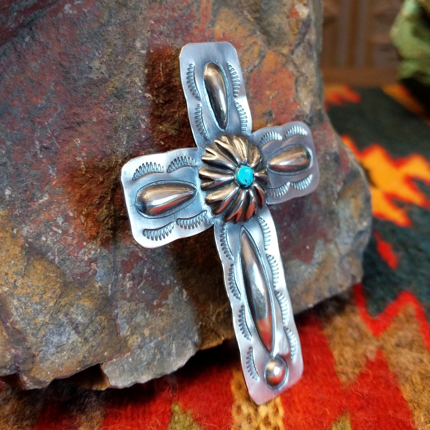 This stamped cross pendant by Navajo artisan Charlene Yazzie features a timeless design rooted in Southwest tradition. Handcrafted in sterling silver, the cross is adorned with classic Navajo stamping that adds depth and character. At the center rests a small piece of natural turquoise, offering a vibrant pop of color and honoring the stone’s cultural significance. Simple yet meaningful, this pendant reflects both skilled craftsmanship and the beauty of Navajo jewelry artistry.