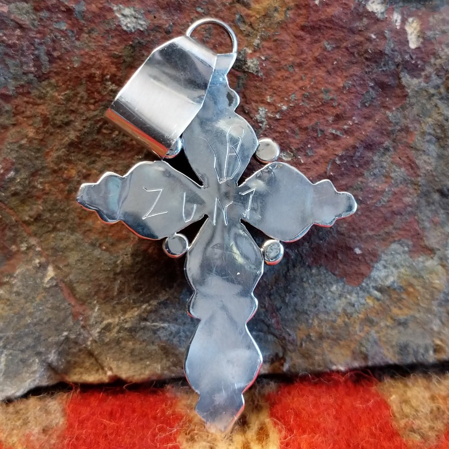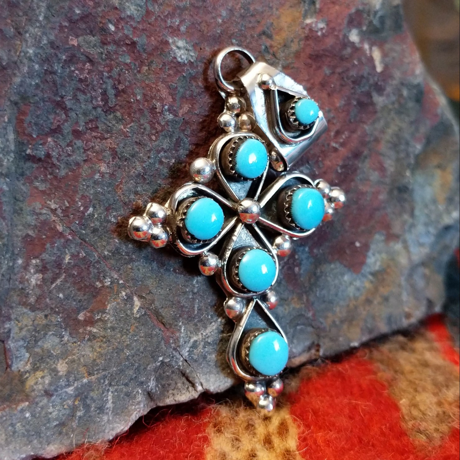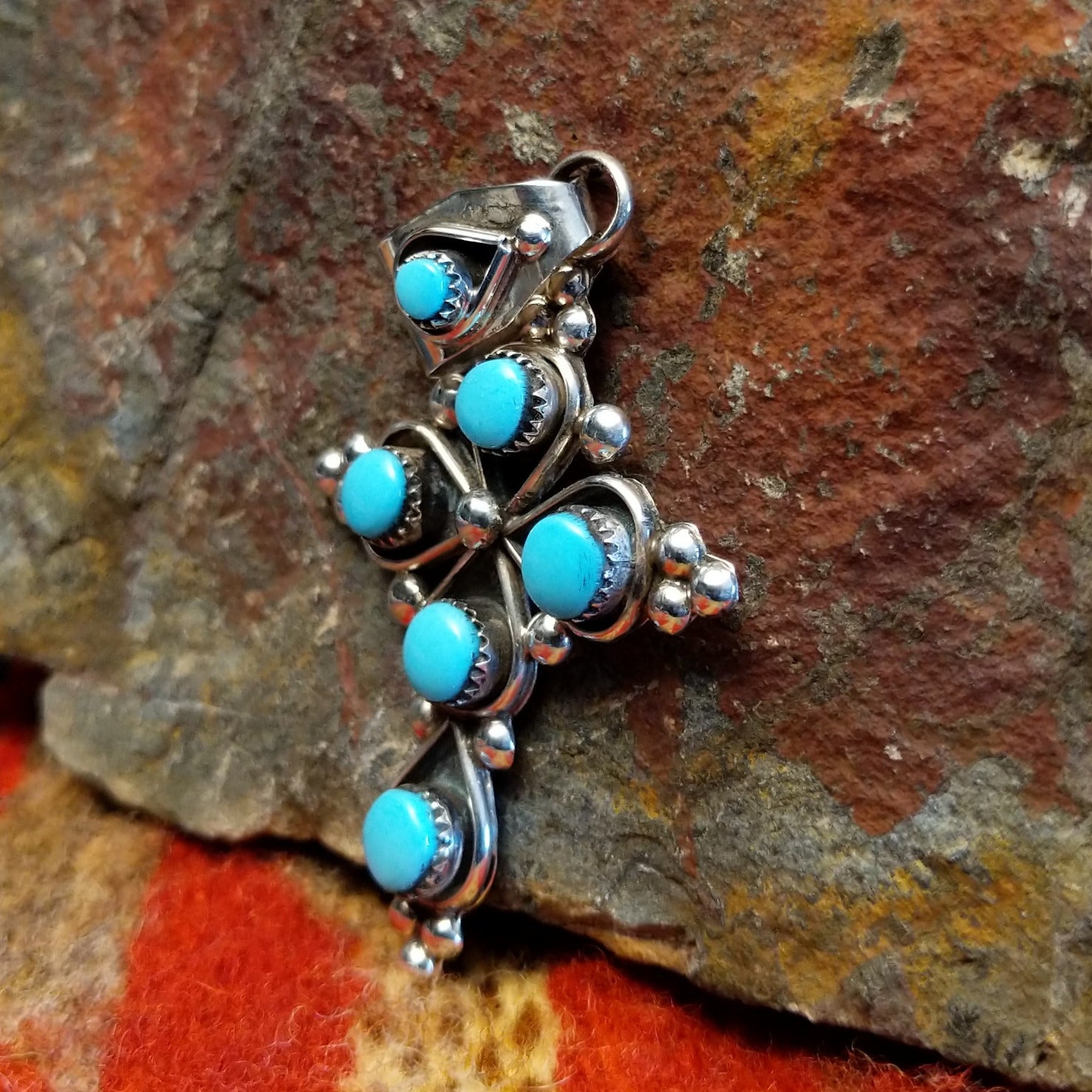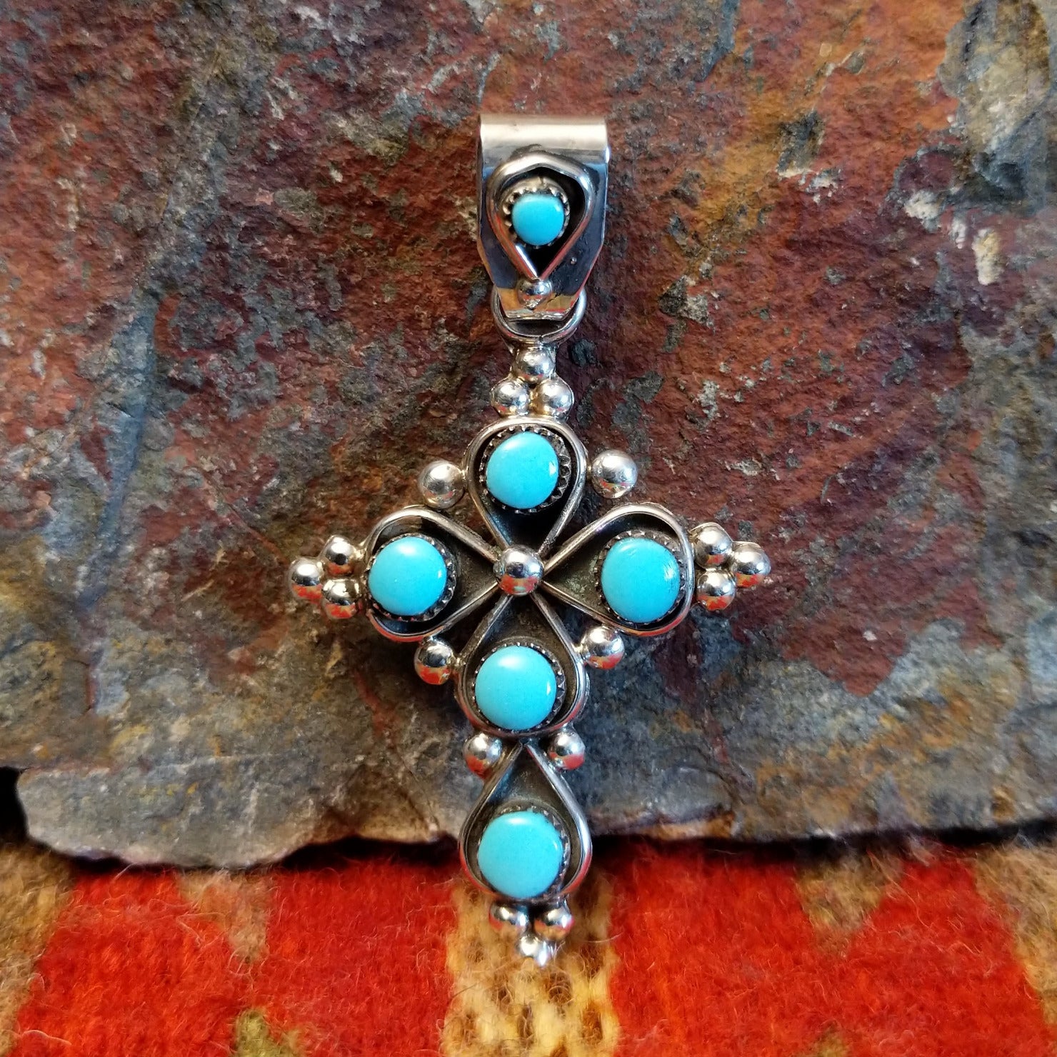 This cross pendant by Zuni artisan L.B. showcases the intricate beauty of traditional Zuni stonework. Handcrafted in sterling silver, the design features small “snake eye” pieces of turquoise carefully set to create a vibrant, eye-catching pattern. The bright blue stones contrast beautifully with the polished silver, highlighting the precision and artistry of Zuni jewelry making. Elegant and symbolic, this pendant reflects both cultural tradition and skilled craftsmanship.