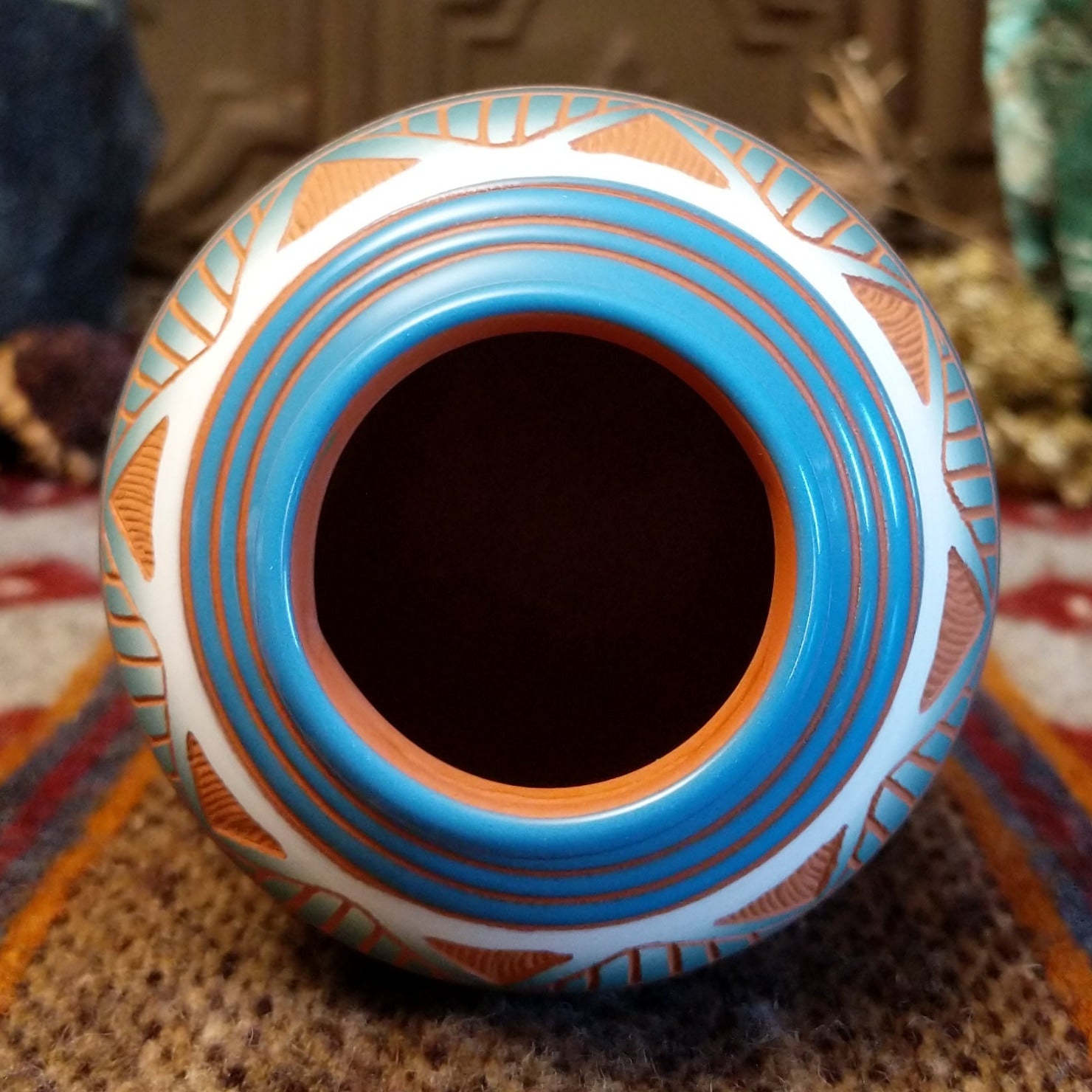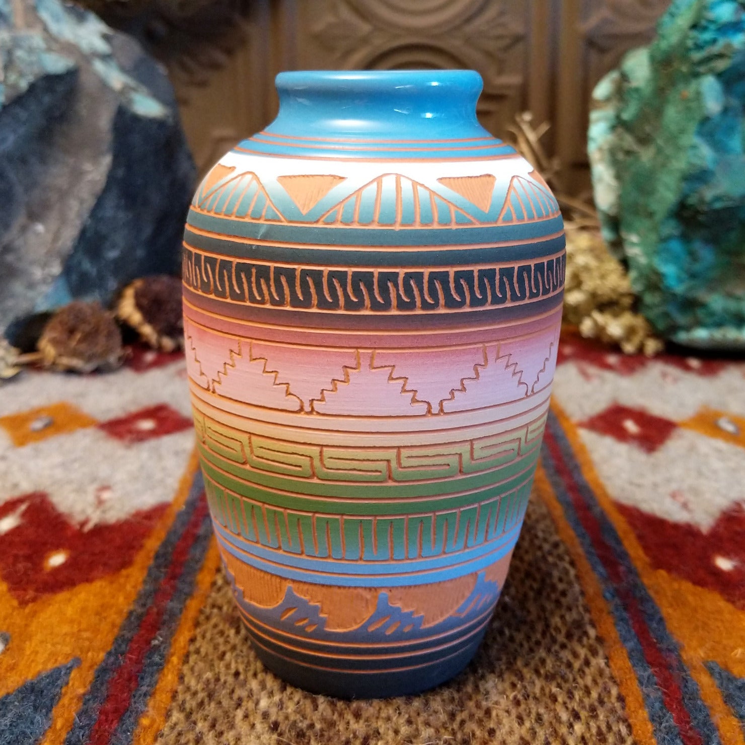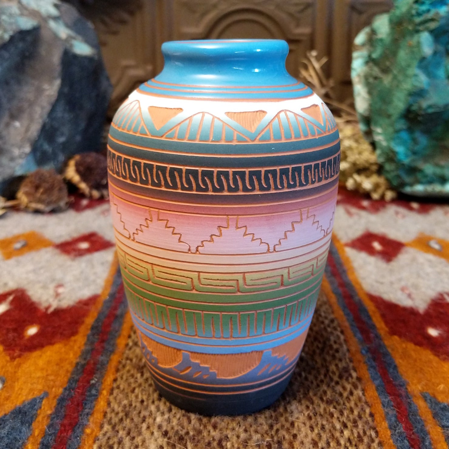 Handcrafted by Navajo artisan Arlene Bennett, this terracotta vessel showcases etched geometric patterns on the rainbow surface. The lip of the pot features a striking blue rim, making it a stunning southwestern decor piece.