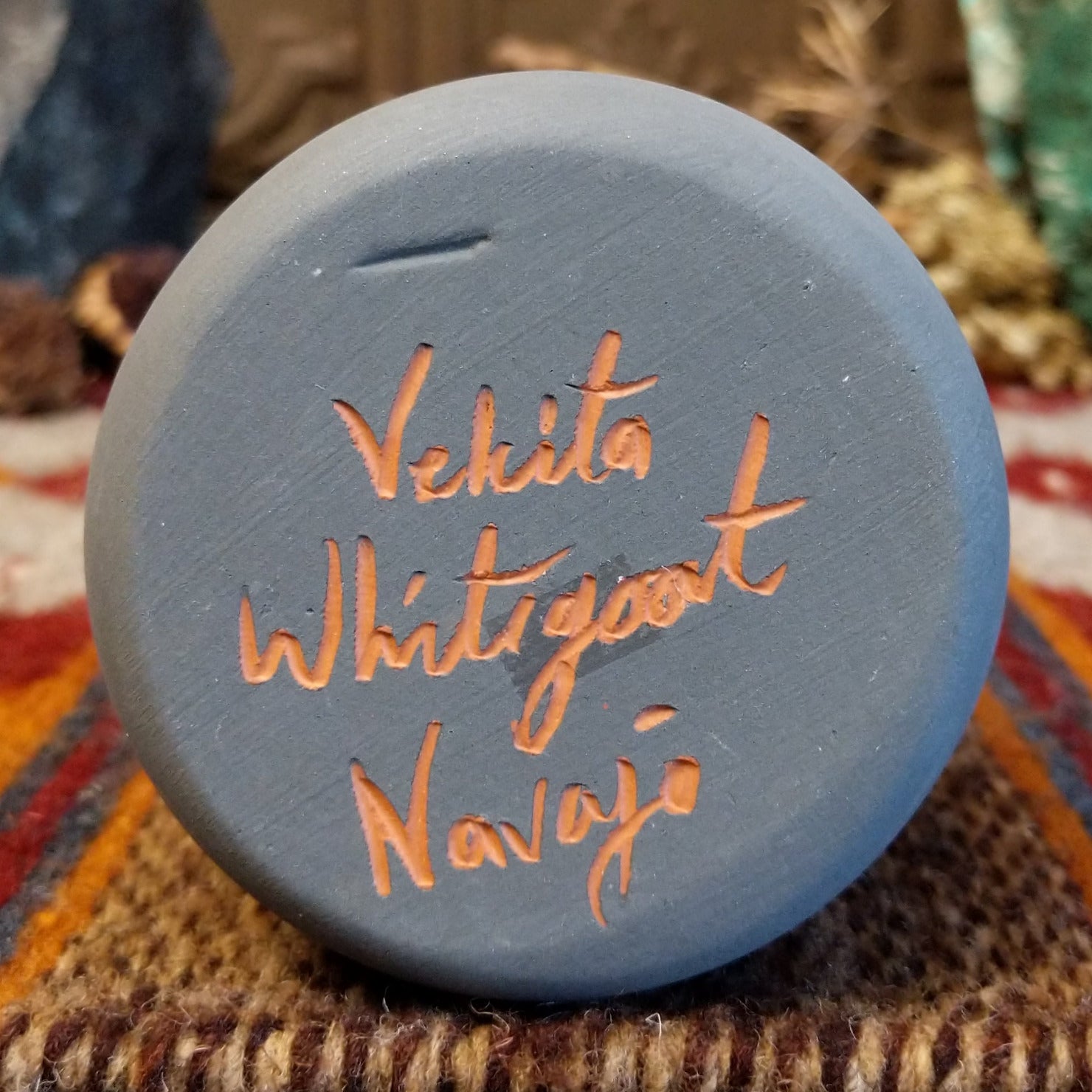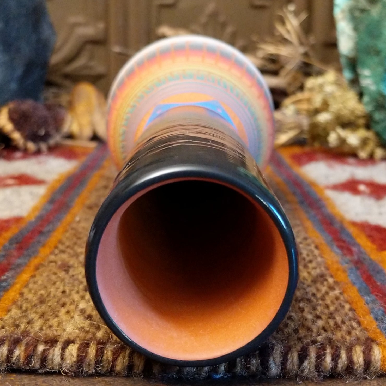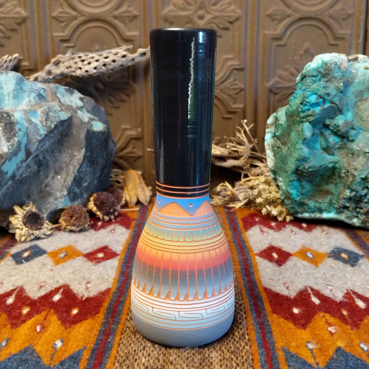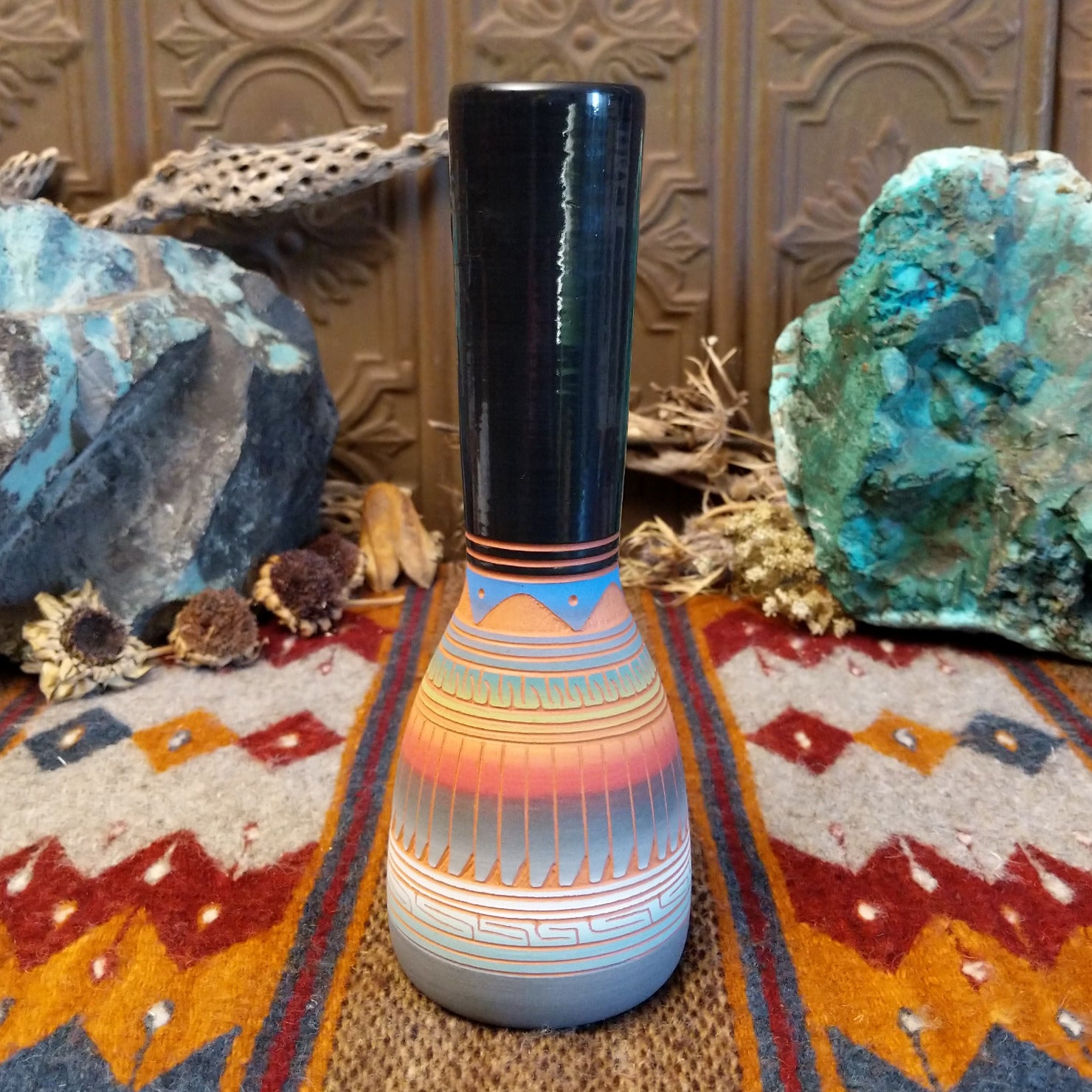 Crafted by Navajo artisan Velcita Whitegoat, this striking tall ceramic pottery piece showcases intricate geometric rainbow patterns on the surface. The long neck of the piece is glazed a deep blue, making it a stunning and unique decor piece for collectors.