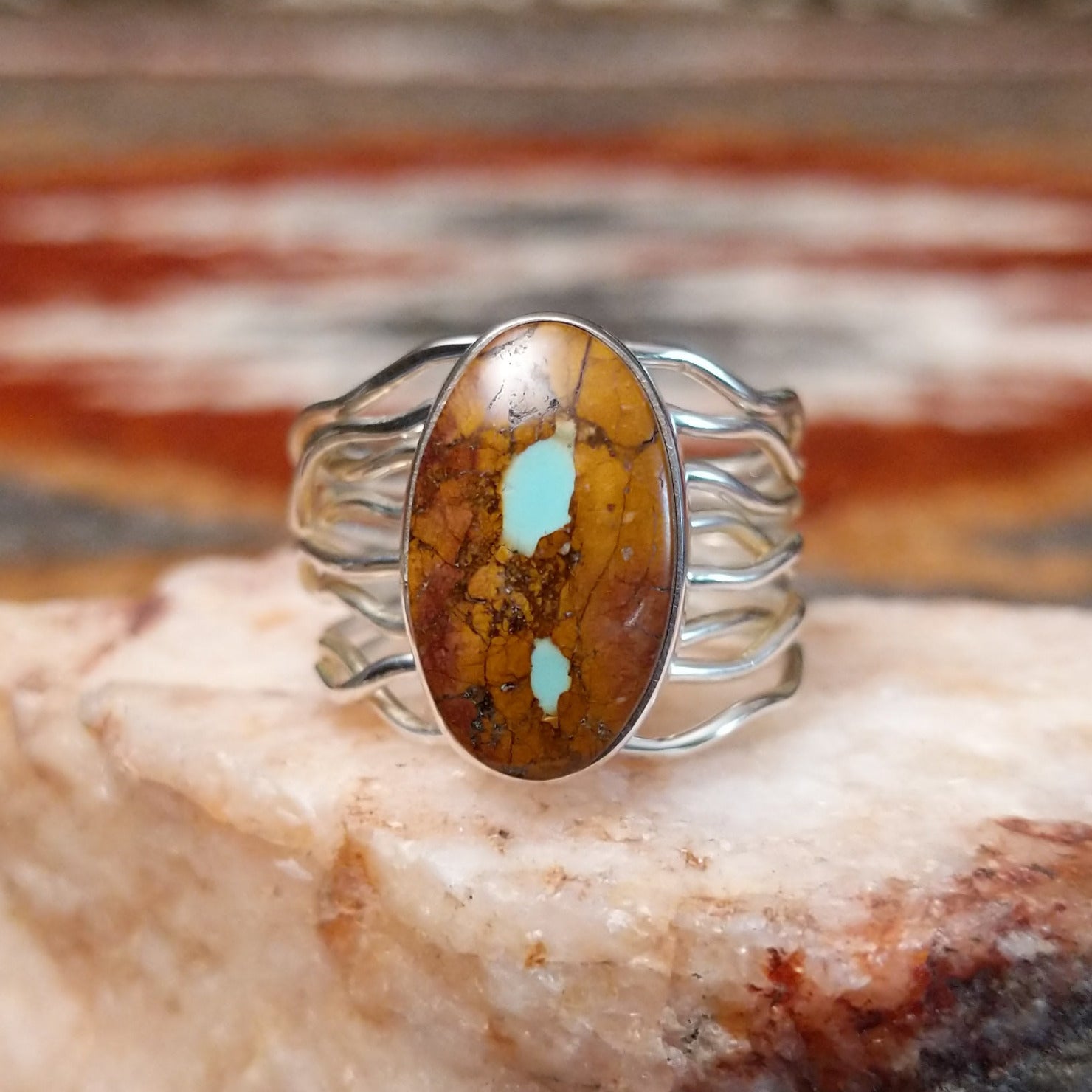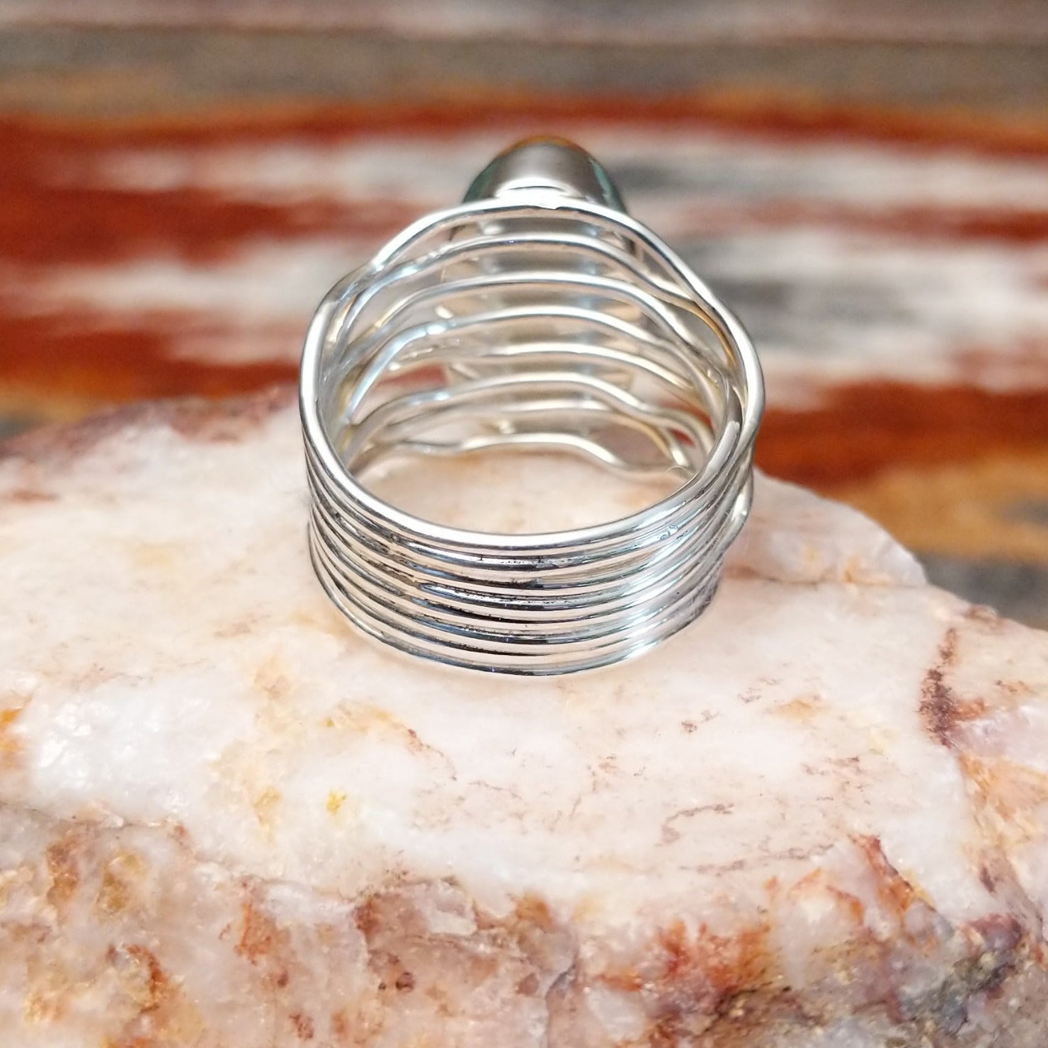 Crafted by renowned Navajo artisan Angela Martin, this sterling silver ring features an oval boulder turquoise stone set in the bezel. The band of the ring features a layered wire appearance, creating a beautiful accessory with the contrasting hues.