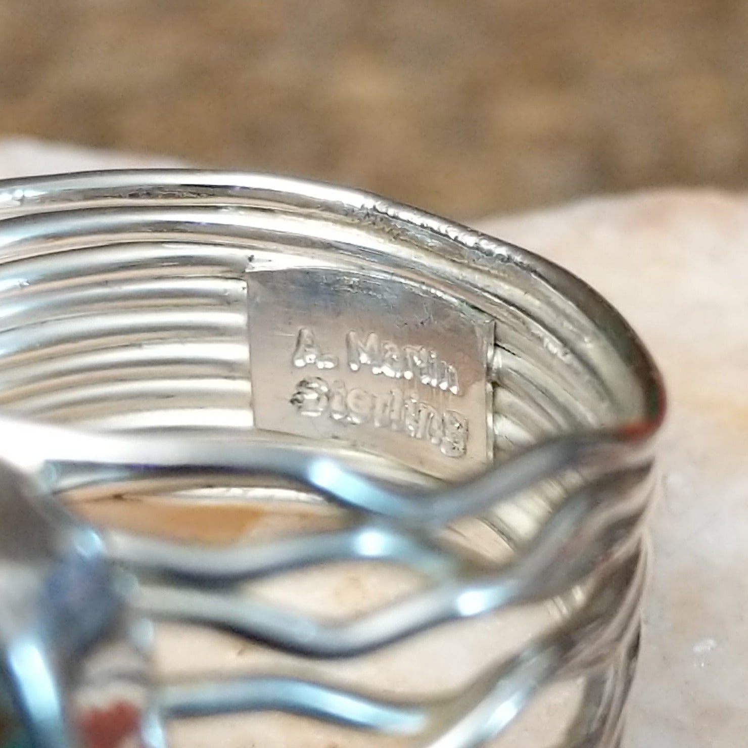 Crafted by Navajo artisan Angela Martin, this sterling silver ring features a large boulder turquoise set in a smooth bezel. The stone showcases intricate brown matrix with pops of turquoise hues, and the layered wire band creates a unique ensemble for this accessory.