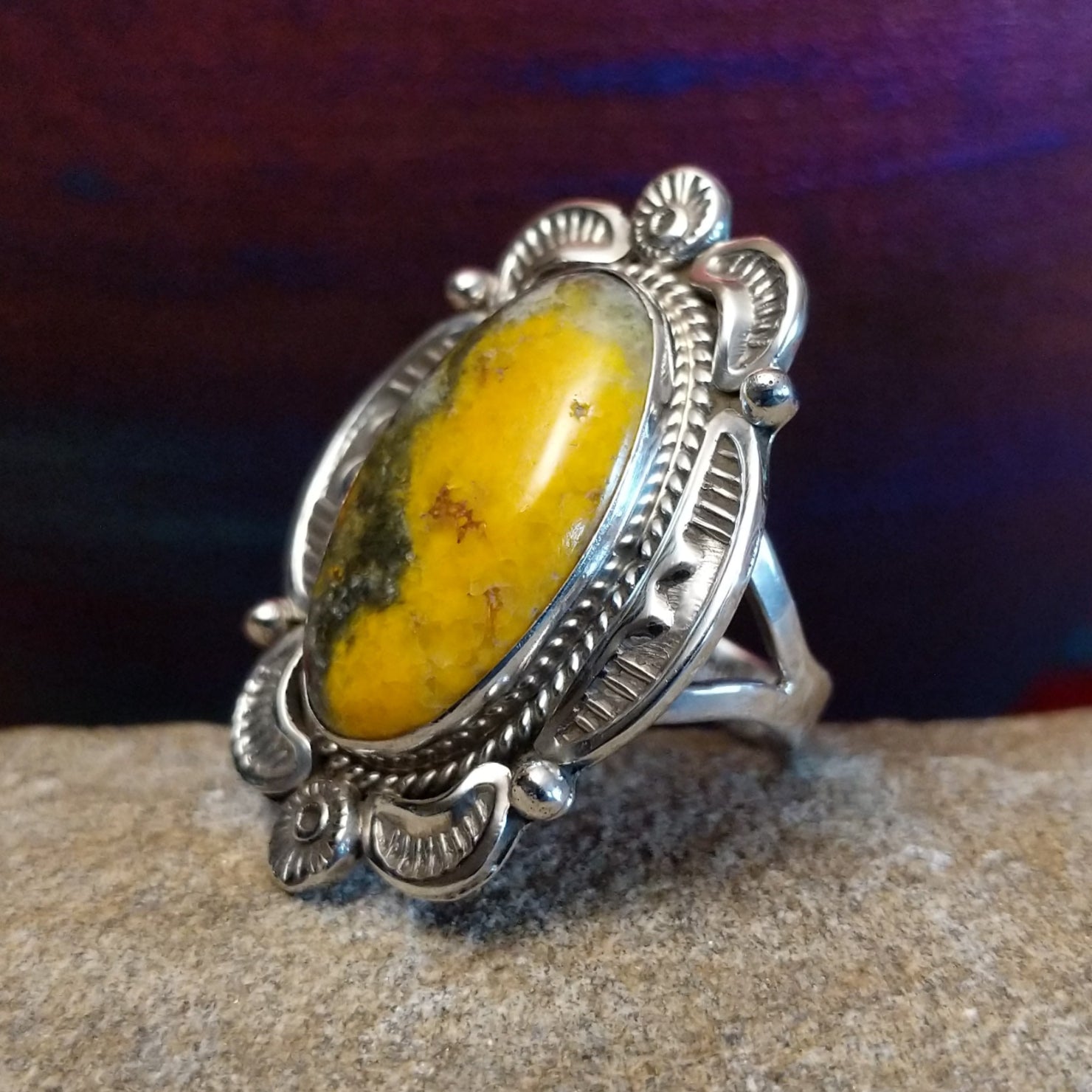 This captivating ring showcases an oval bumblebee jasper stone, its surface divided between vibrant yellow and a soft blend of gray and white. The colors meld seamlessly, creating a natural gradient. Surrounding the stone is an intricately stamped silver frame, adding depth and artistry to the design.