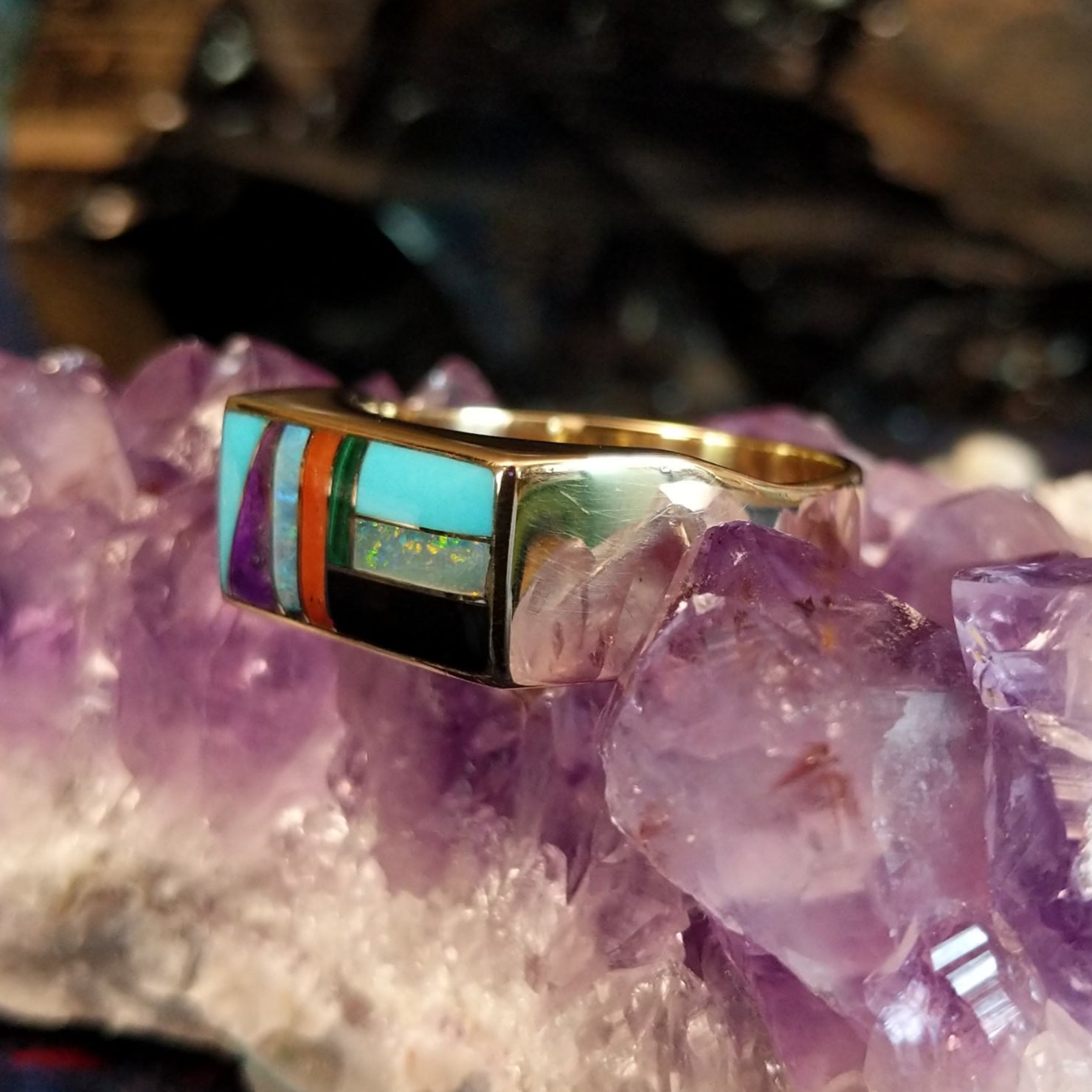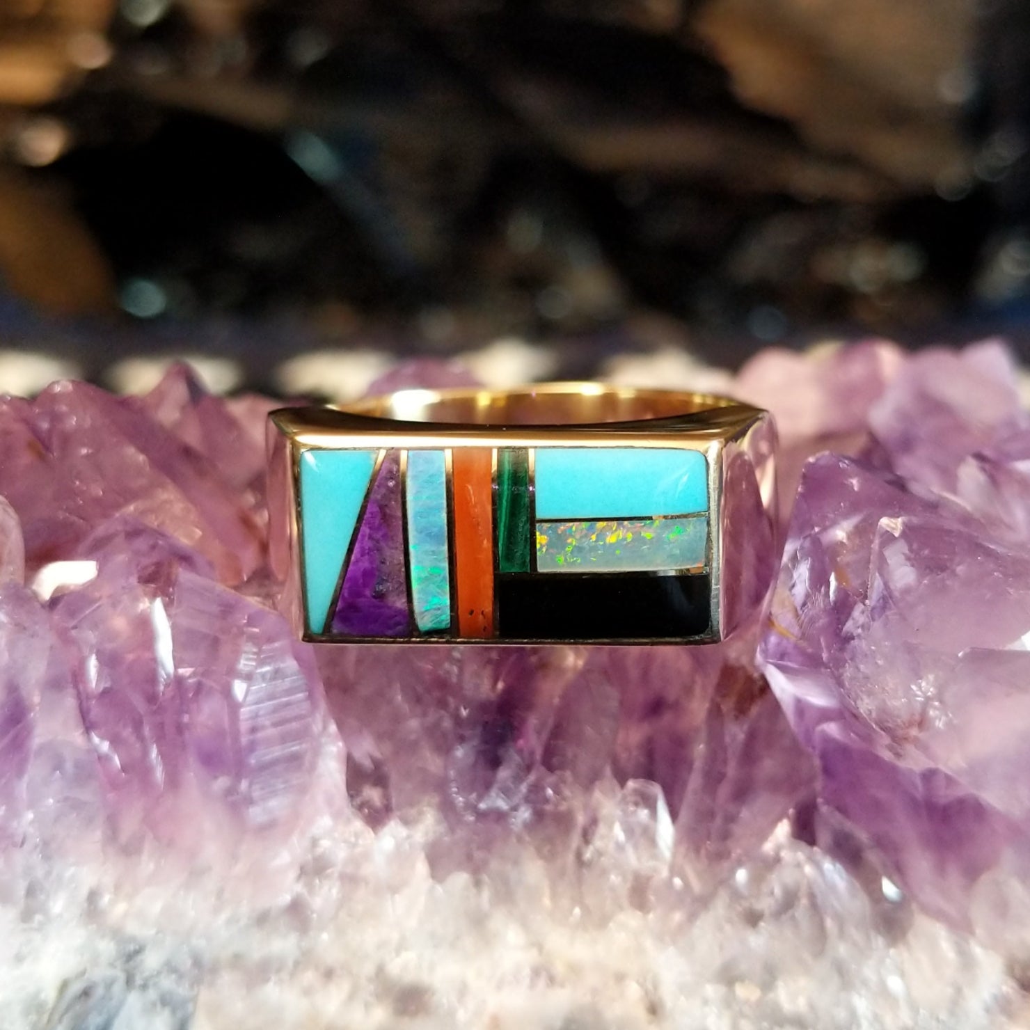This Navajo-made rectangular 14K gold inlay ring by Steve Francisco is a stunning display of Southwest artistry. Featuring a rectangular design with turquoise and other various stones inlaid in bold geometric patterns, this ring is both eye-catching and elegant.