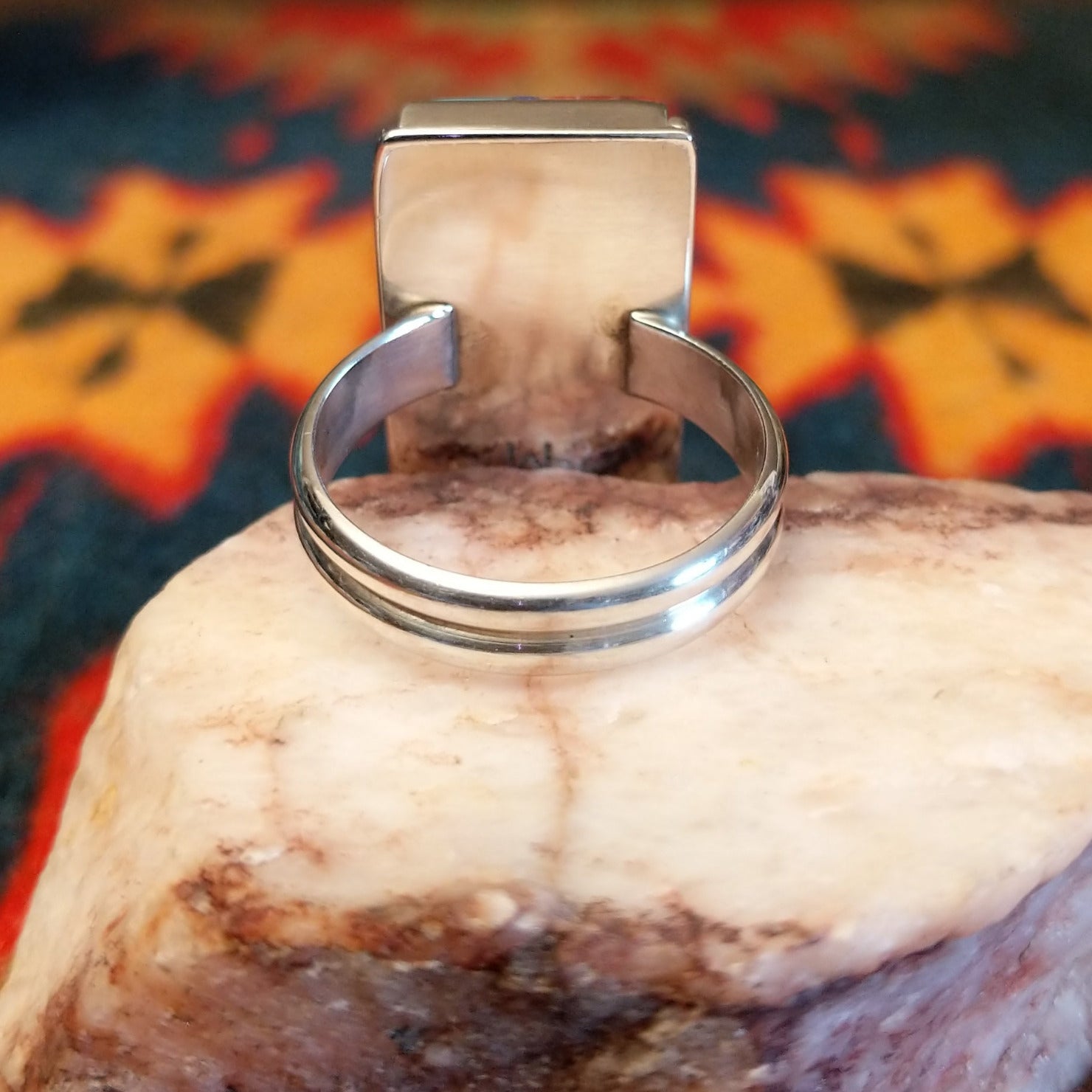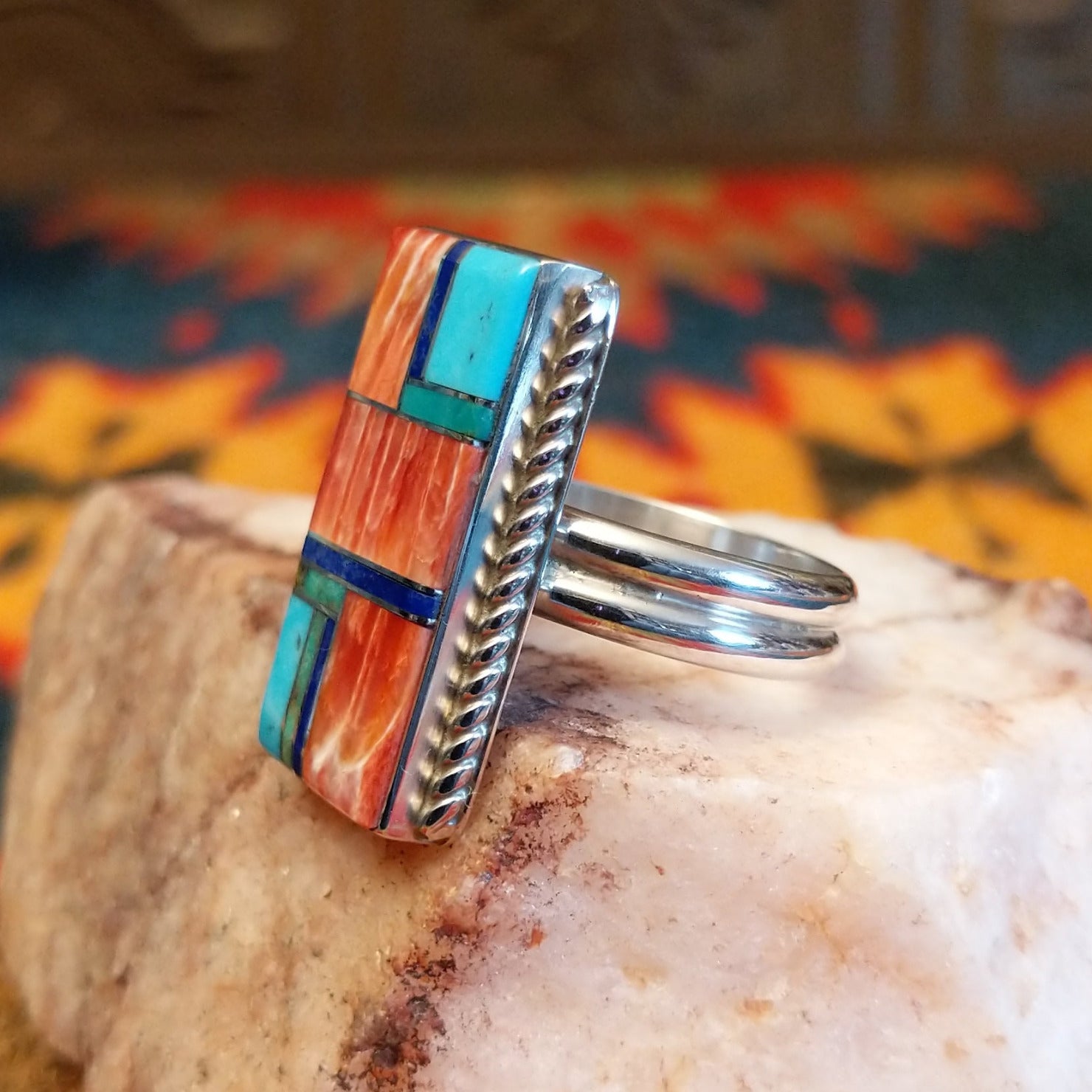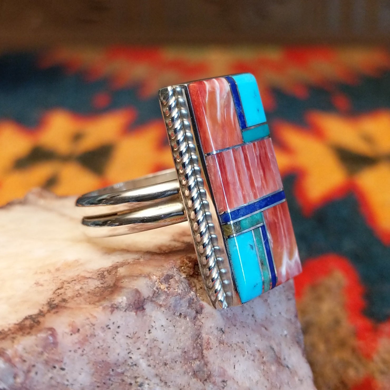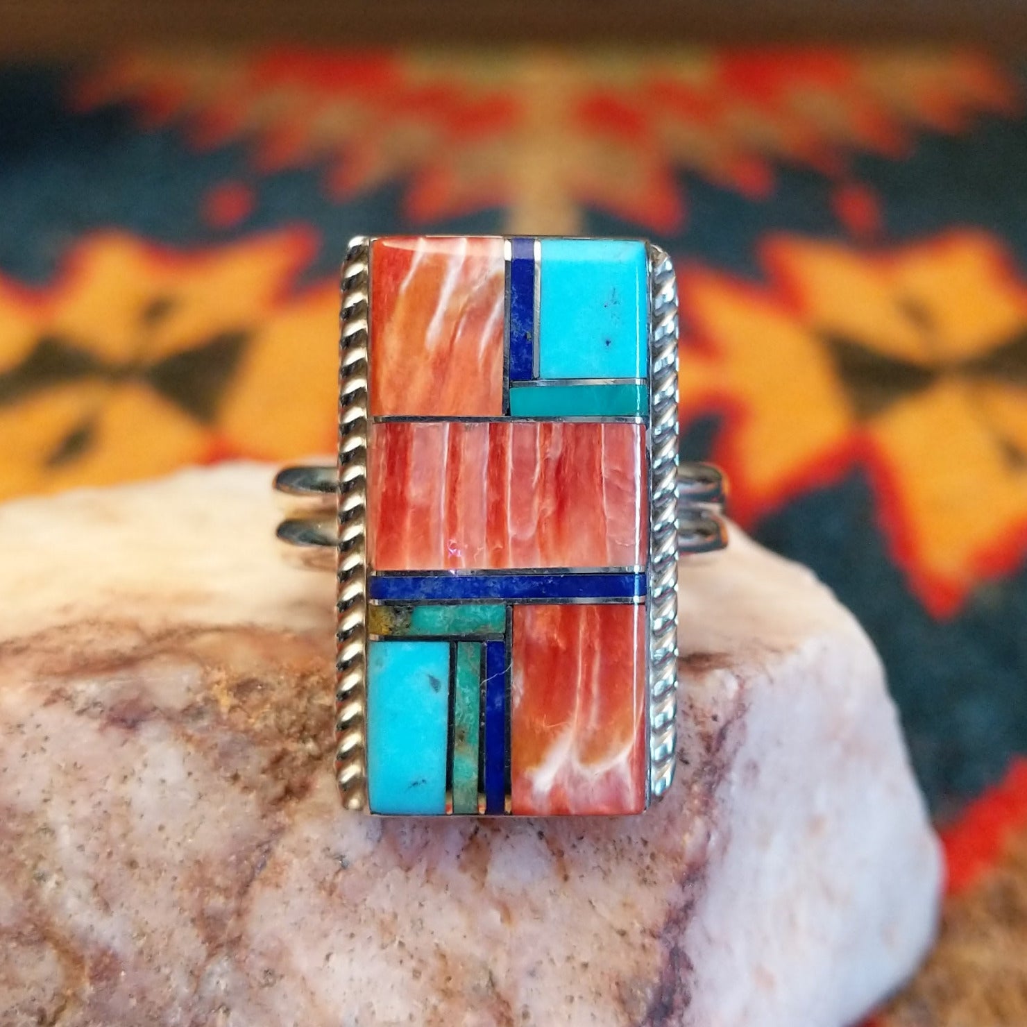 This bold size 10 ring by Wilbert Grey showcases a stunning geometric inlay design set in sterling silver. The rectangular face features a striking mosaic of vibrant stones, including rich red and orange spiney oyster shell, bright turquoise, and deep blue lapis, carefully arranged in a clean, architectural pattern.