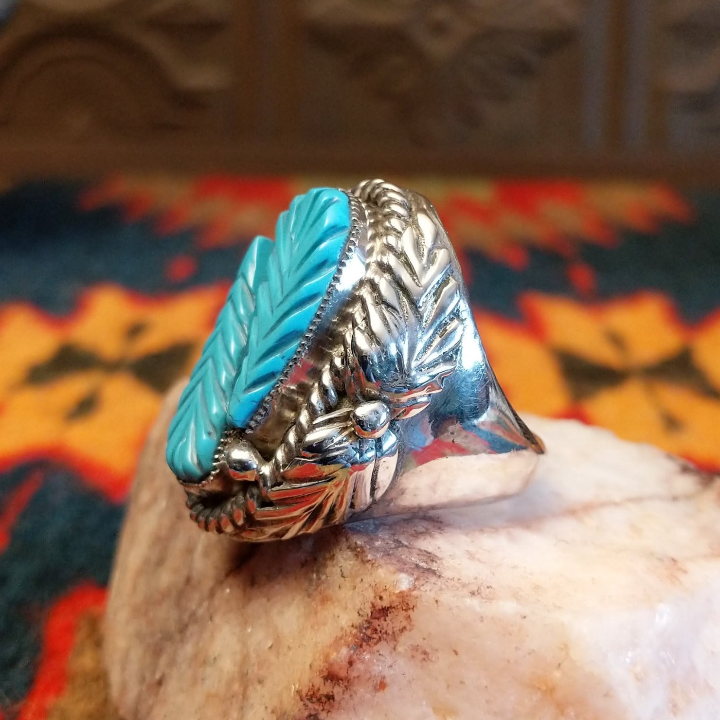 This striking size 9.75 Navajo ring, set in Sterling Silver, features a beautifully carved turquoise centerpiece set in sterling silver. The oval stone is expertly hand-etched with a detailed feather motif, creating depth and movement across the vibrant blue surface. A sleek silver divider adds dimension, enhancing the natural symmetry of the design.