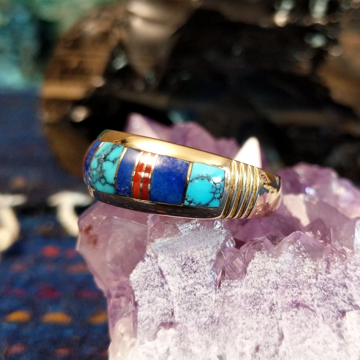 This Navajo-made multi-stone 14K gold inlay ring showcases the bold elegance of traditional stonework set in luxurious gold. Turquoise with spiderweb matrix, deep lapis lazuli, and vibrant red coral are precisely inlaid in a striking pattern that reflects the Southwest’s natural colors and textures.