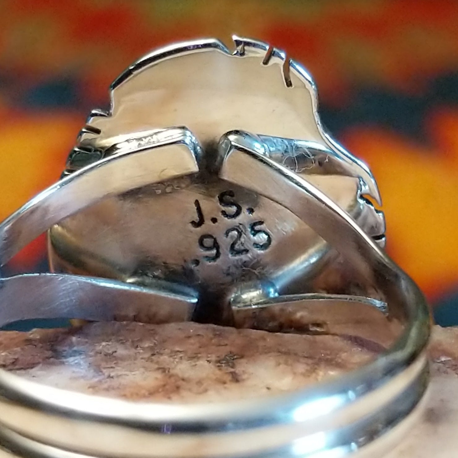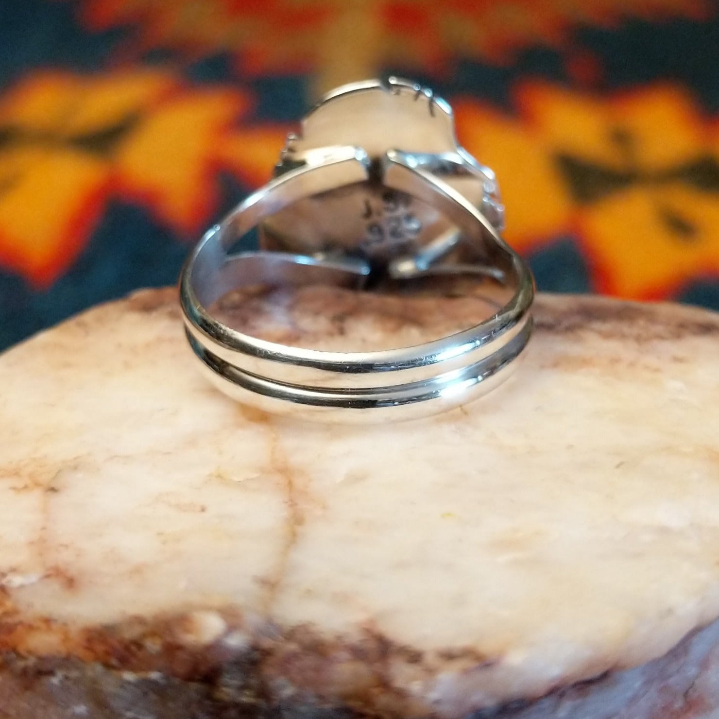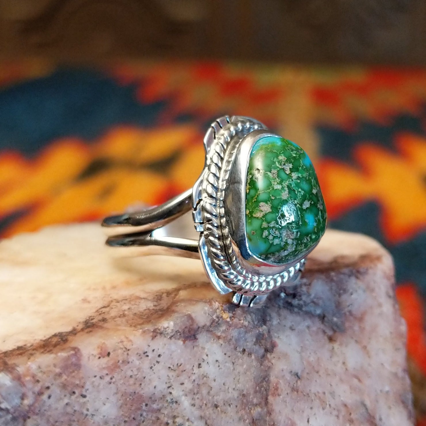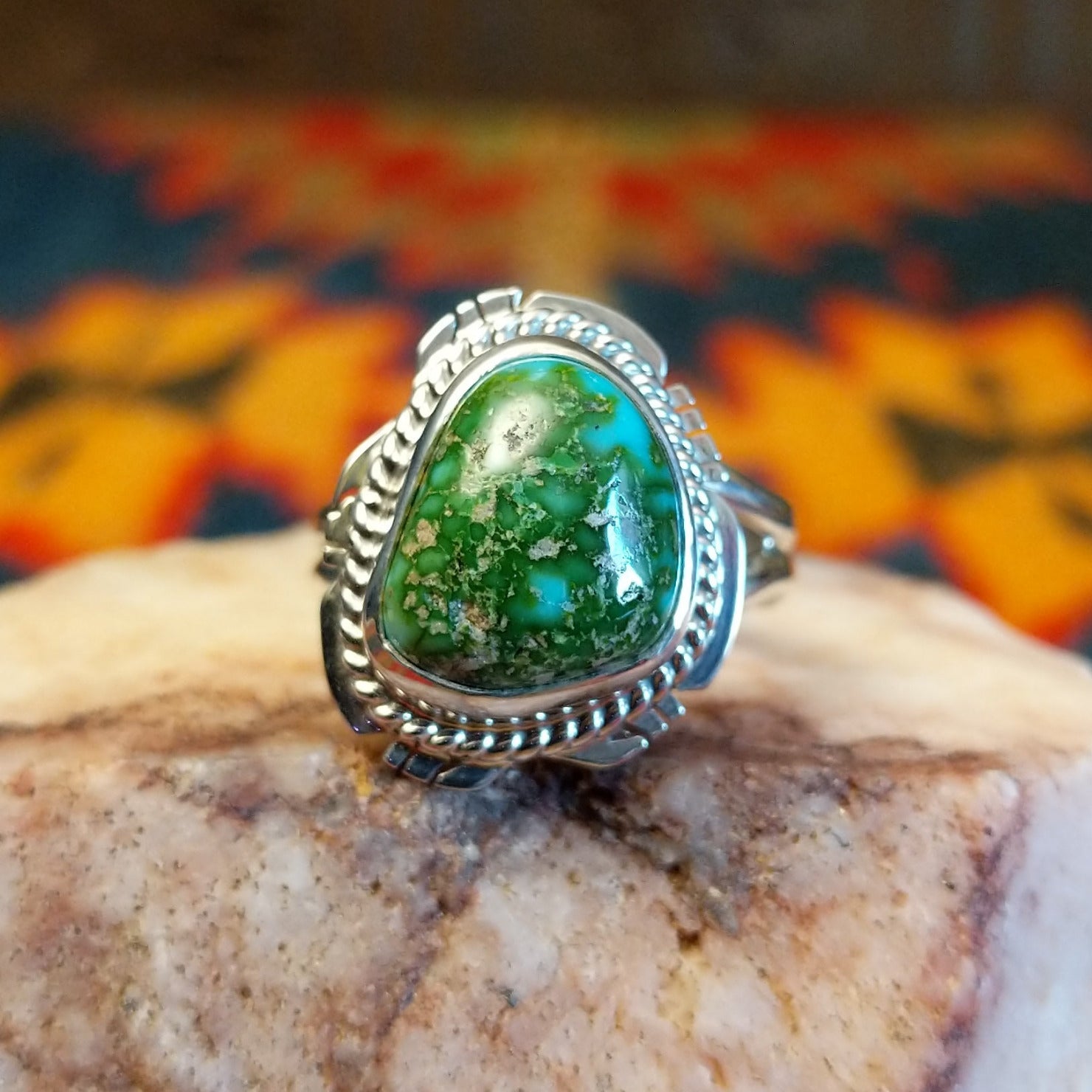 A stunning handcrafted Navajo ring featuring a Sonoran Gold Turquoise stone set in etched sterling silver, with a classic rope design. Made by Jake Sampson, this ring is size 8 and highlights the natural blend of turquoise and golden matrix tones. A simple yet striking Southwestern ring that lets the natural Sonoran Gold Turquoise stand out.