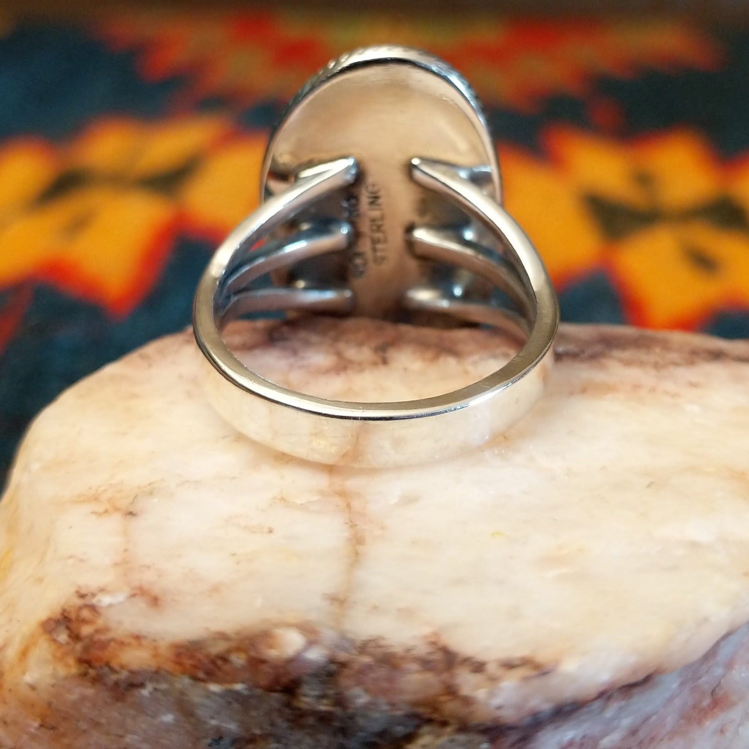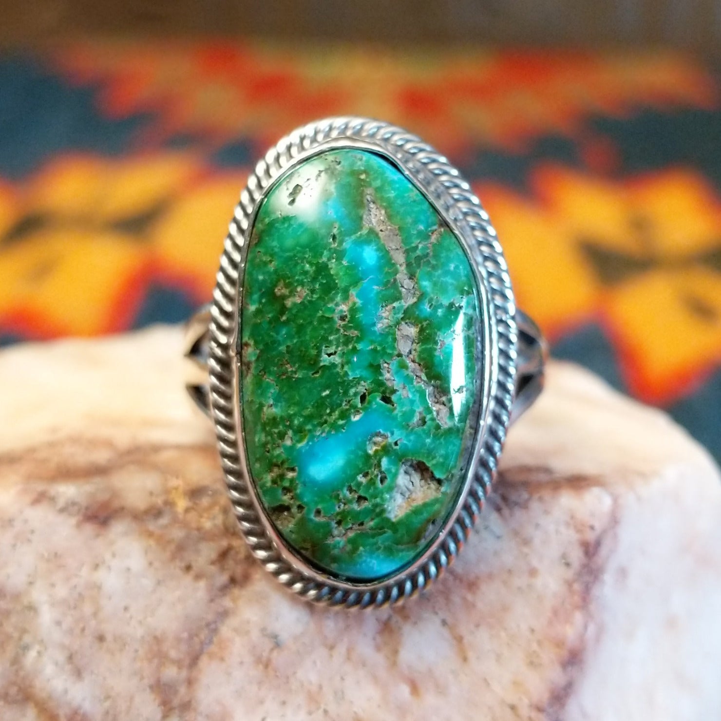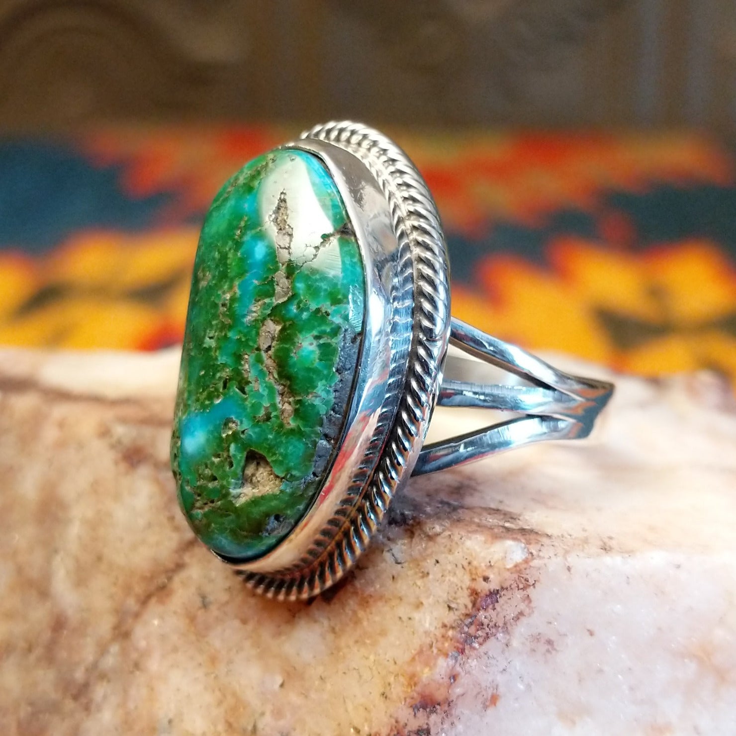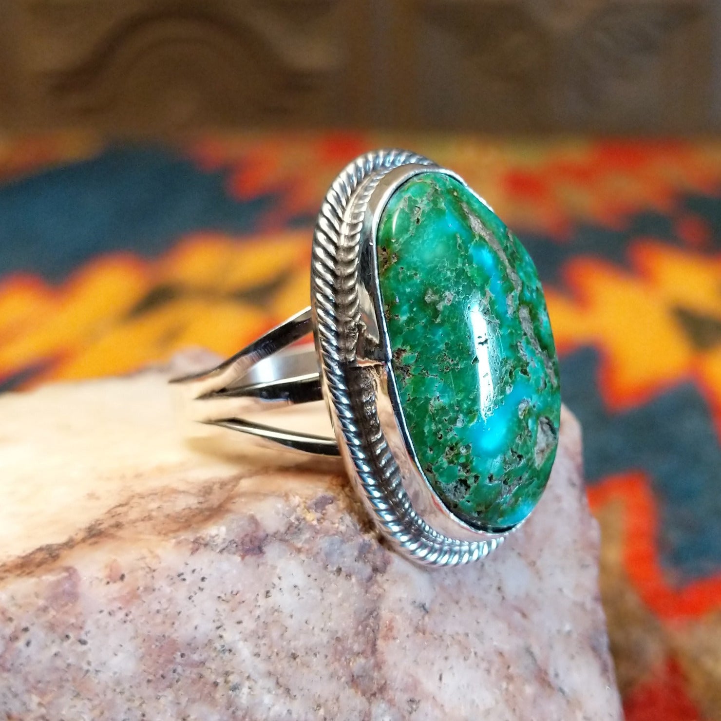 This stunning handcrafted Navajo ring features a genuine Sonoran Gold Turquoise stone set in a classic trifurcate sterling silver band. Made by Roie Jaque, this ring is size 10 and highlights the natural turquoise and golden matrix tones. A bold yet timeless Southwestern design that allows the natural beauty of Sonoran Gold Turquoise to take center stage.