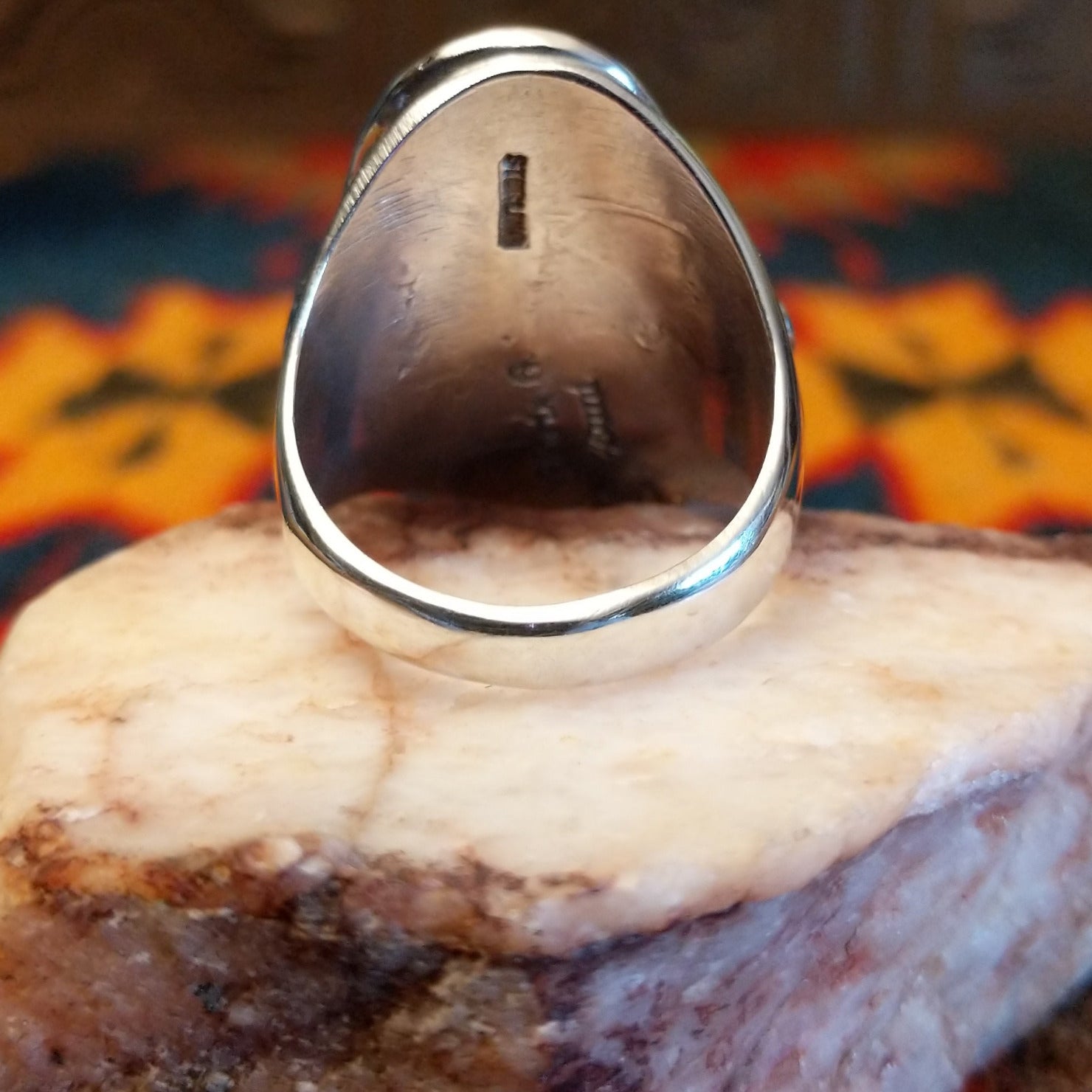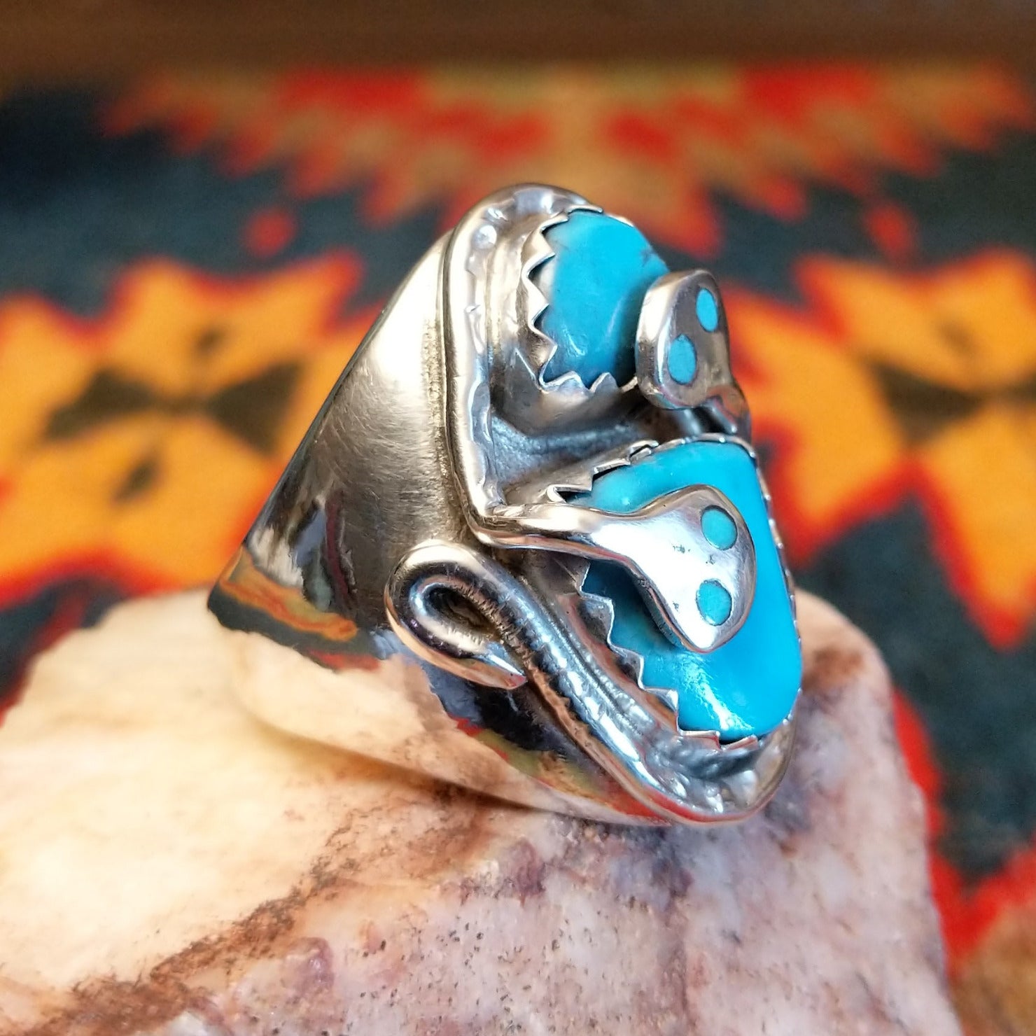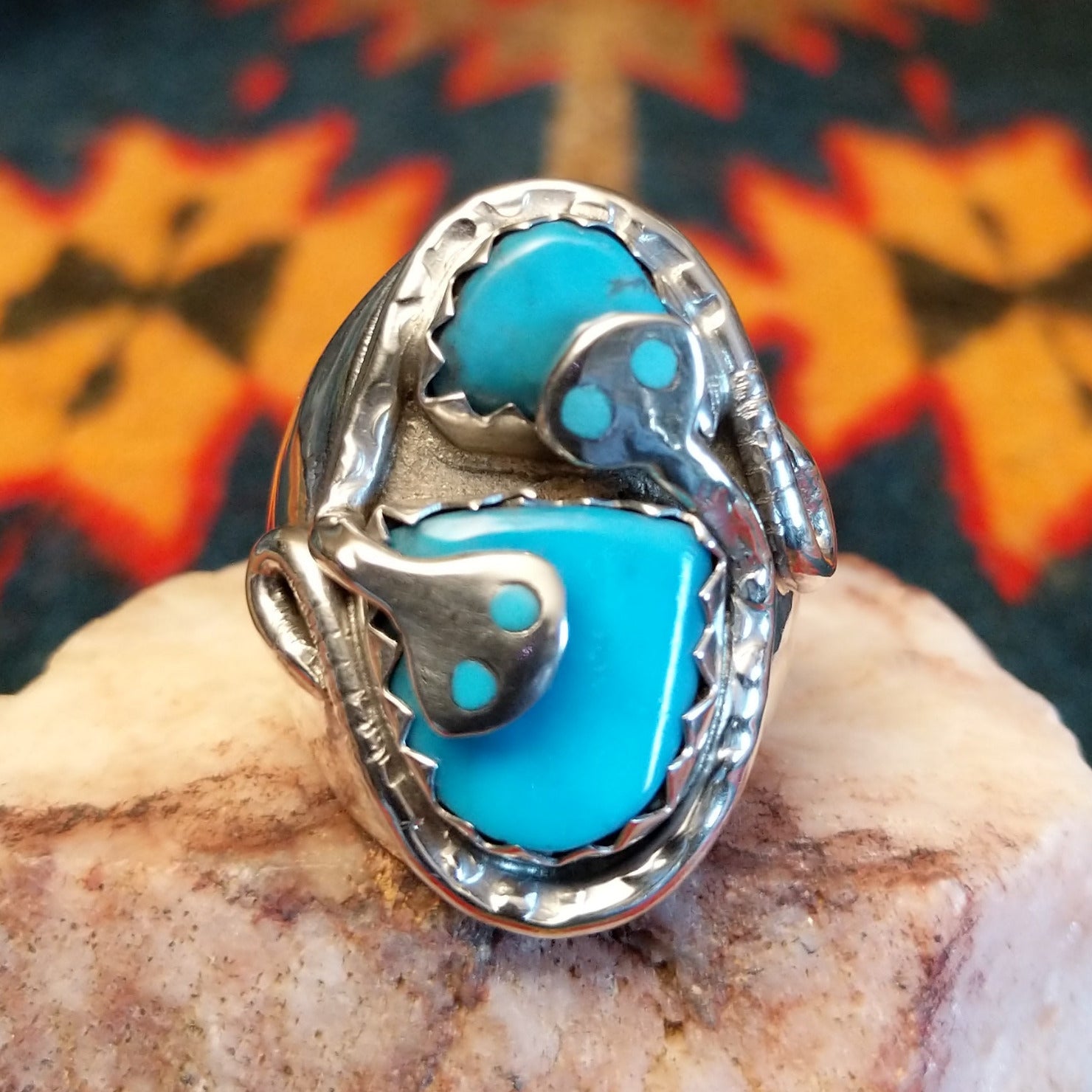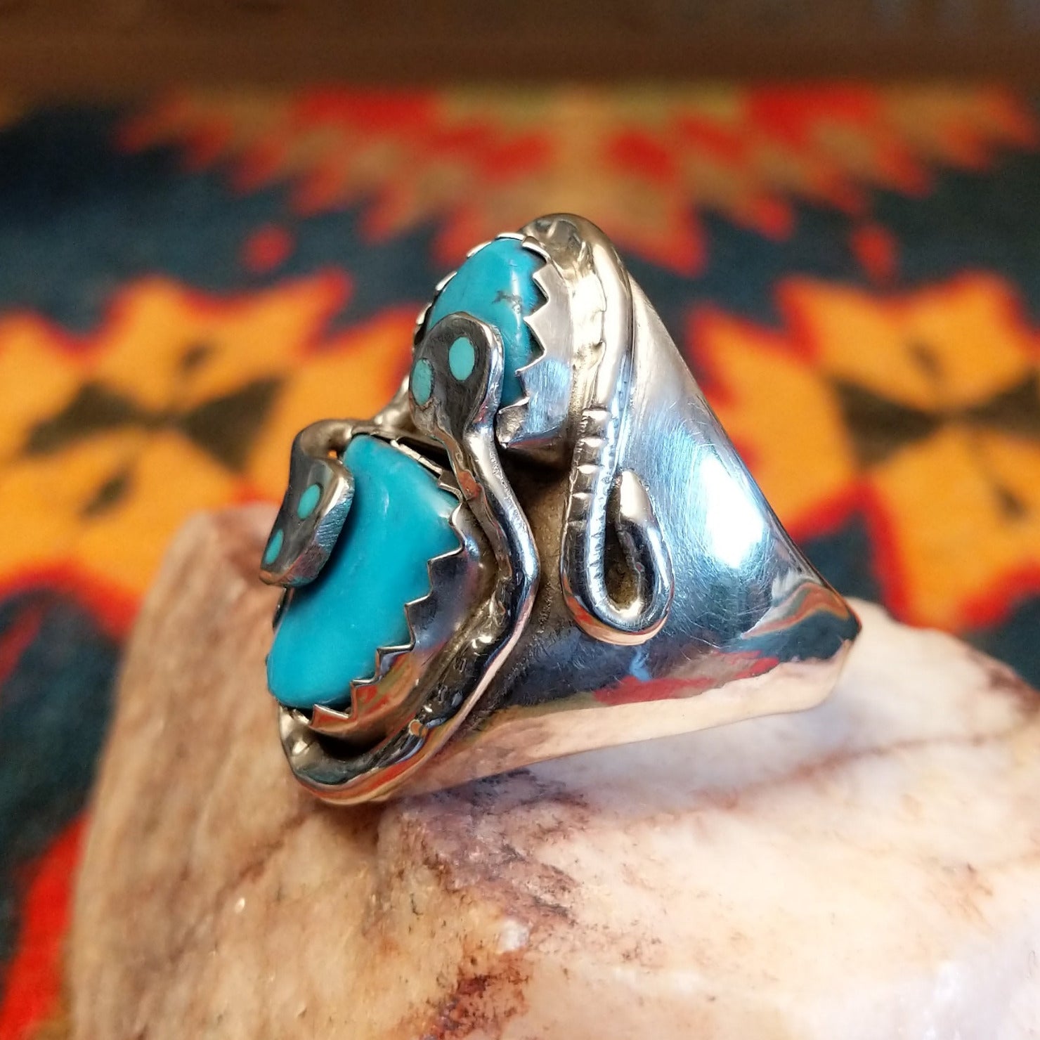 This powerful size 12 ring by Gloria G., daughter of Effie Calavaza, beautifully carries on the iconic Zuni snake design tradition. Crafted in sterling silver, the ring features two vibrant turquoise stones set in serrated bezels, wrapped by intricately detailed silver snakes, symbolizing protection and spiritual strength. Rich in heritage and craftsmanship, this ring is a striking example of Gloria G.’s artistry and her continuation of her mother’s celebrated legacy.