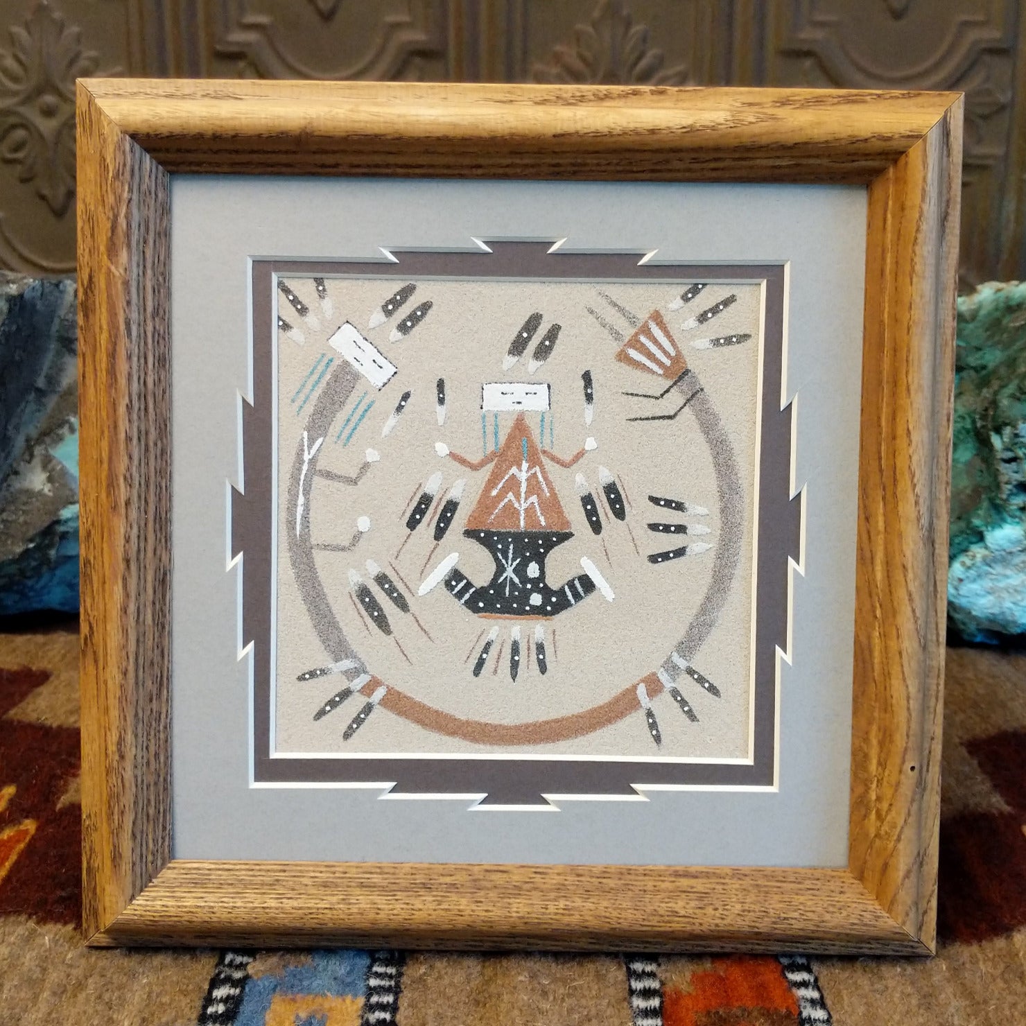 The sand painting by artisan Nephi Benally features a central figure that embodies both Father Sky and Mother Earth, with stars creating the lower half and a corn plant crowning the top. A guardian figure surrounds the composition’s outer edge, all set within a wooden frame, highlighting the artisan's craftsmanship.