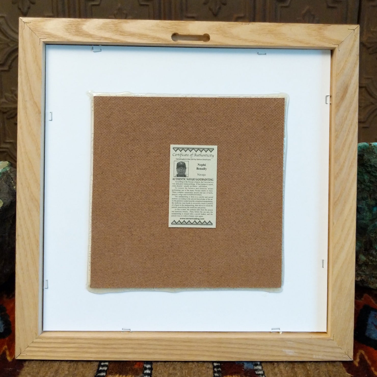 This sand painting by Navajo artisan Nephi Benally features two Yei figures in carefully layered multicolored sands, symbolizing spiritual mediators within Navajo culture. Set within a wooden frame, the piece showcases the artisan's skilled craftsmanship.