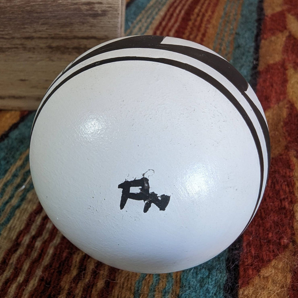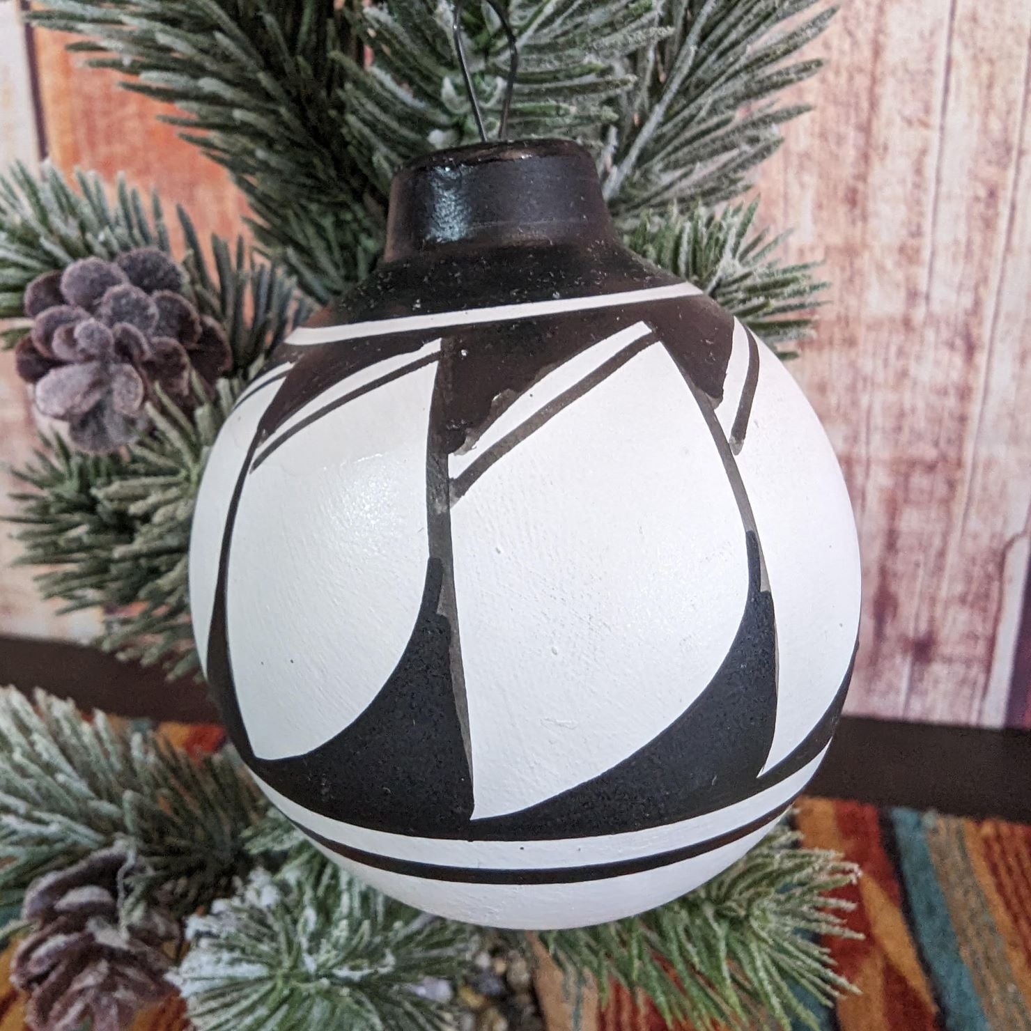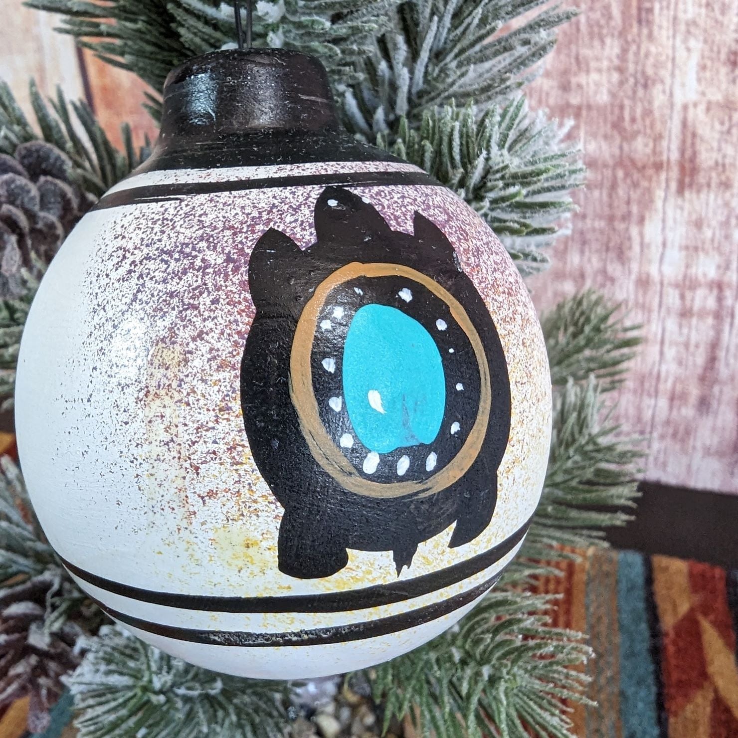 This Native American made Ornament is made out of white painted ceramic with various colored paint on top depicting a majestic turtle with a turquoise shell on one side and a unique design on the other. This piece is a charming addition to any holiday collection.