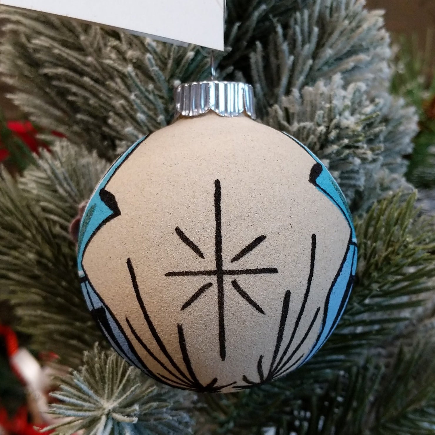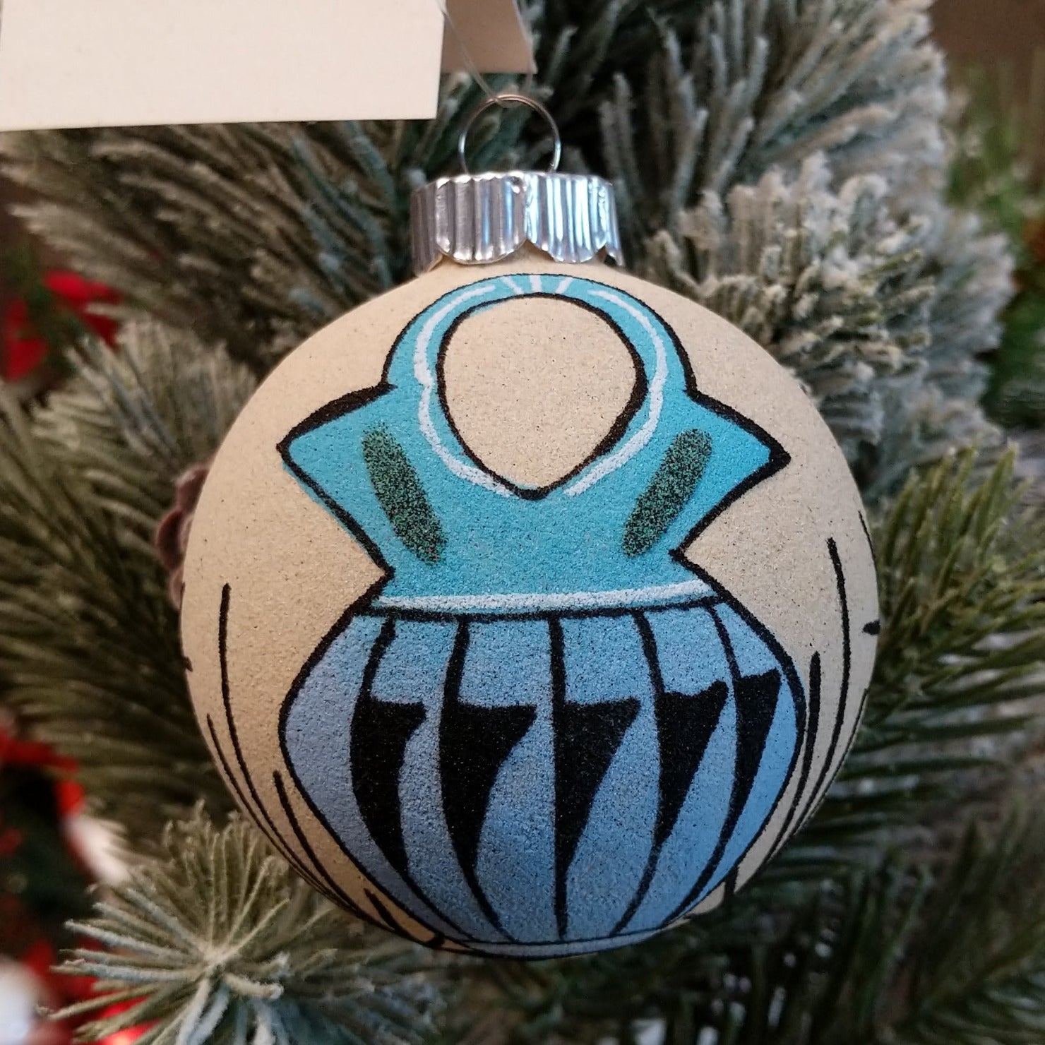 This Navajo made and handcrafted ornament features a sand painted wedding vase in stunning blue pigments. The vibrant design and dual sided piece make it a perfect southwestern or holiday decor piece.