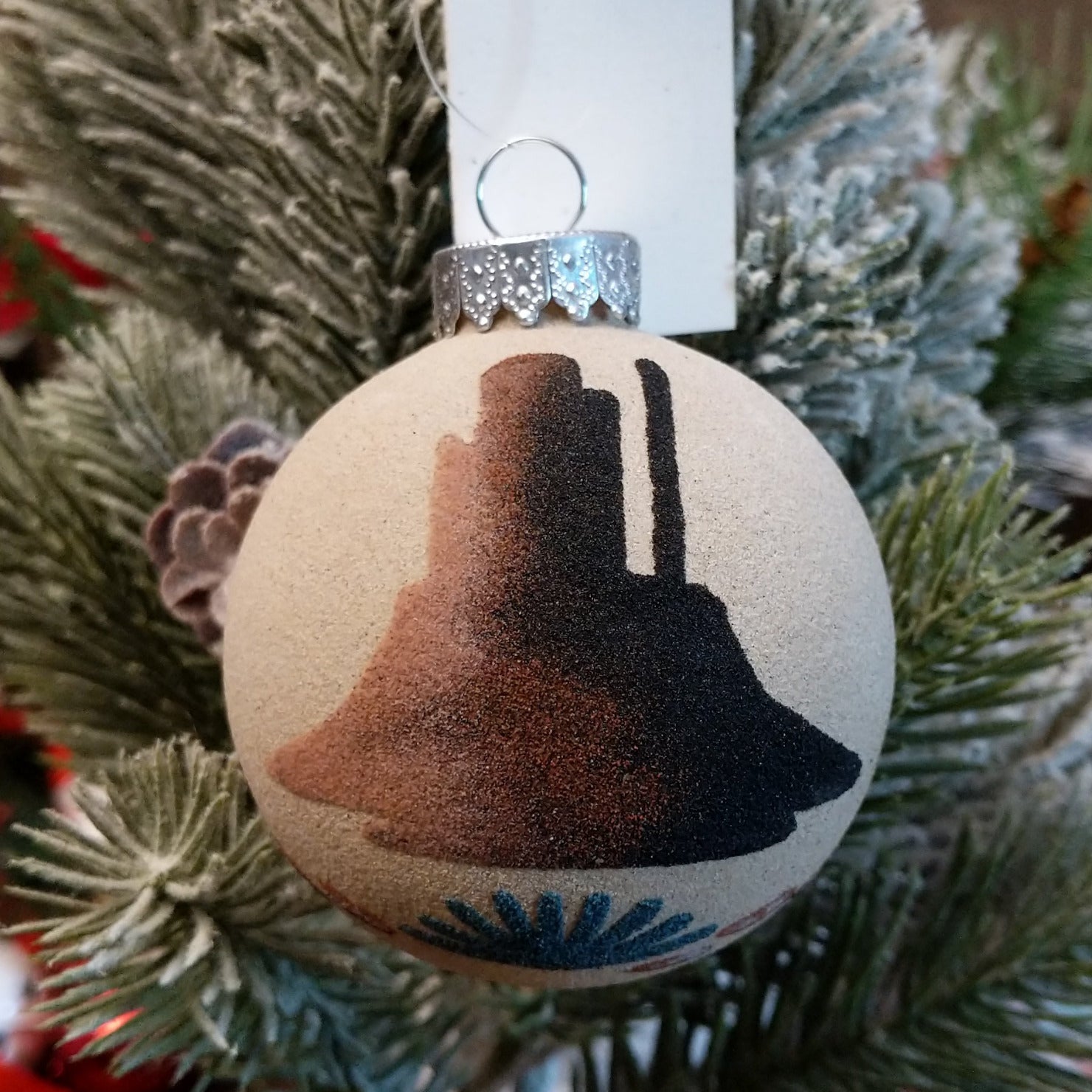 This Navajo made dual-sided sand painting ornament presents the Hunchback Yei figure on one face and a striking desert mountain on the reverse. A unique collector's piece, it's a perfect seasonal or year-round decoration.