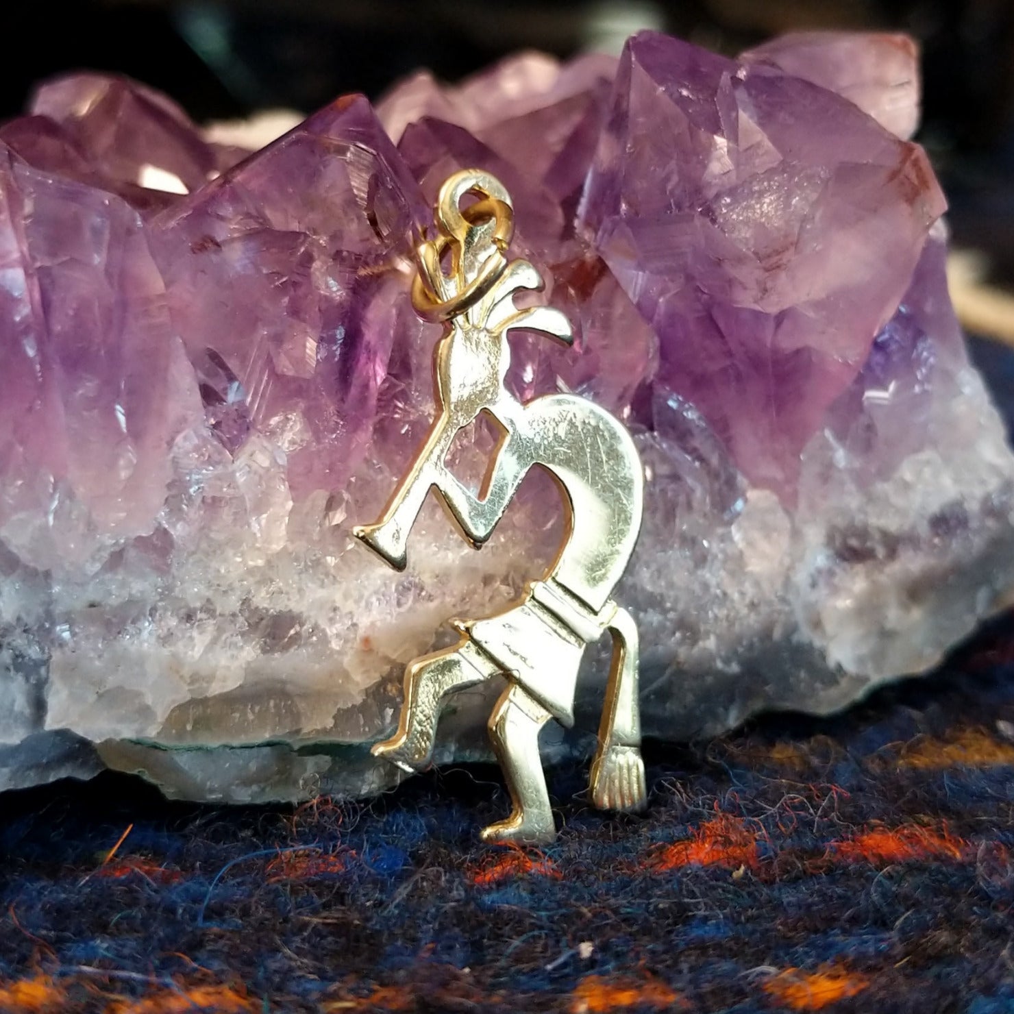 This pendant captures the spirit of Native American tradition with a 14k gold Kokopelli figure, symbolizing fertility and music in Southwest culture. The intricate design features a flute-playing figure with flowing lines, showcasing its stunning artistry.