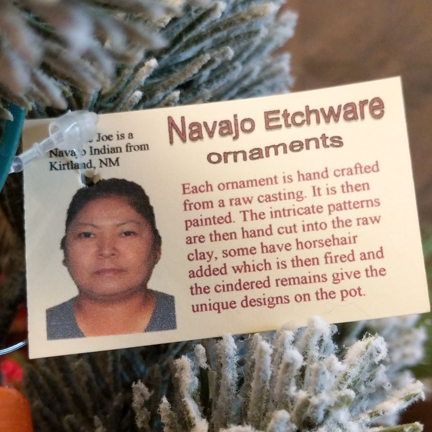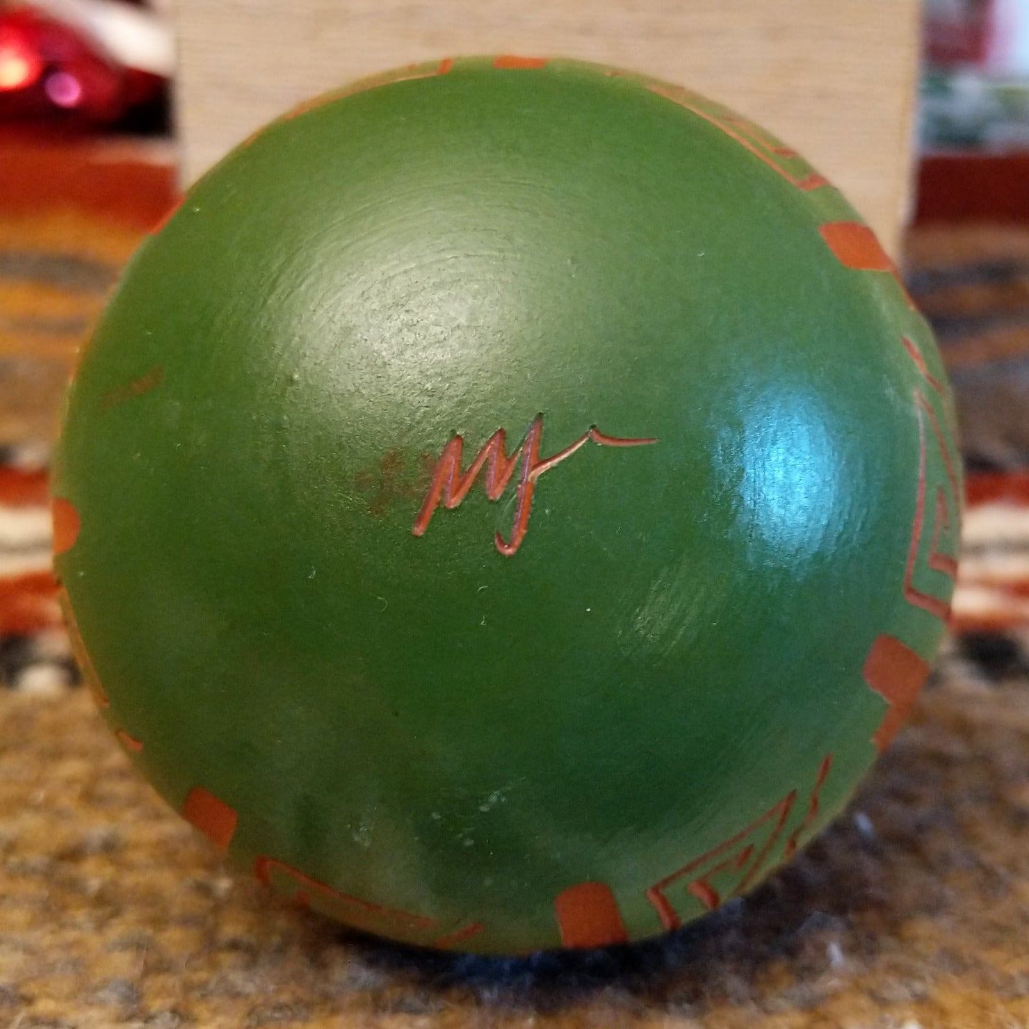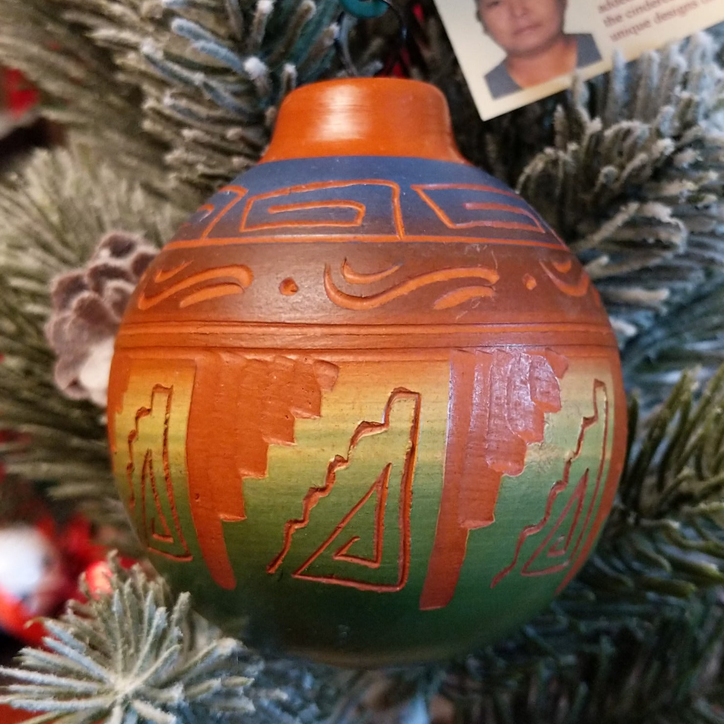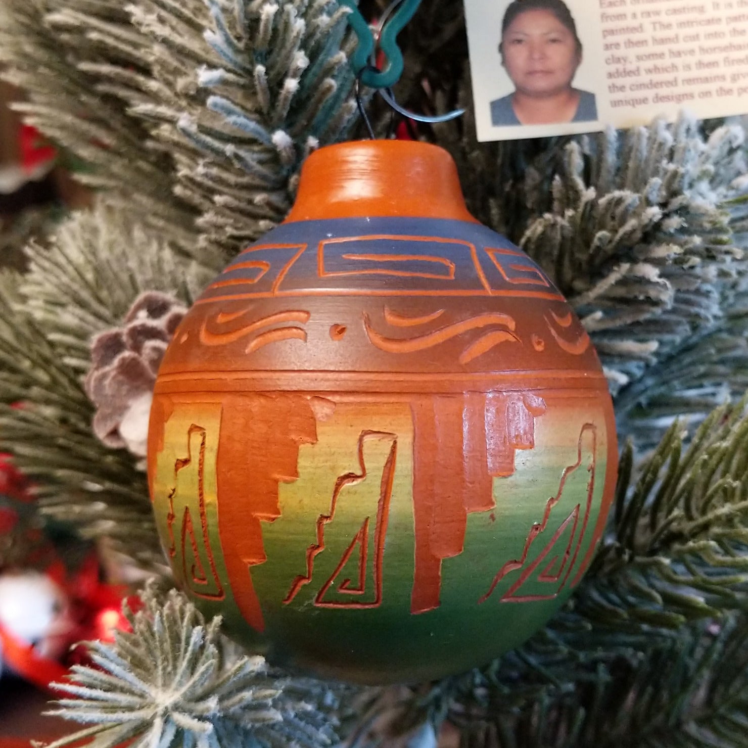 This ornament by Navajo artisan Marjorie Joe features terracotta pottery with a gradients of vibrant colors and geometric designs. Each piece is uniquely transformed through the firing process, making it a stunning art piece for seasonal decor or year-round display.