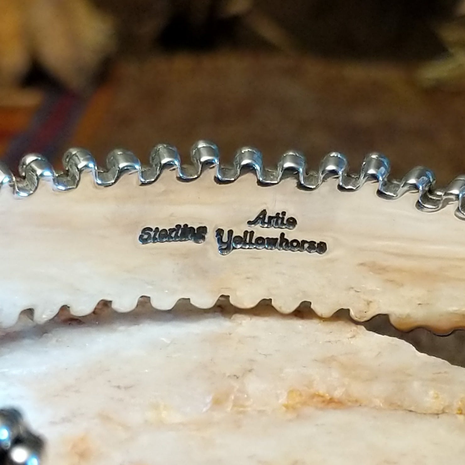 Handcrafted sterling silver cuff bracelet by renowned Navajo artisan Artie Yellowhorse, featuring dotted surface detailing. The classic cuff design offers comfortable wear and timeless appeal, perfect as a statement piece or for casual wear.