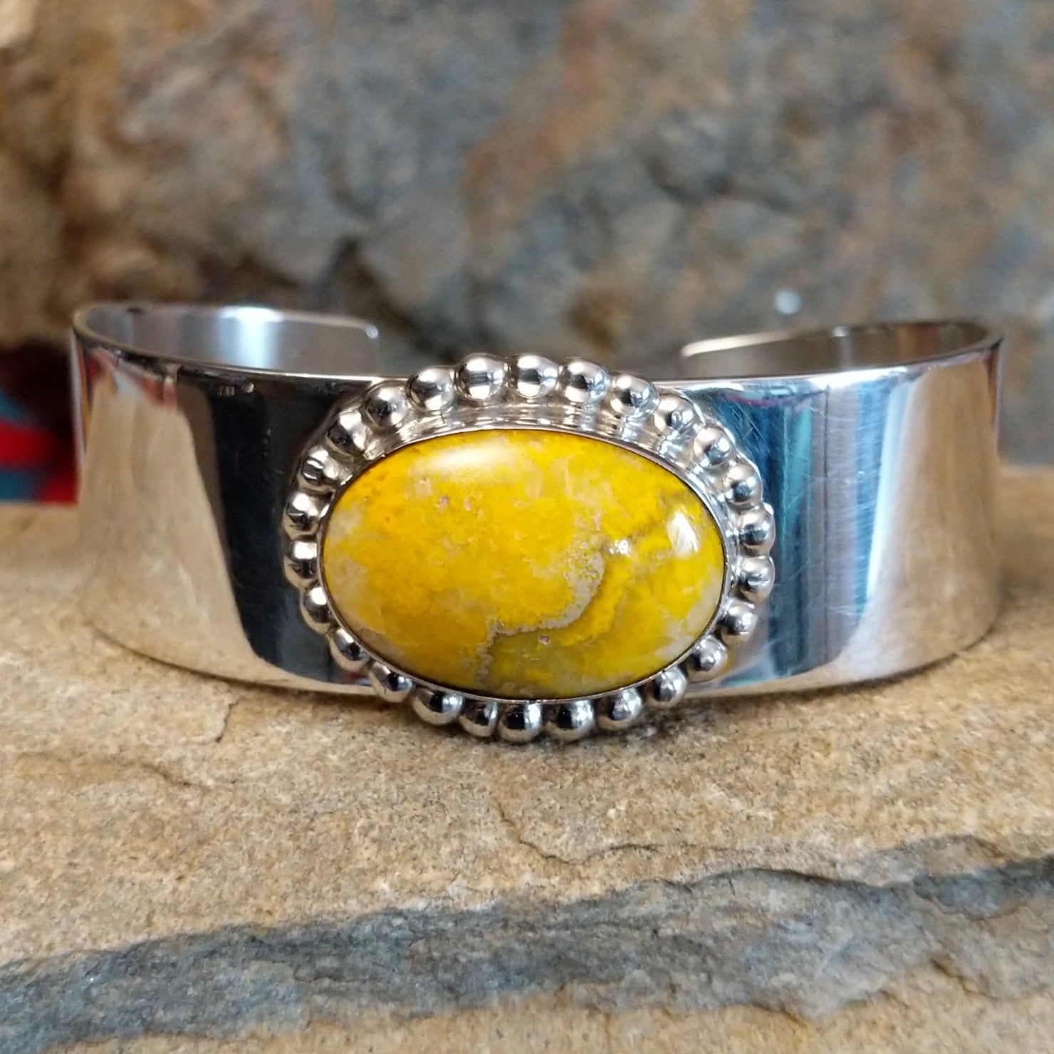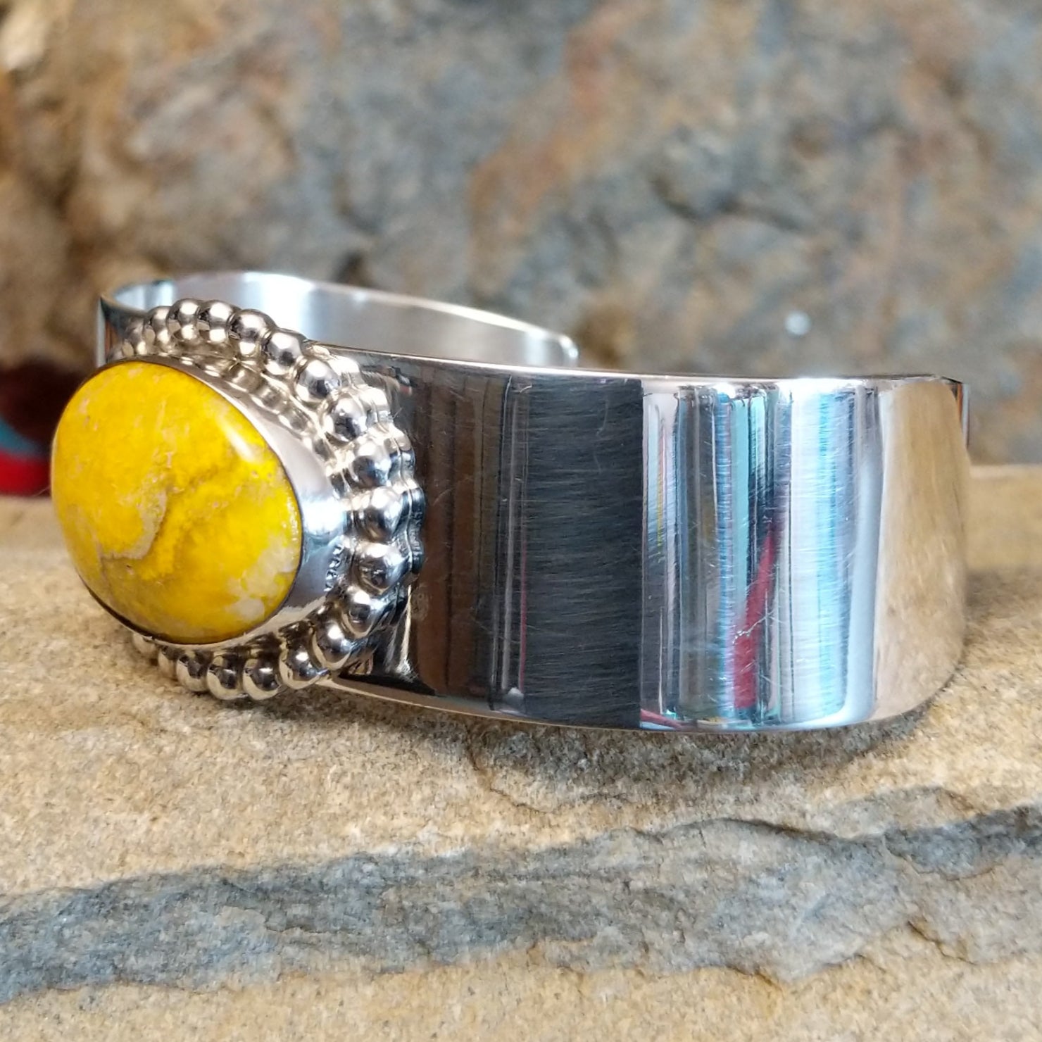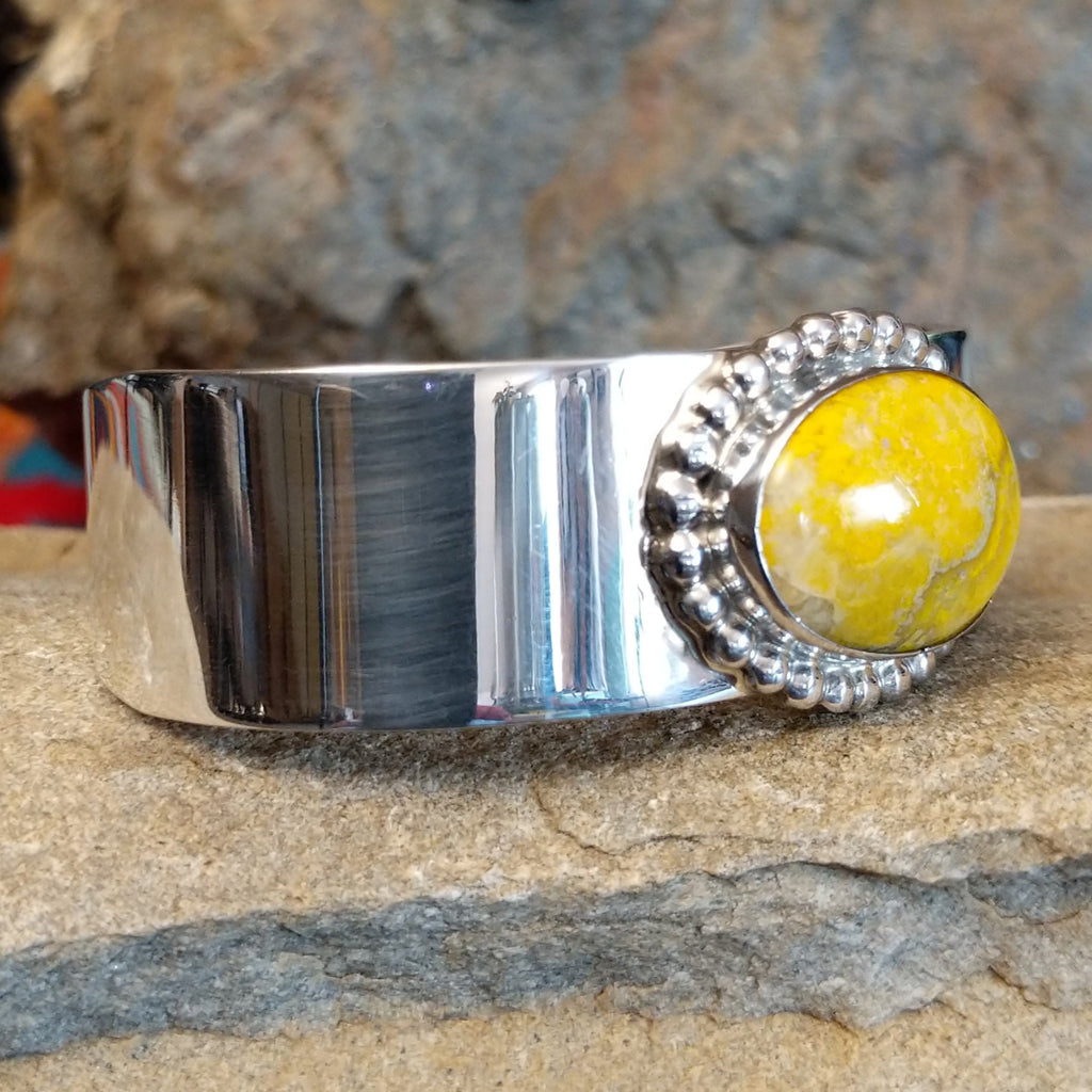 This cuff features a striking bumblebee jasper stone, its vivid yellow tones intersected by a vein of transparency, white, and gray. A smooth silver bezel secures the stone, framed by silver dotting that adds nice detail. The sleek silver band provides a clean, polished foundation, letting the intricate details of the stone take center stage.