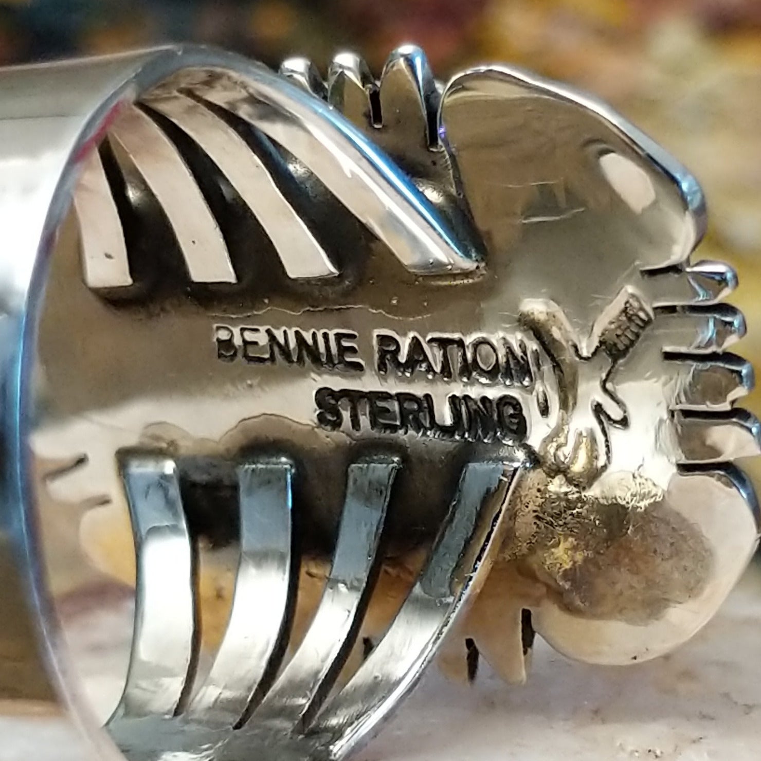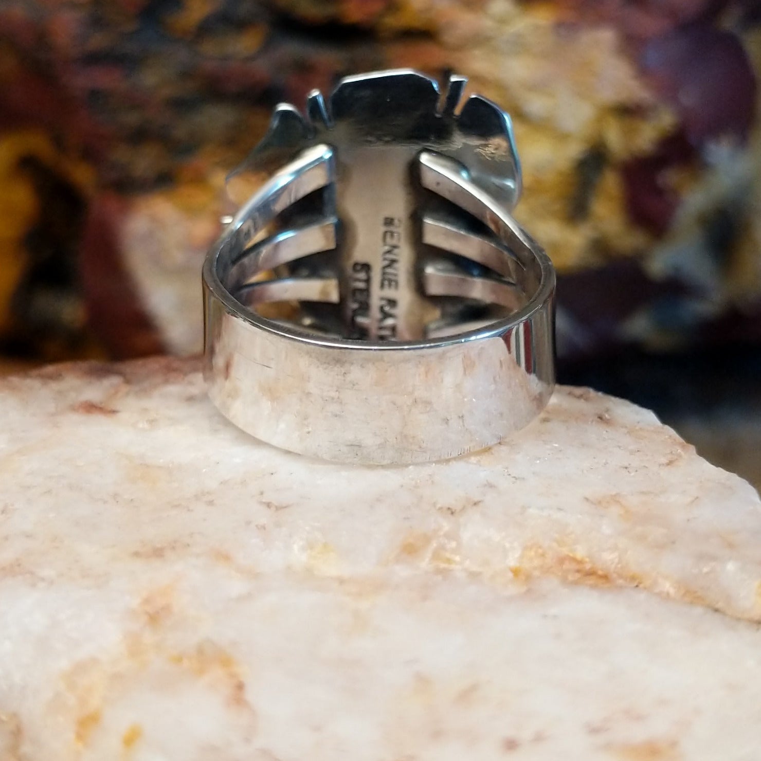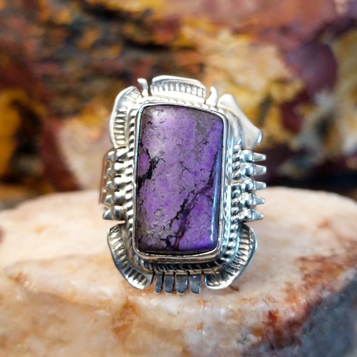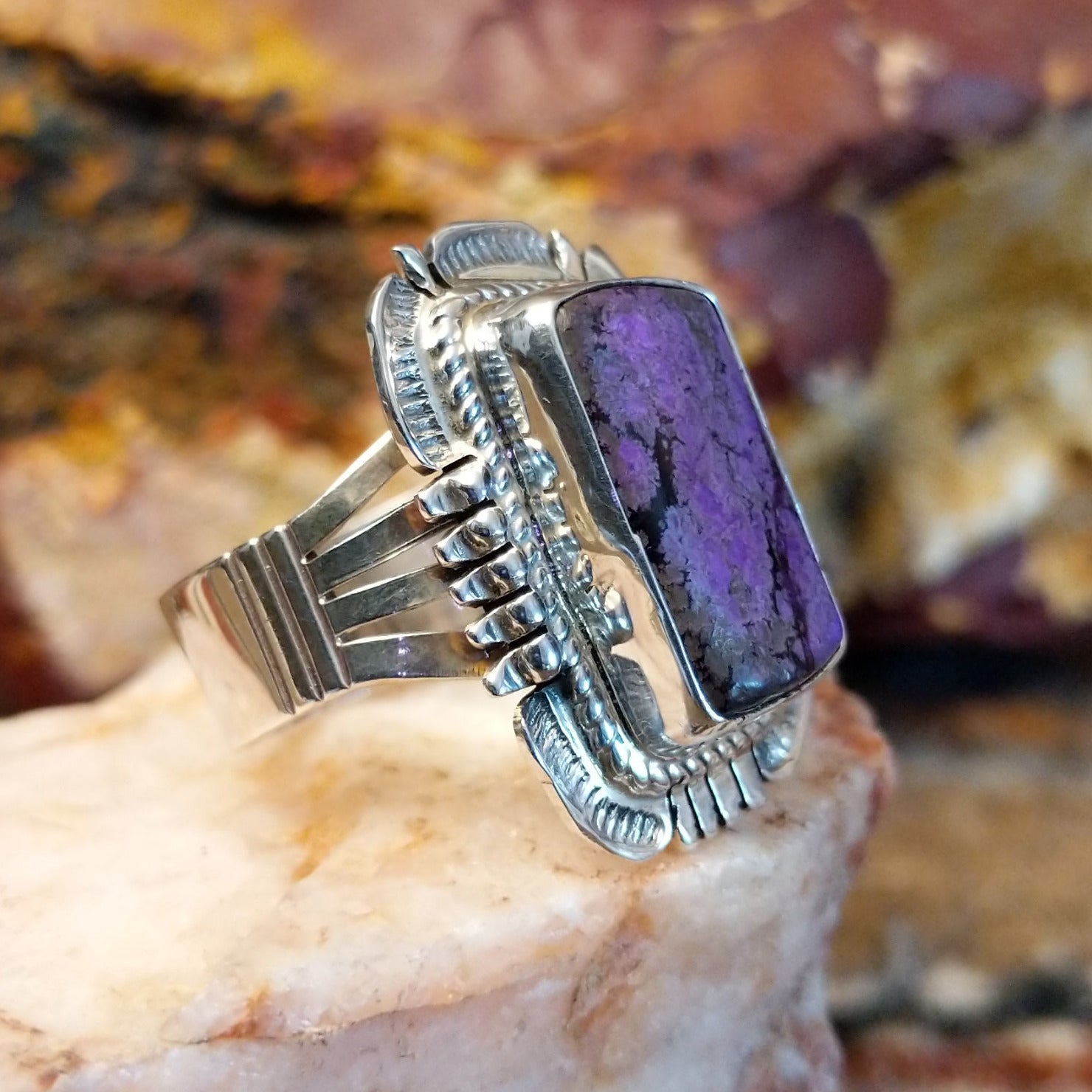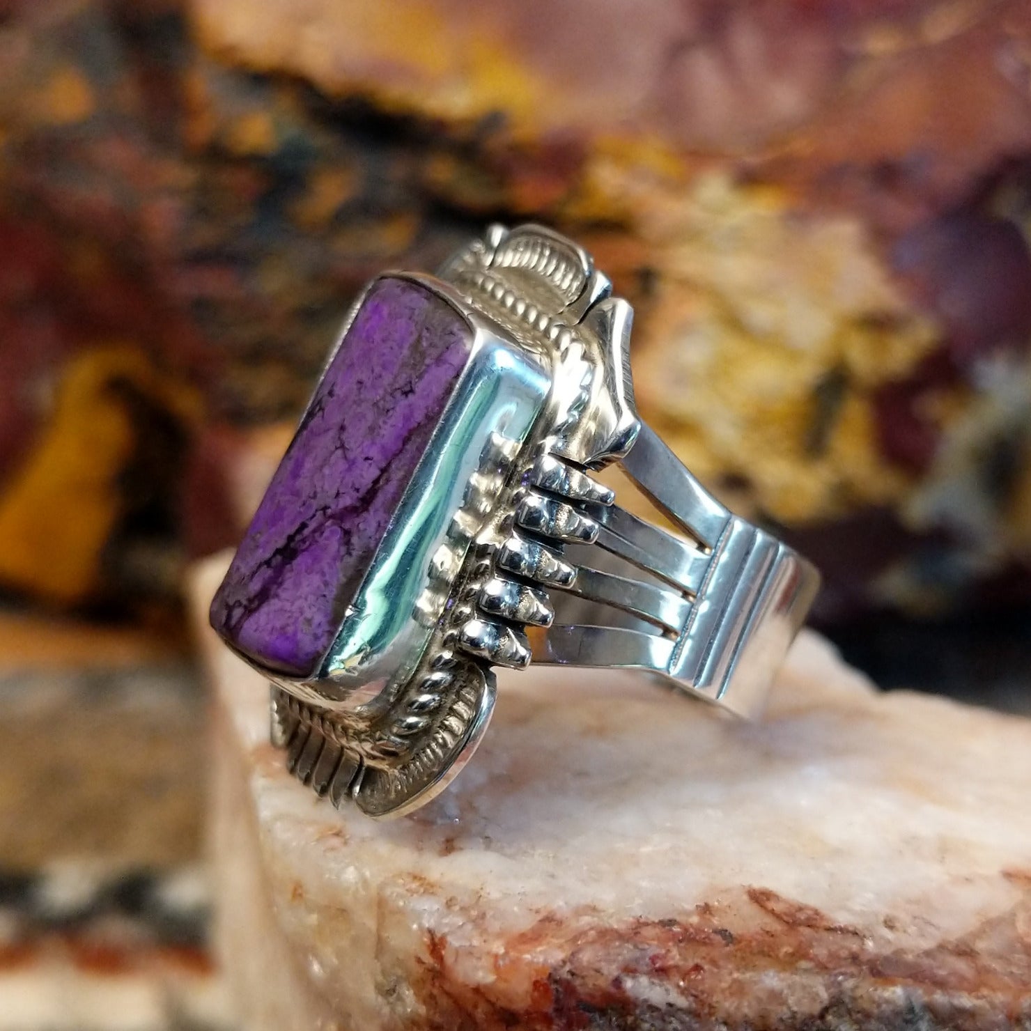 This sugilite ring by Navajo artisan Bennie Ration, features the vibrant square stone framed by intricate silver work. The unique design and thick band makes it a perfect statement piece for collectors.