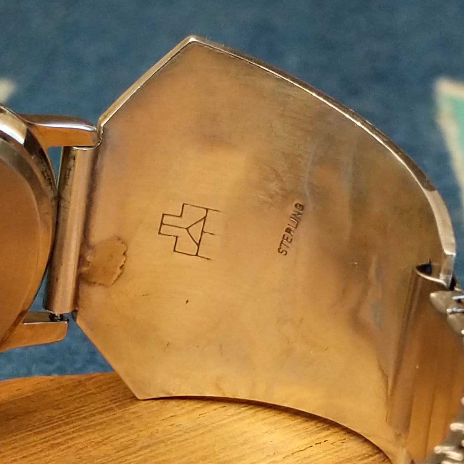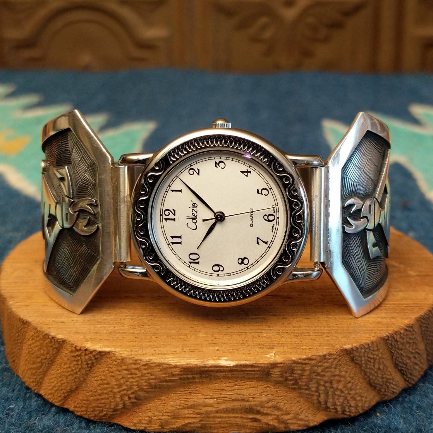 This striking timepiece by Hopi artisan Fernando Puhuhefvaya is made with sterling silver and features intricate detailing. The watch face is framed by ornate silverwork, while the bracelet features beautifully stamped flute player motifs. Crafted with precision and cultural authenticity, it is functional accessory that doubles as wearable art.
