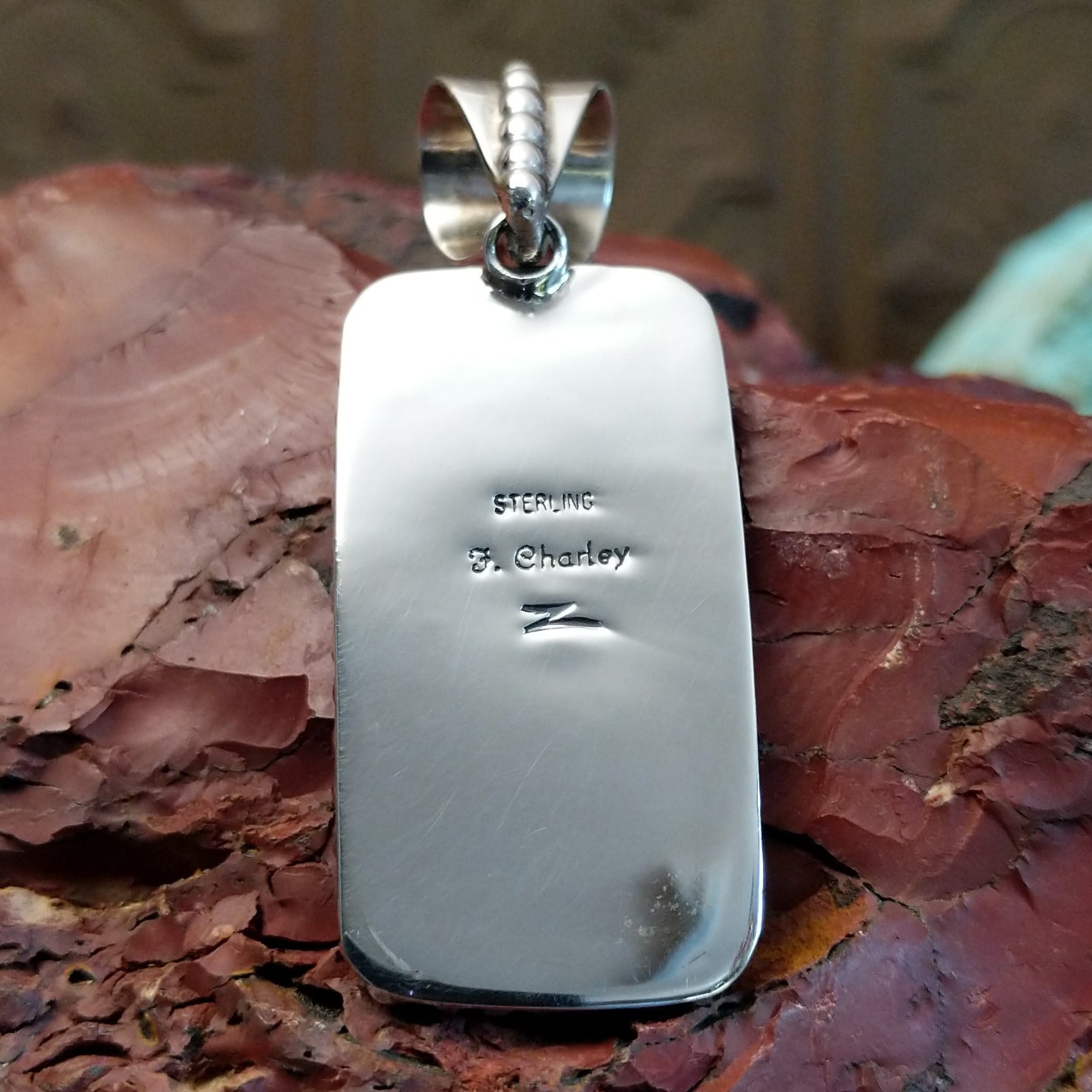 Handcrafted by Navajo artisan Fred Charley, this sterling silver pendant features a rectangular sugilite set within the bezel. The stone is framed by dotted accents, making it a stunning and wearable collectors' piece.