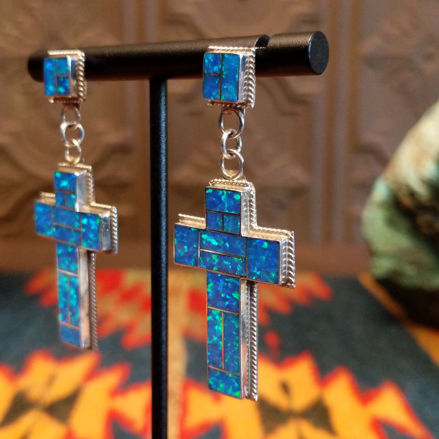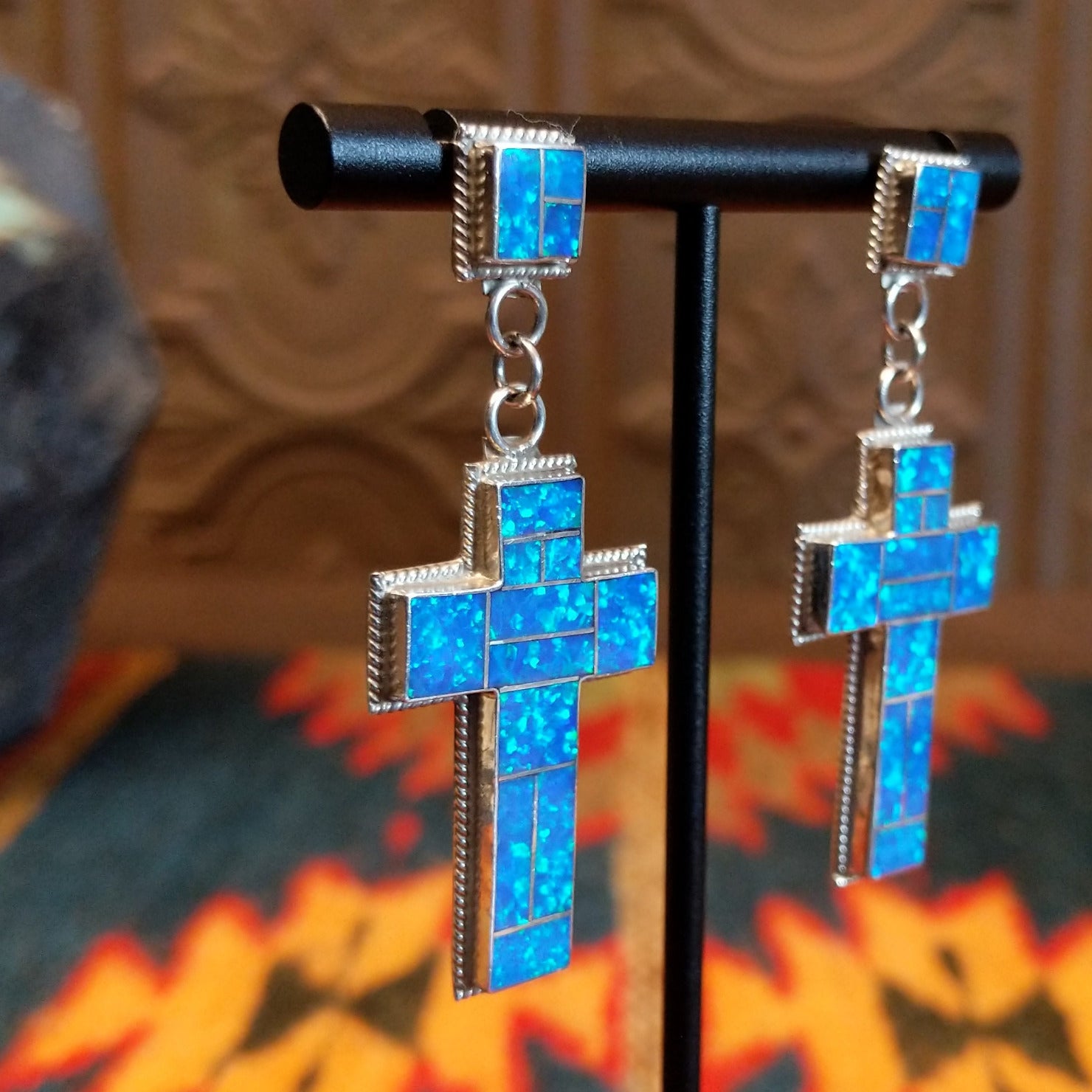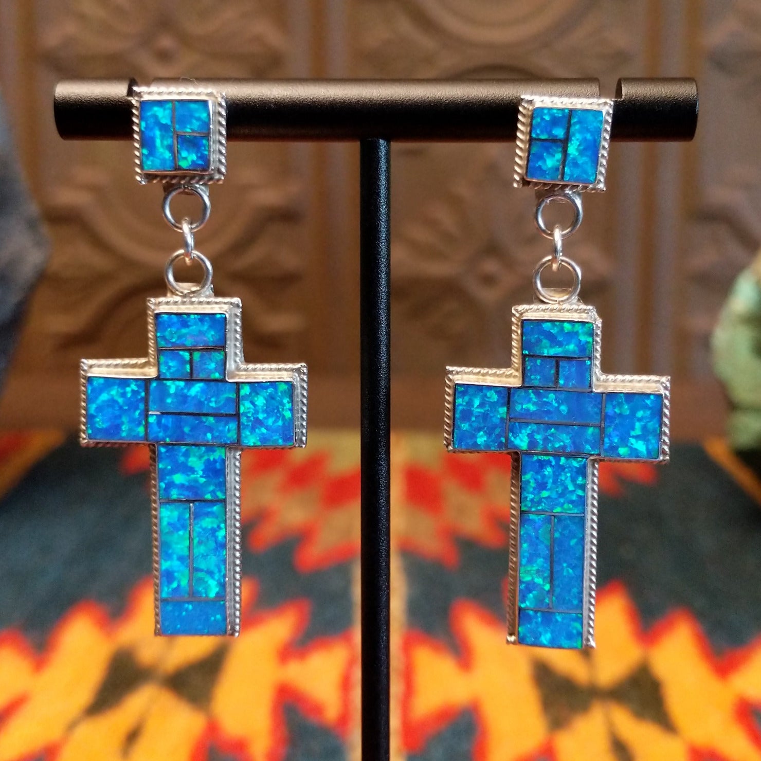 Navajo Blue Manmade Opal Cross Earrings by R.B. GJ-ERN-0203