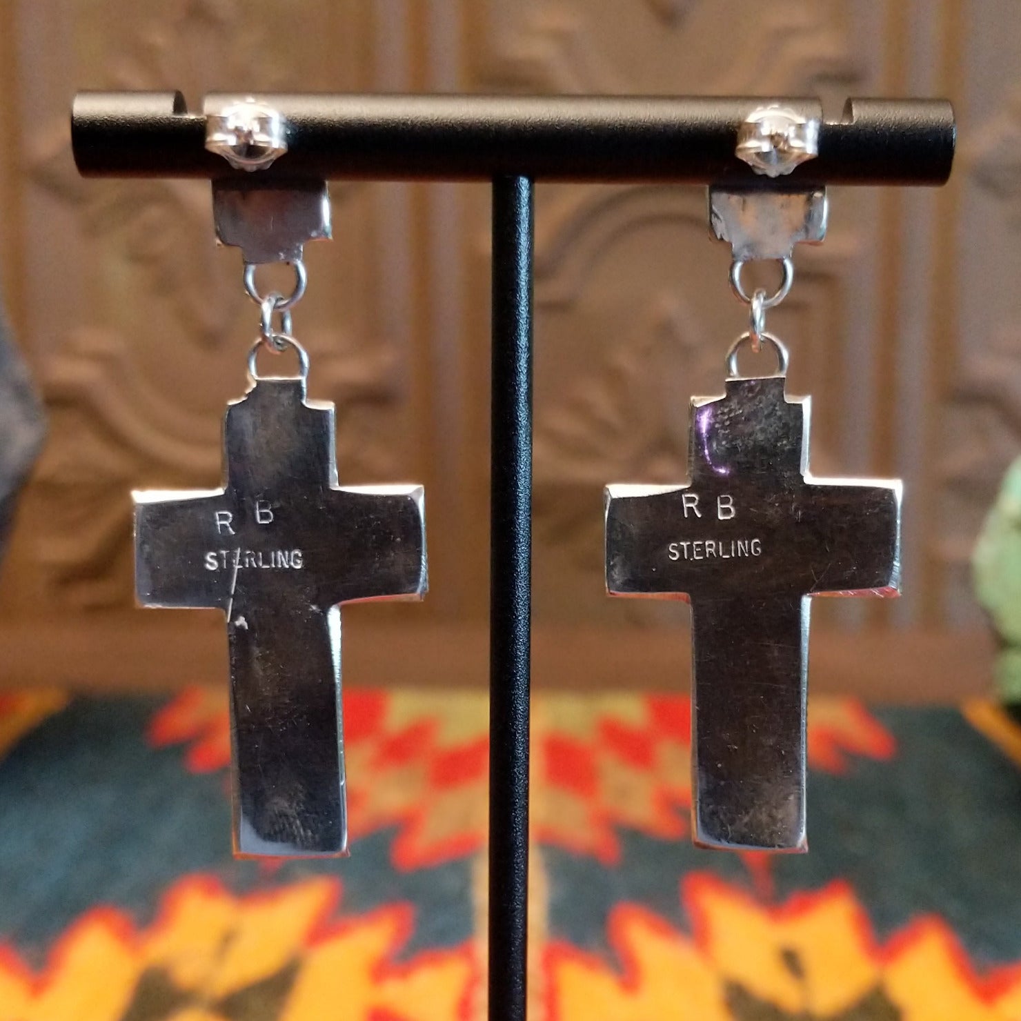 Crafted by Navajo artisan initialed R.B., these sterling silver earrings feature blue manmade opal inlays set within the cross settings. The stunning hue makes these an eye-catching piece, perfect for various occasions.