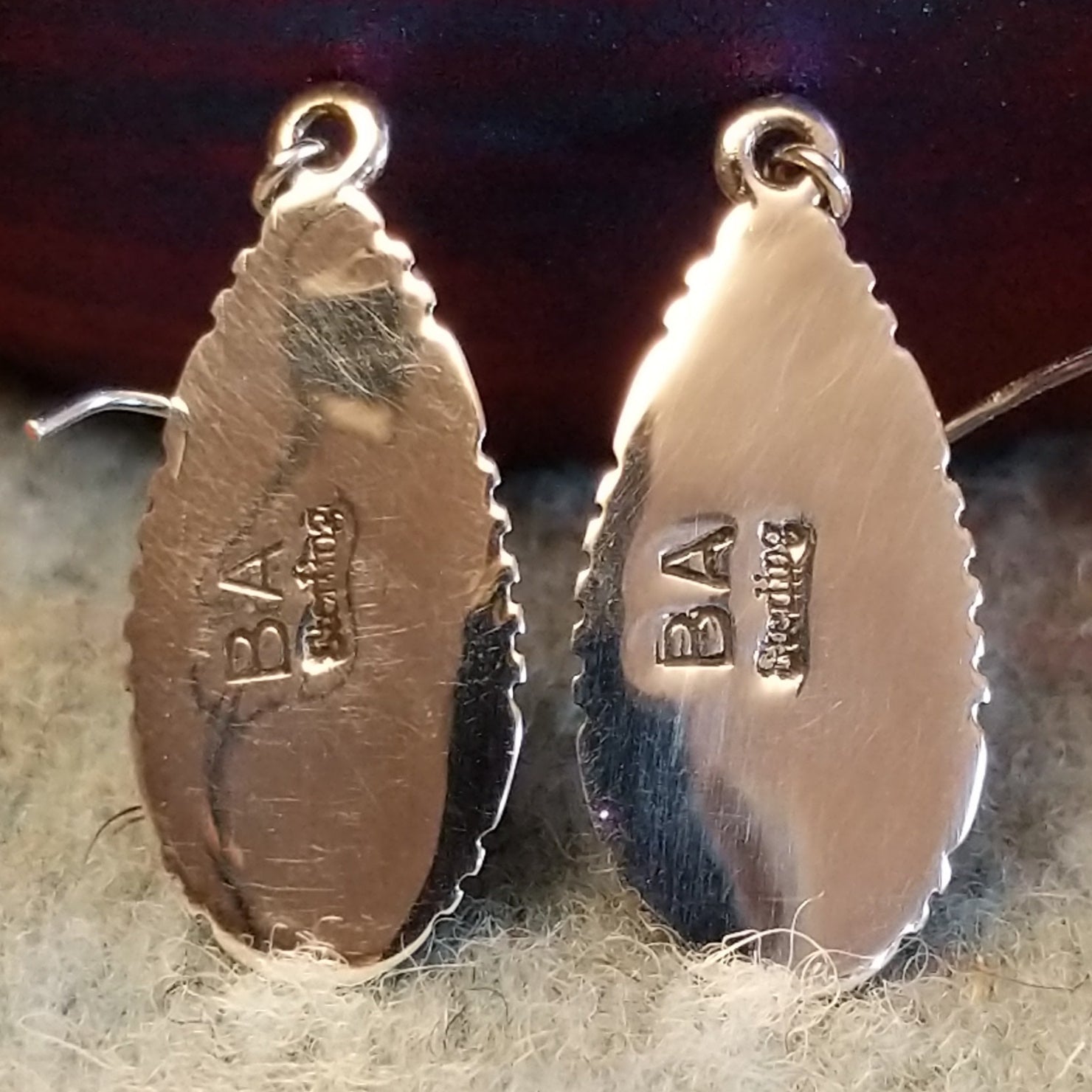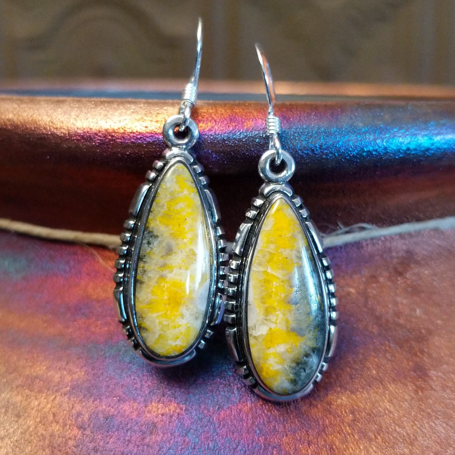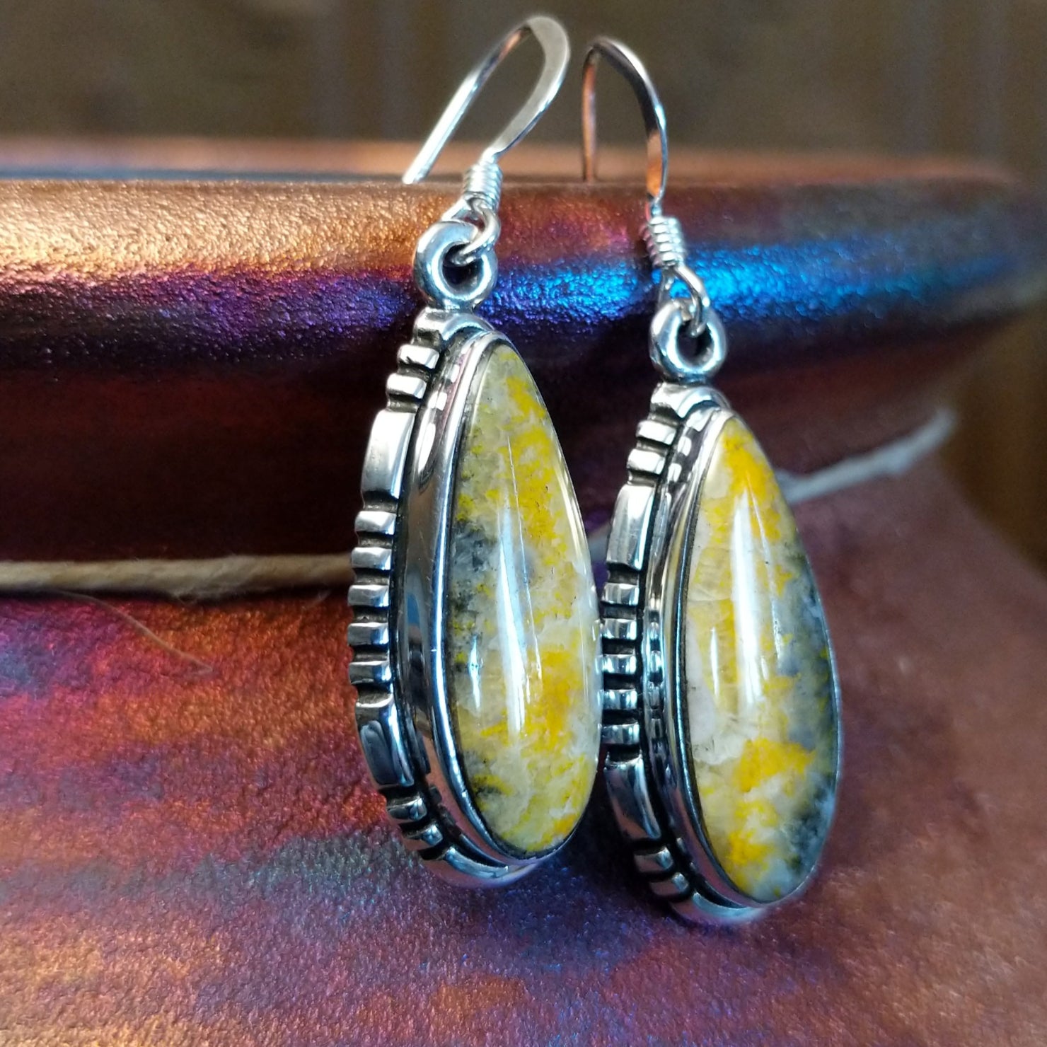 These elegant earrings showcase elongated teardrops of bumblebee jasper, with a soft yellow center framed by deep black and gray edges. Set in polished silver, each stone is bordered by intricately cut silver designs with a rich patina, adding an enjoyable contrast. These earrings are signed with the hallmark B.A.