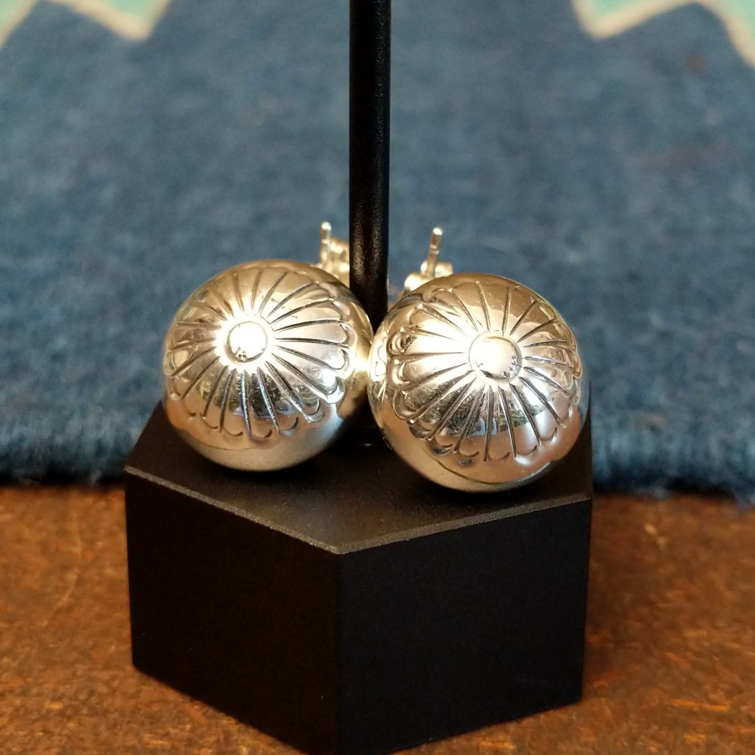 These Navajo made silver floral dangle earrings combine a decorative stud top with suspended elements, all adorned with floral detailing. The layered design creates movement that offers elegance as a unique accessory piece.