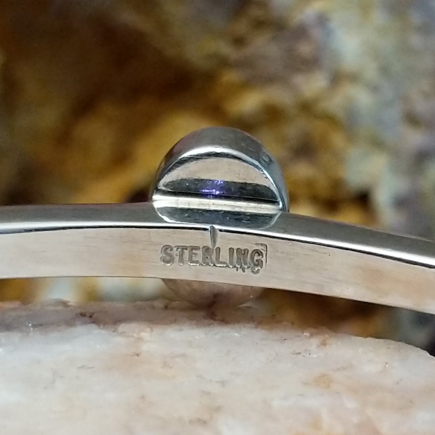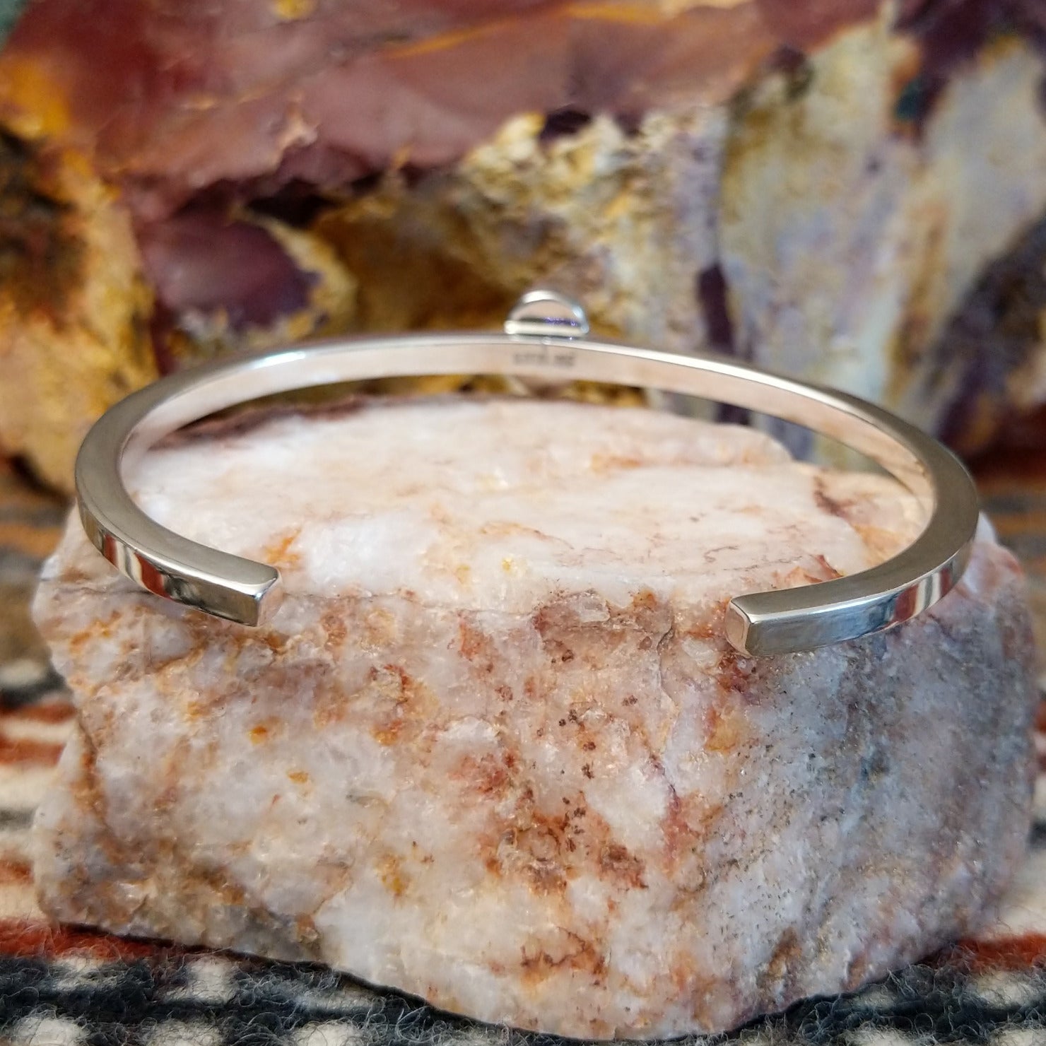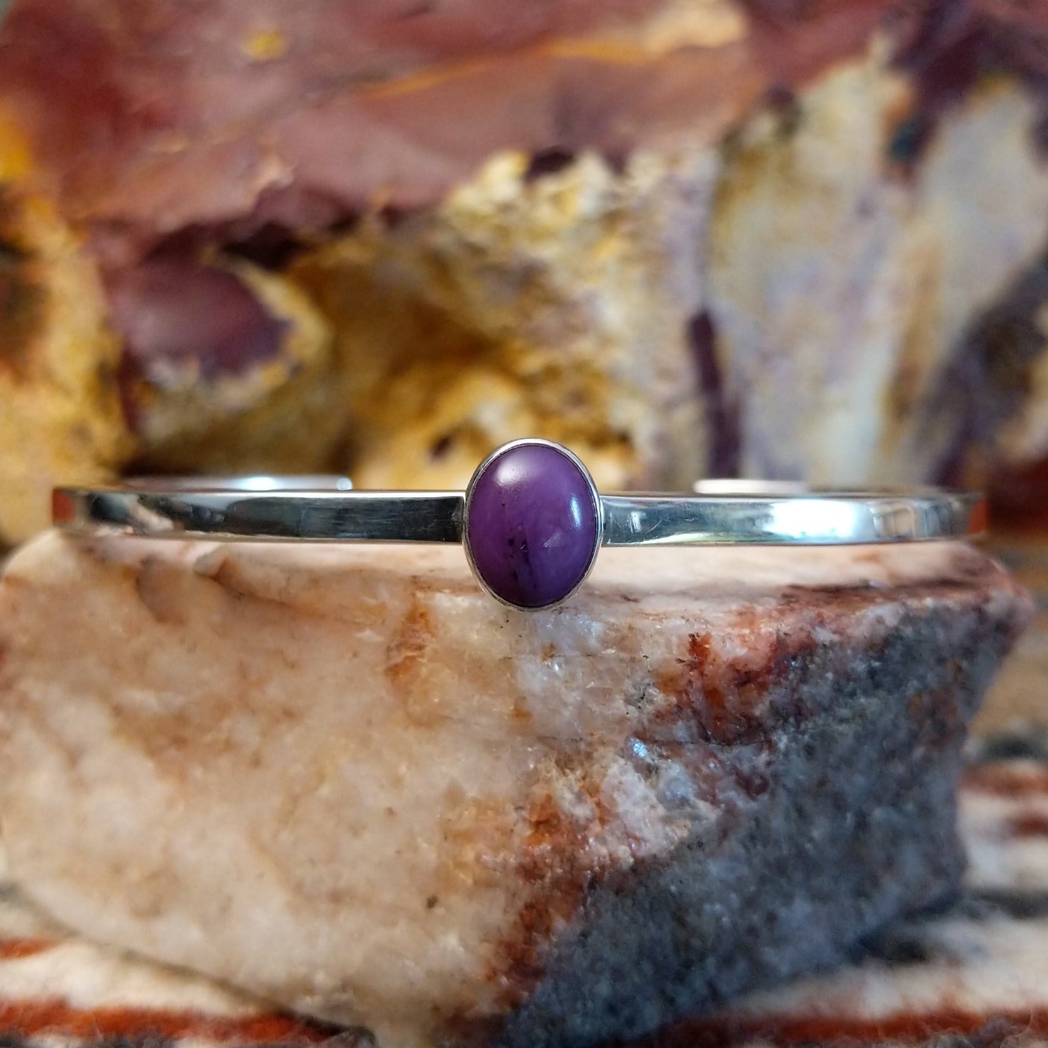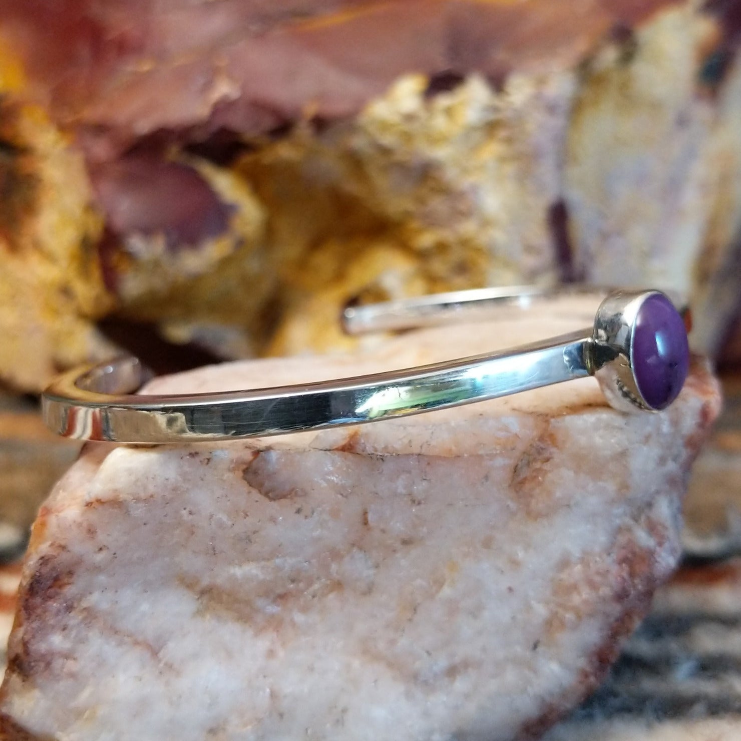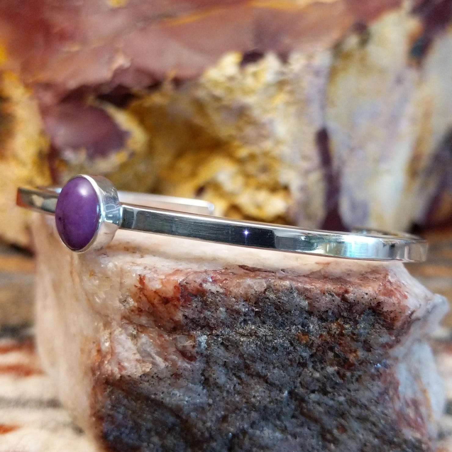 This Navajo made sterling silver cuff features a sugilite stone set within the bezel. The polished finish and vibrant hue make it a stunning everyday accessory.