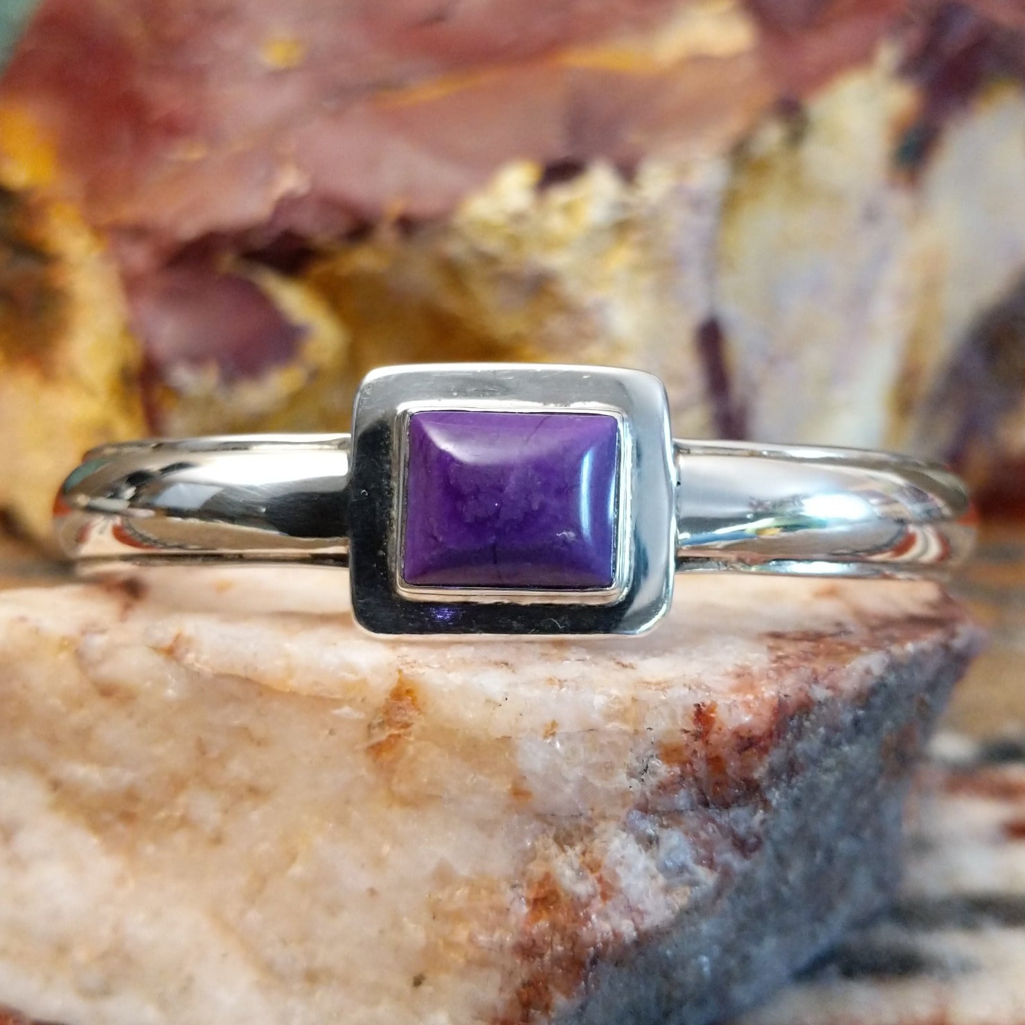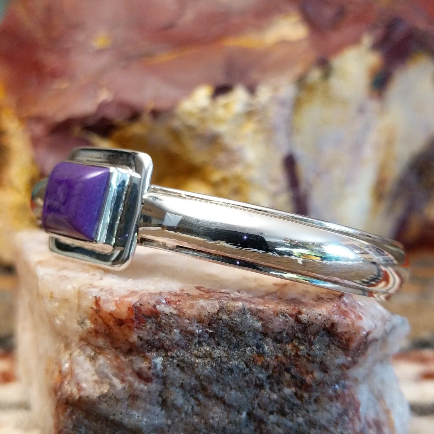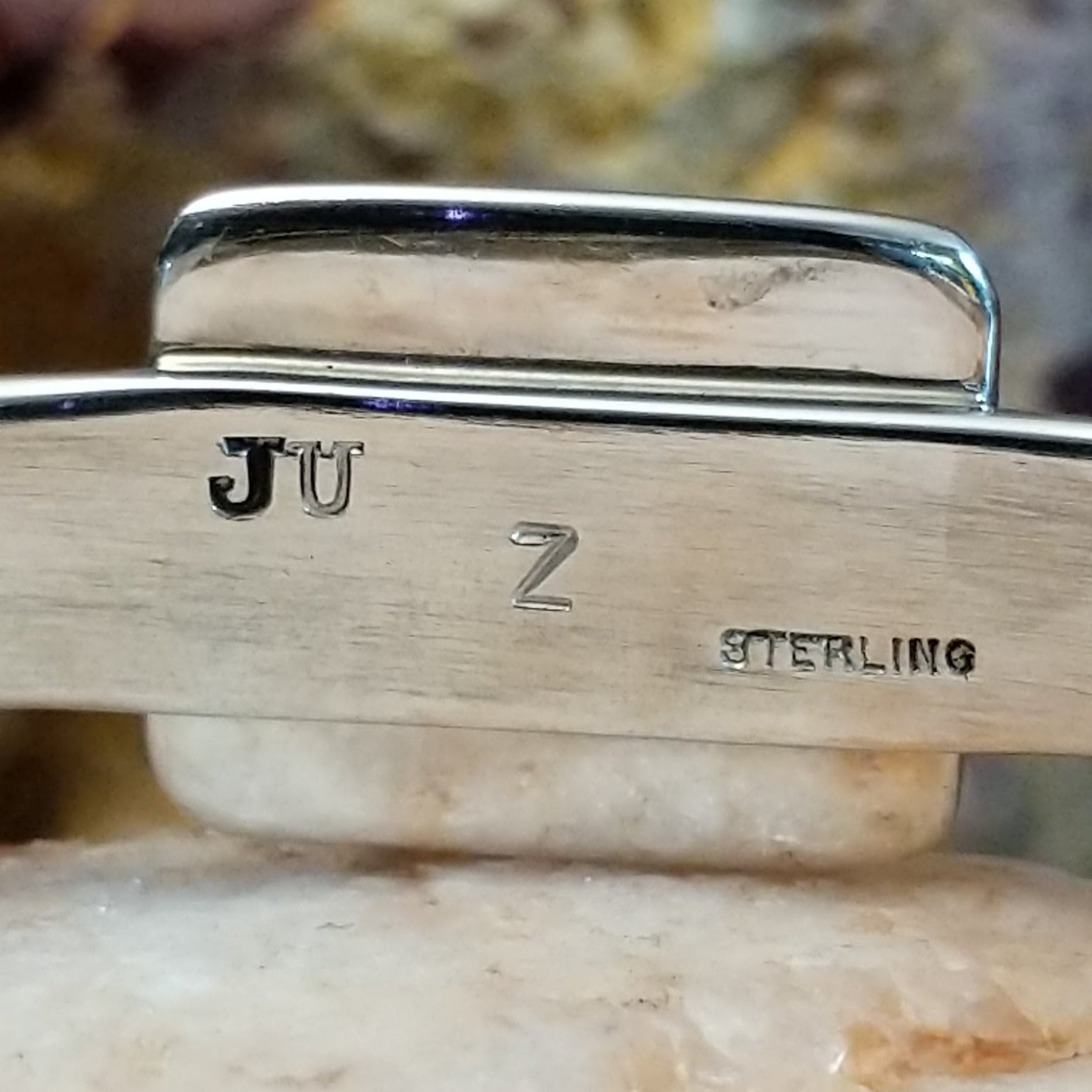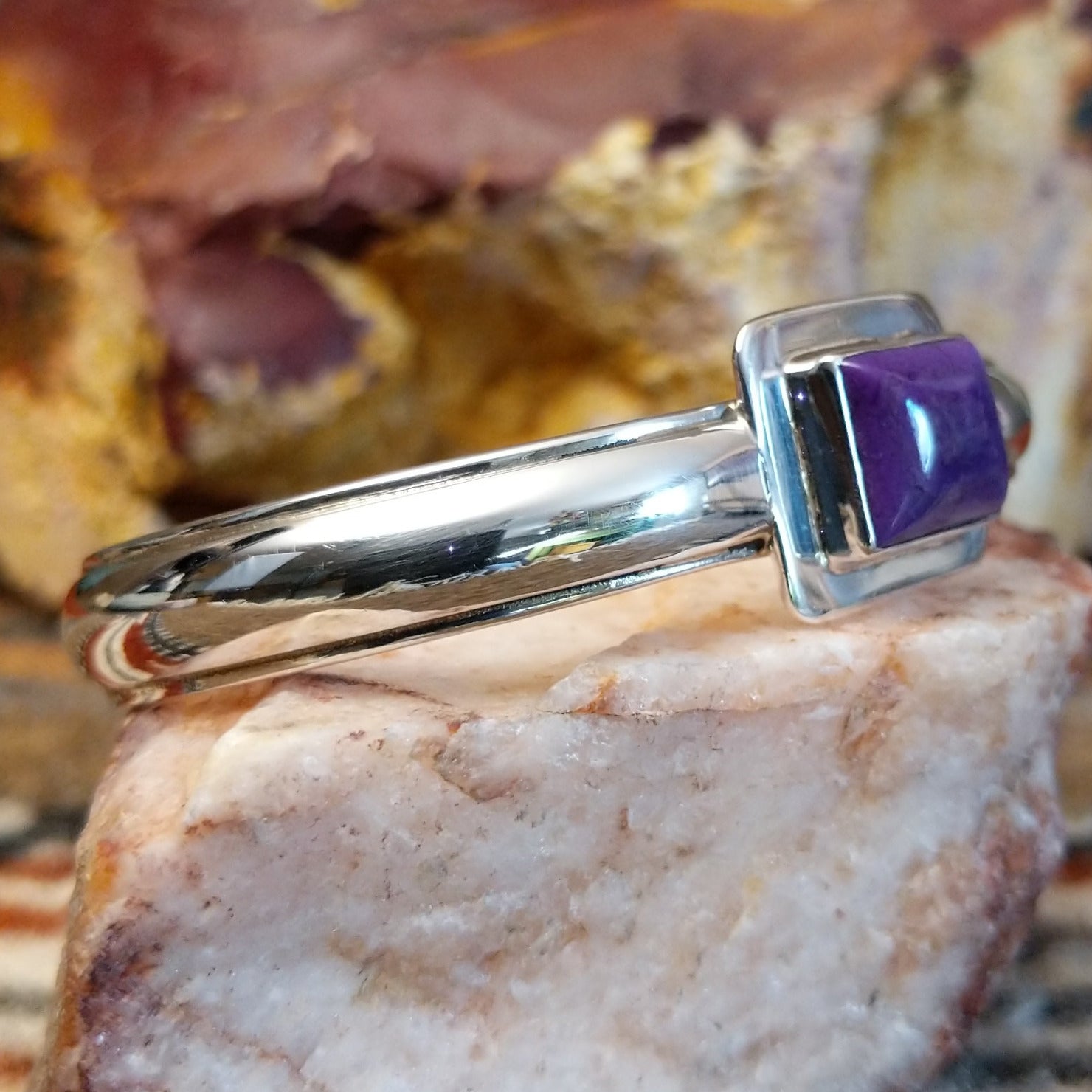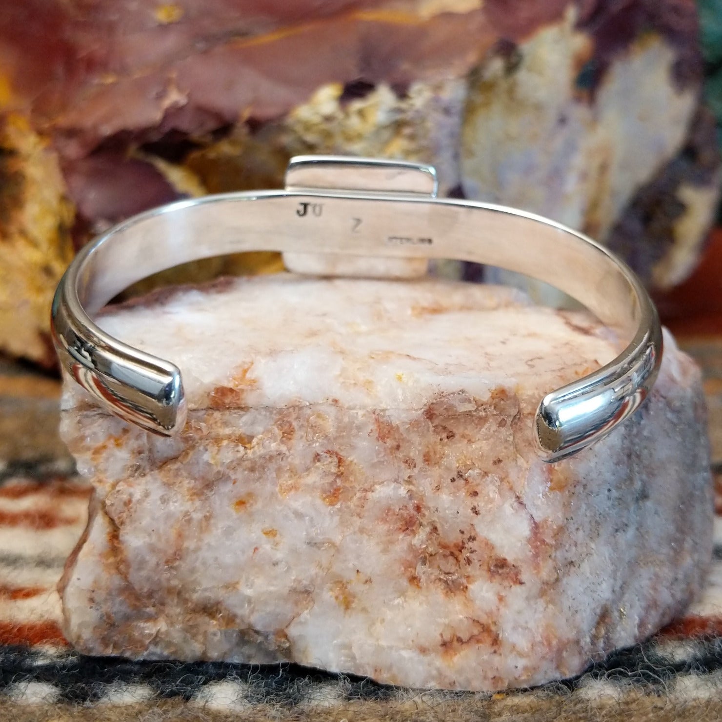 This sterling silver cuff, crafted by Navajo artisan initialed J.U., features a square sugilite stone set within the bezel. The vibrant hue and polished finish of the silver makes it a perfect addition for collectors.
