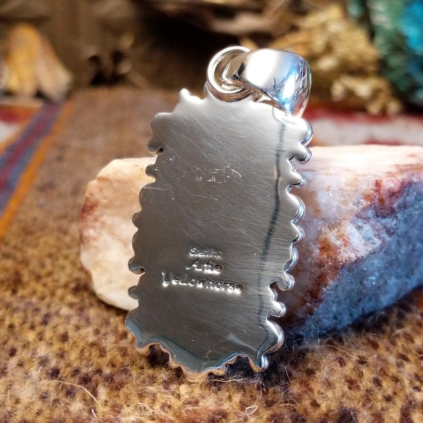 Crafted by Navajo artisan Artie Yellowhorse, this square pendant features azurite set within the sterling silver bezel. Framed by twisted rope accents and dotted detailing along the edges, this is a stunning and vibrant piece perfect for various occasions.