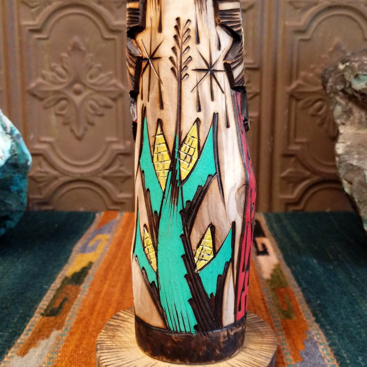 The blueface Shalako kachina by John Taylor is an expertly carved wooden figure distinguished by its vibrant blue face and intricate painted designs. Featuring motifs such as corn, faces, and geometric patterns, this piece showcases its' traditional symbolism and skilled craftsmanship.