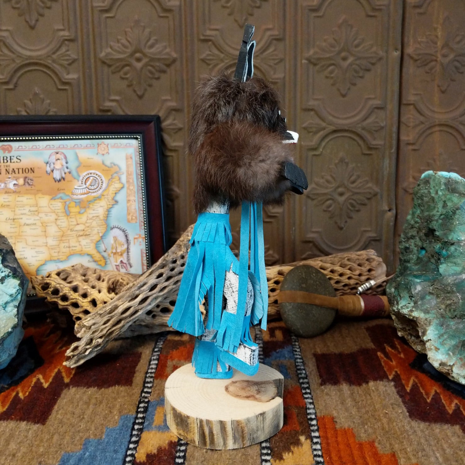 This bear kachina made by Navajo artisan M.C. is intricately carved from wood and adorned with vibrant blue suede clothing, detailed fur accents, and carefully applied paint. As a prominent figure in the Mixed Dance, the kachina symbolizes power, strength, courage, and healing.