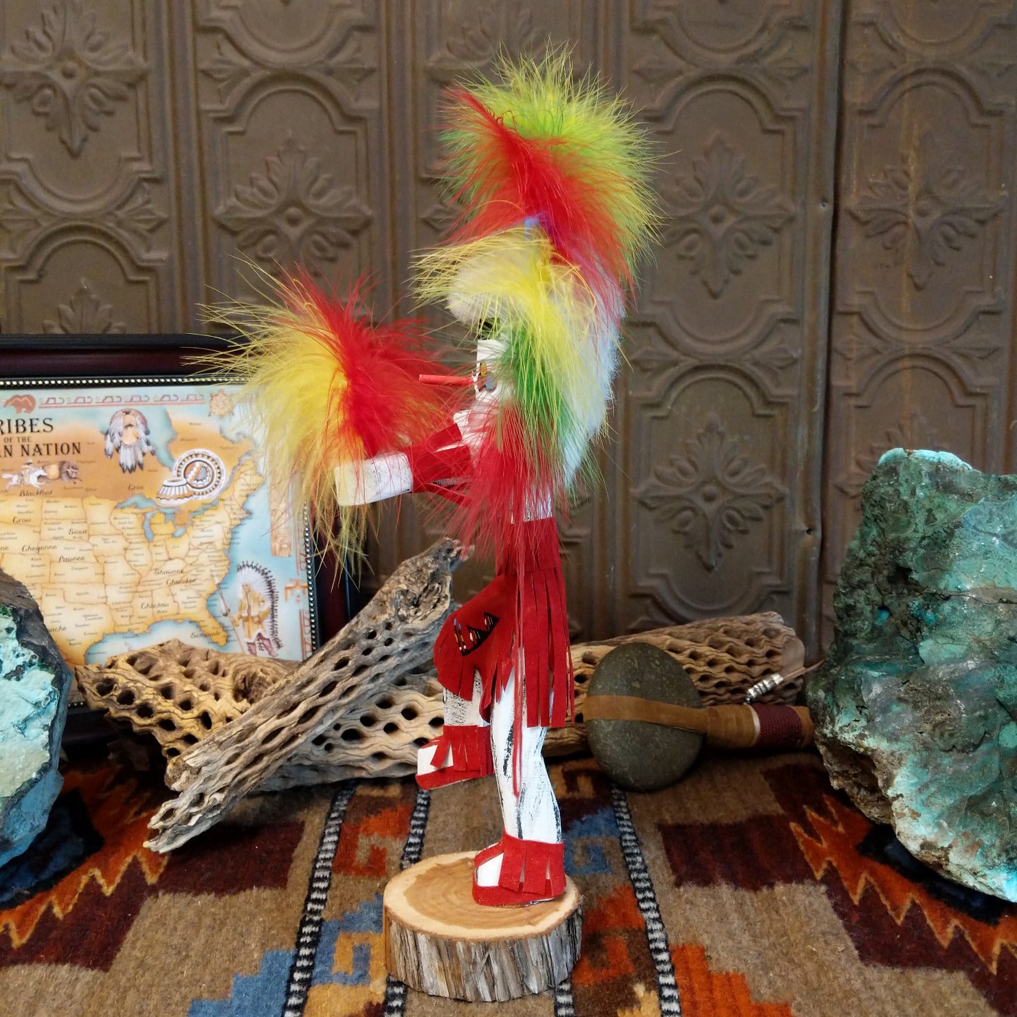 The Navajo rainbow kachina by artisan M.C. is a finely carved wooden figure featuring vibrant, multicolored paints and adorned with feathers and red suede accents. This striking kachina symbolizes the hope for peace and harmony among tribes, embodying a cultural message through its colorful design and craftsmanship.