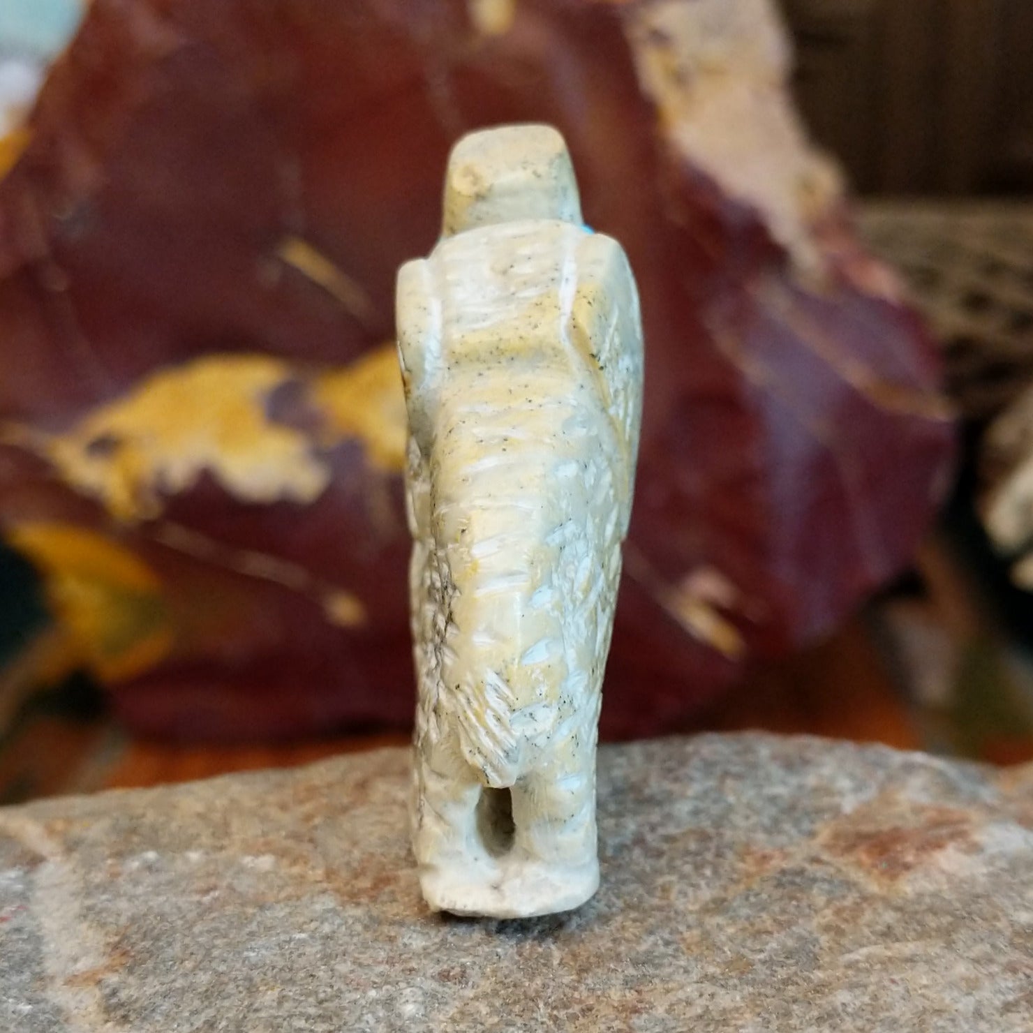 This exquisite Zuni elephant fetish carving by artisan Carlton Kaamasee showcases masterful craftsmanship in serpentine stone. Intricate etched details along the elephant's body highlight the artistic skill, making this piece a distinctive collector’s item.