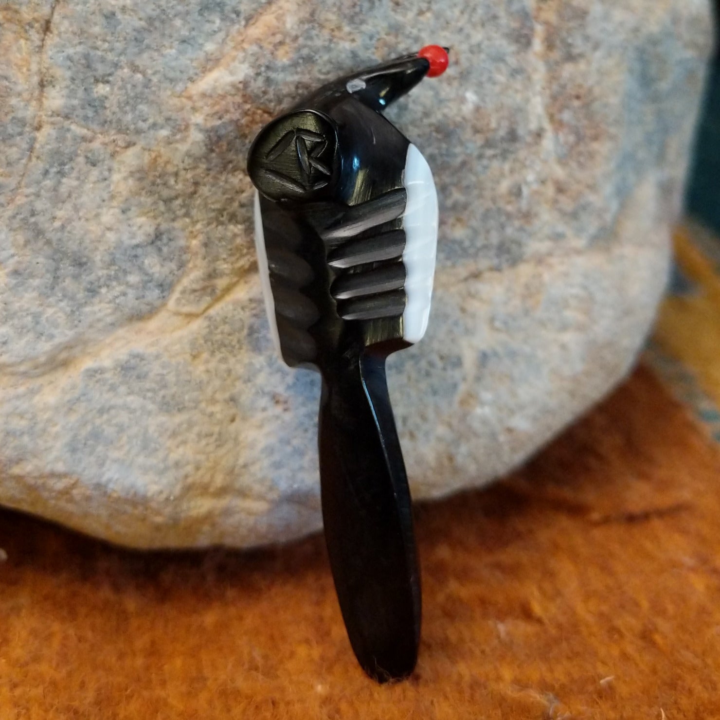 This Zuni magpie fetish carving by Calvert Bowannie features expertly crafted black marble contrasted with luminous mother of pearl inlays. The striking interplay of dark and iridescent materials highlights the carving’s elegant details, reflect the artisan's mastery.