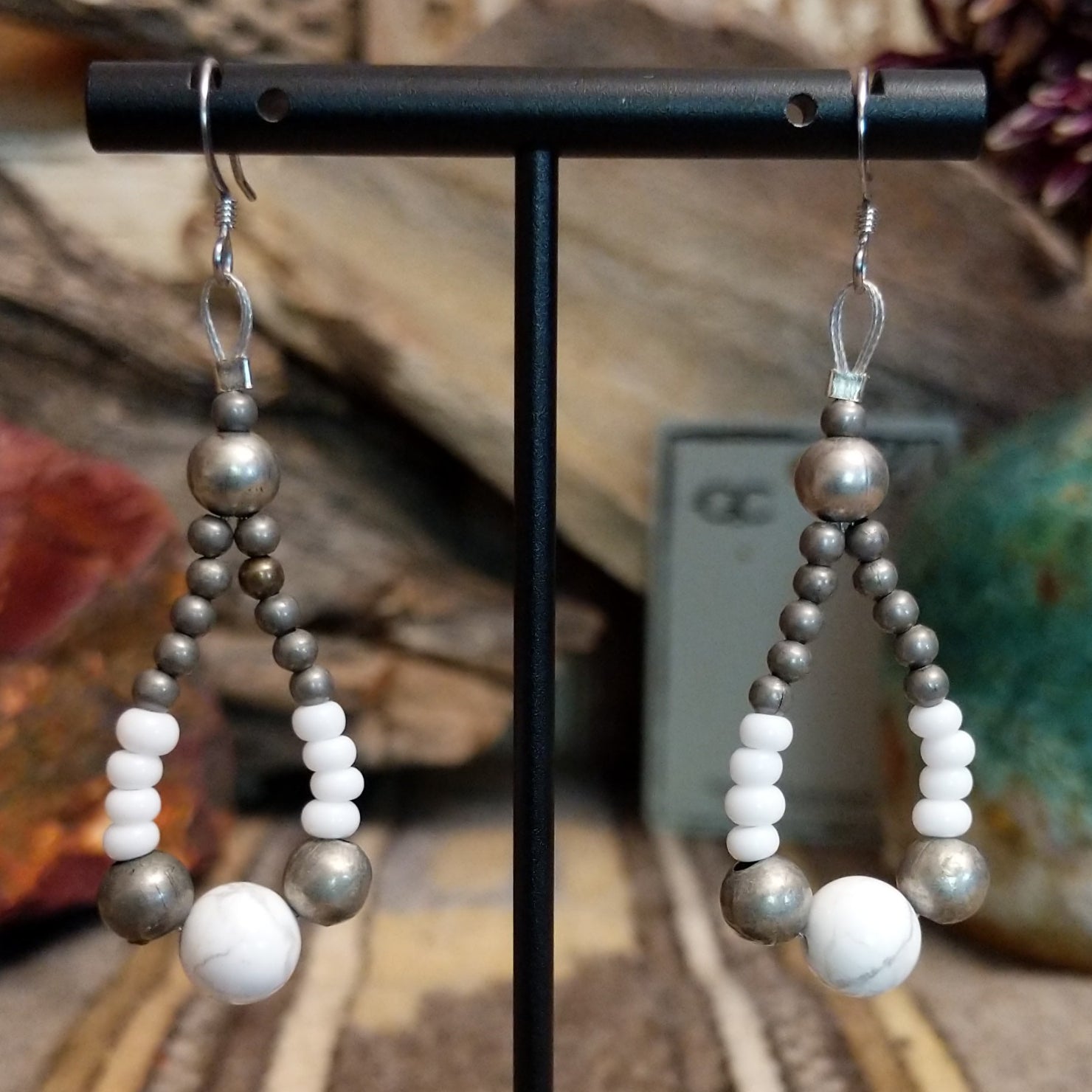 Crafted by Cowboy Collectibles, these desert moon earrings with silver and white beads, anchored by a radiant white stone that mirrors a desert moonrise. The teardrop design blends moonlight tones with celestial charm.