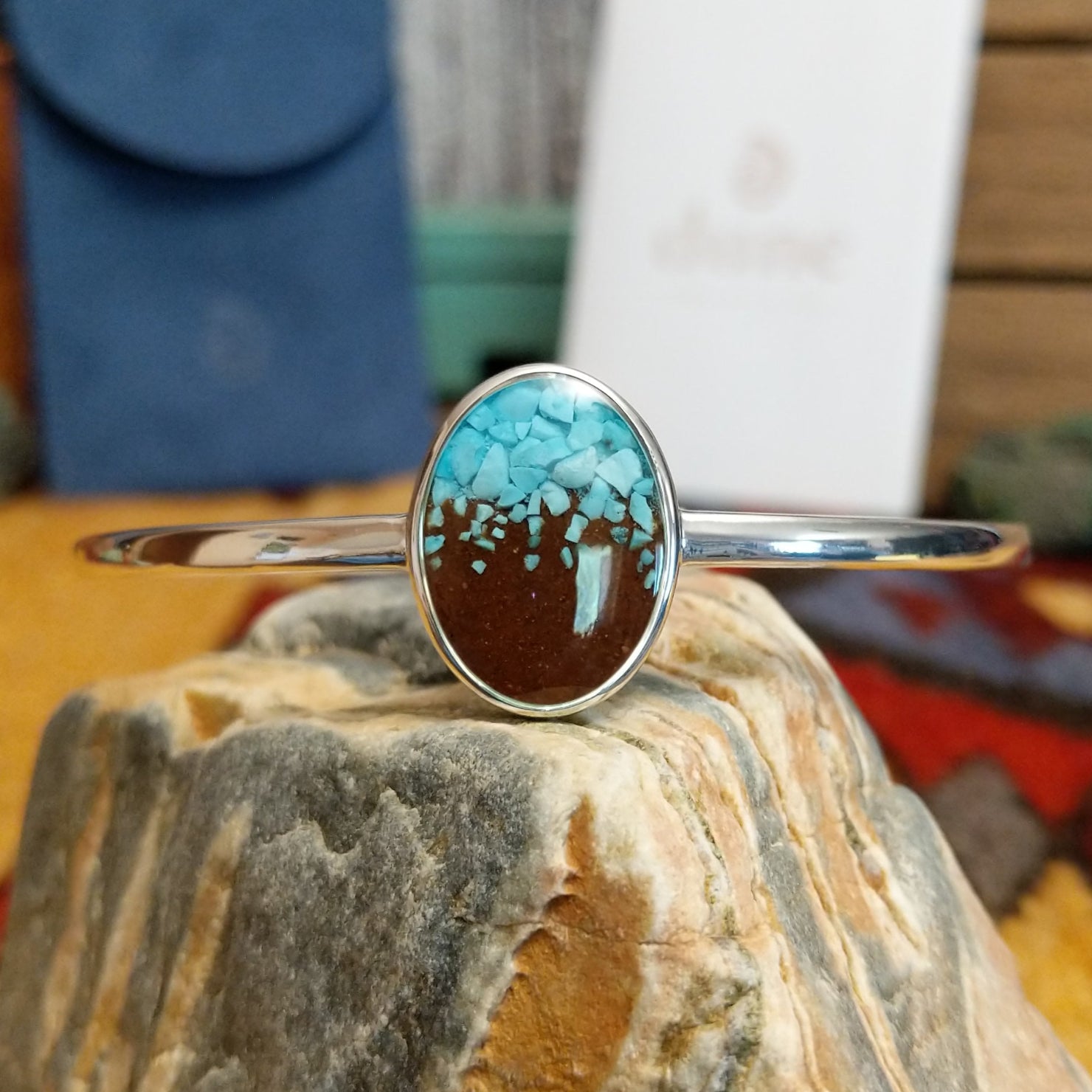 This Explorer oval cuff, crafted by Dune Jewelry, radiates with a turquoise and brown mosaic that showcases the beauty of nature. Encased in silver-plated brass, the maker’s design blends rugged charm with flexibility.