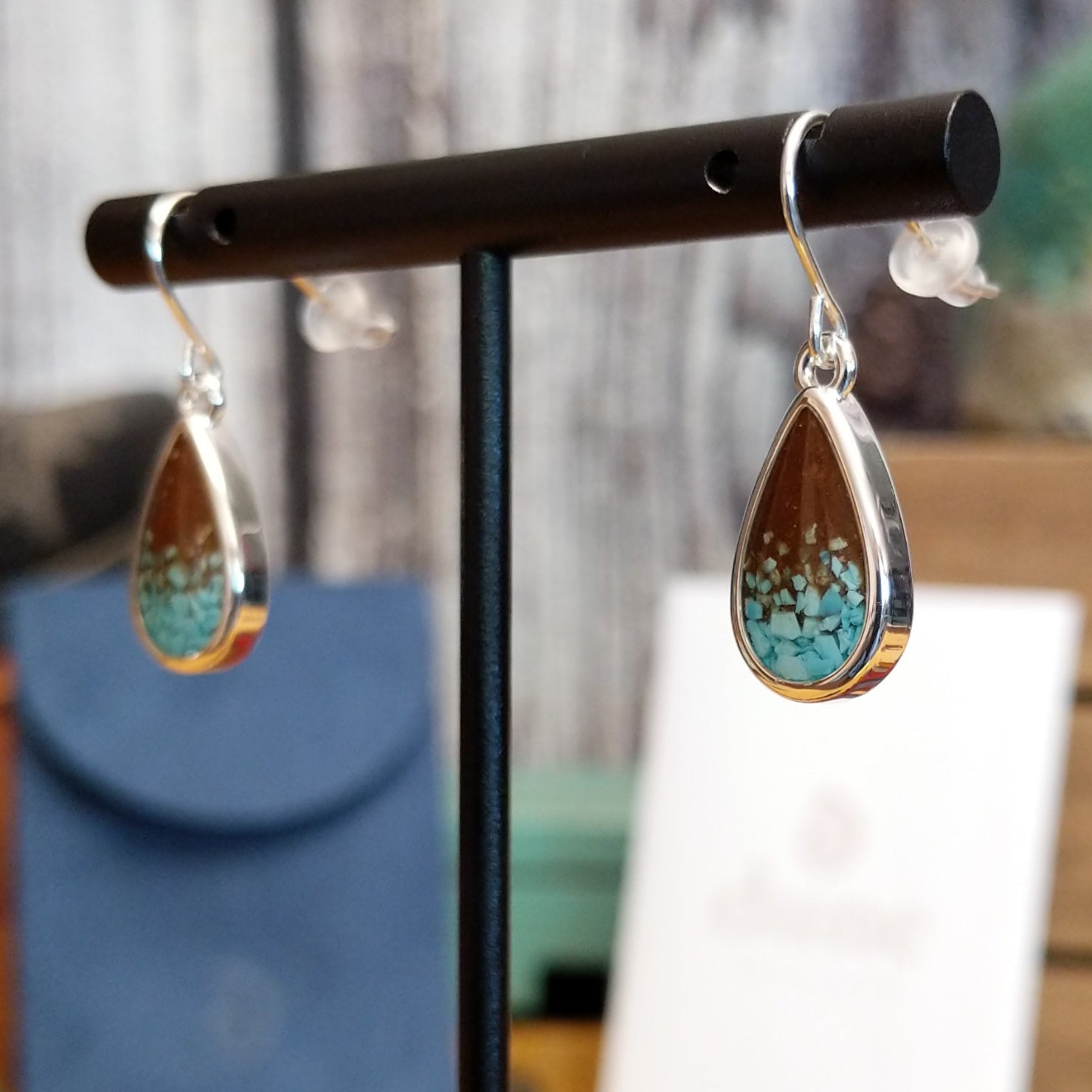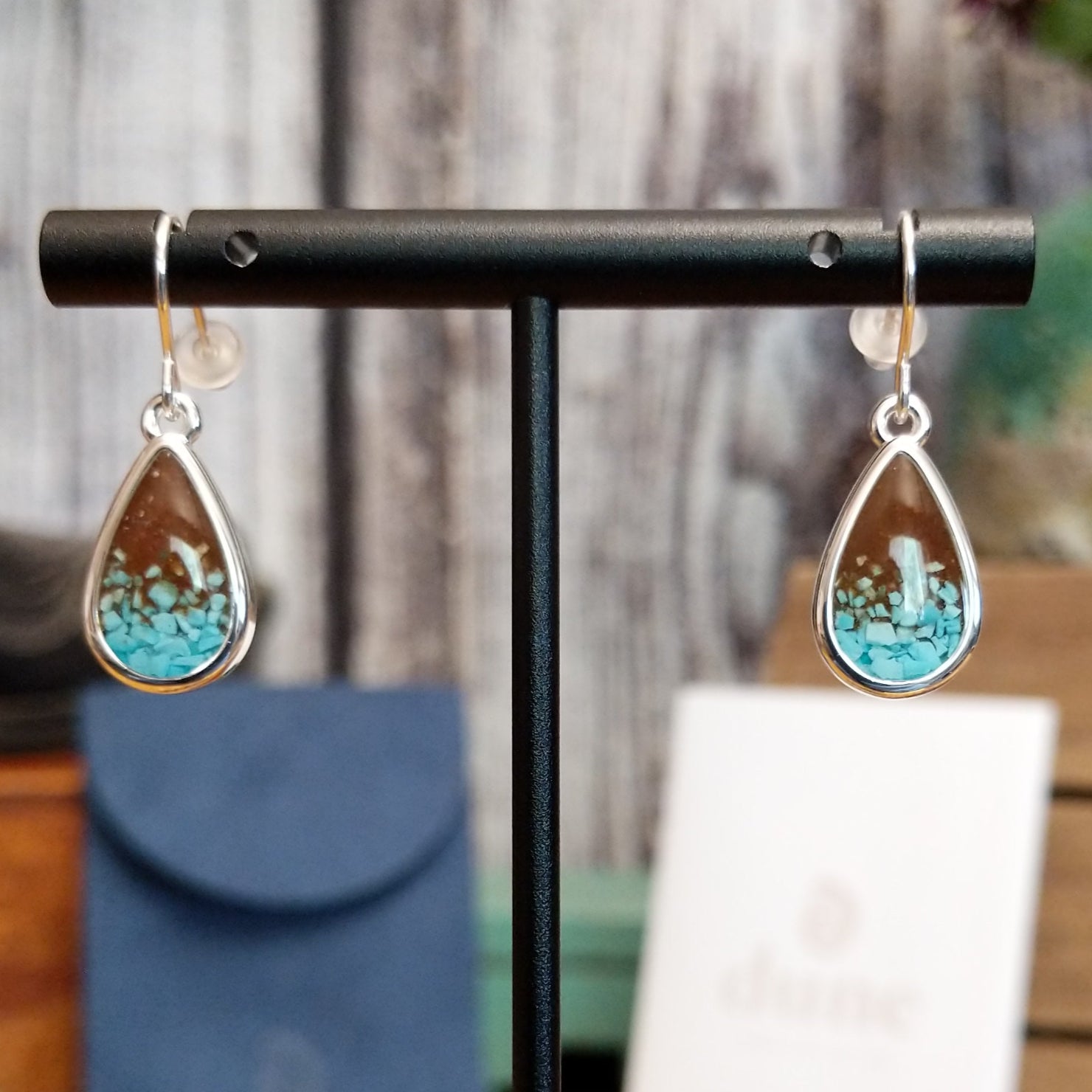 These Explorer teardrop earrings, crafted by Dune Jewelry, shimmer with a captivating turquoise and brown mosaic, evoking the wild beauty of uncharted landscapes. Encased in silver-plated brass, the maker’s design blends rustic charm with elegance.