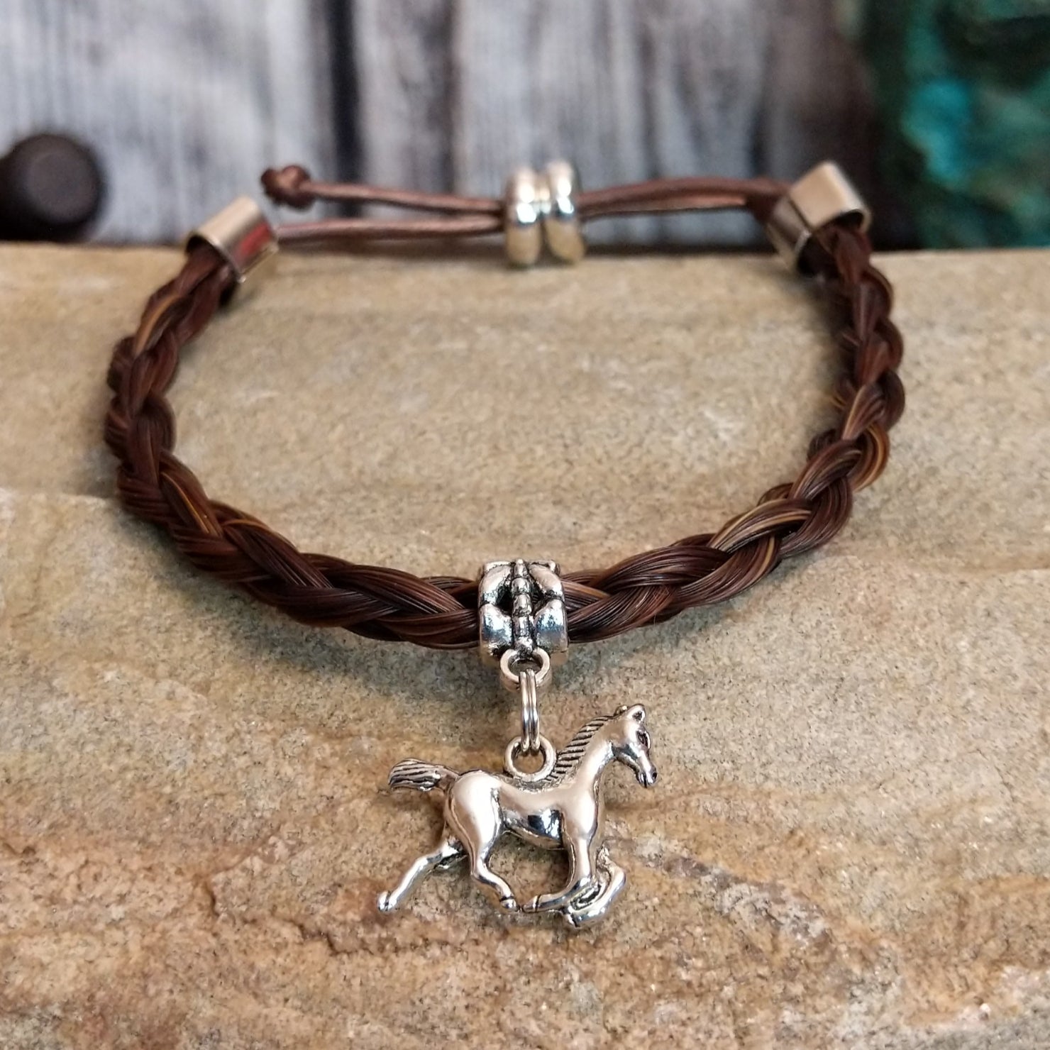 This Giddy Up bracelet from Cowboy Collectibles captures the spirit of the open range with its richly braided brown horsehair. The maker’s metal horse charm adds to the spirit of the Southwest and offers an adjustable cord to fit various sizes.