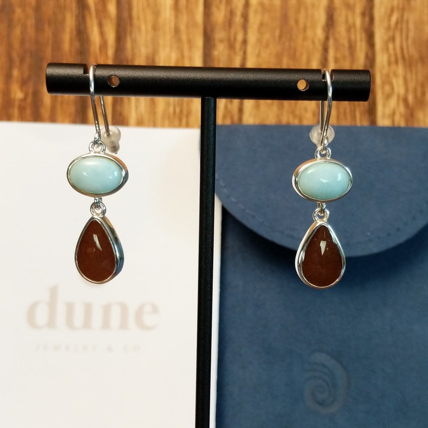 Crafted with expert precision, these stepping stone earrings feature larimar and Lake Powell sand encased in sterling silver bezels. Each dangle earring showcases a unique combination of natural elements, designed to offer both elegance and timeless appeal.