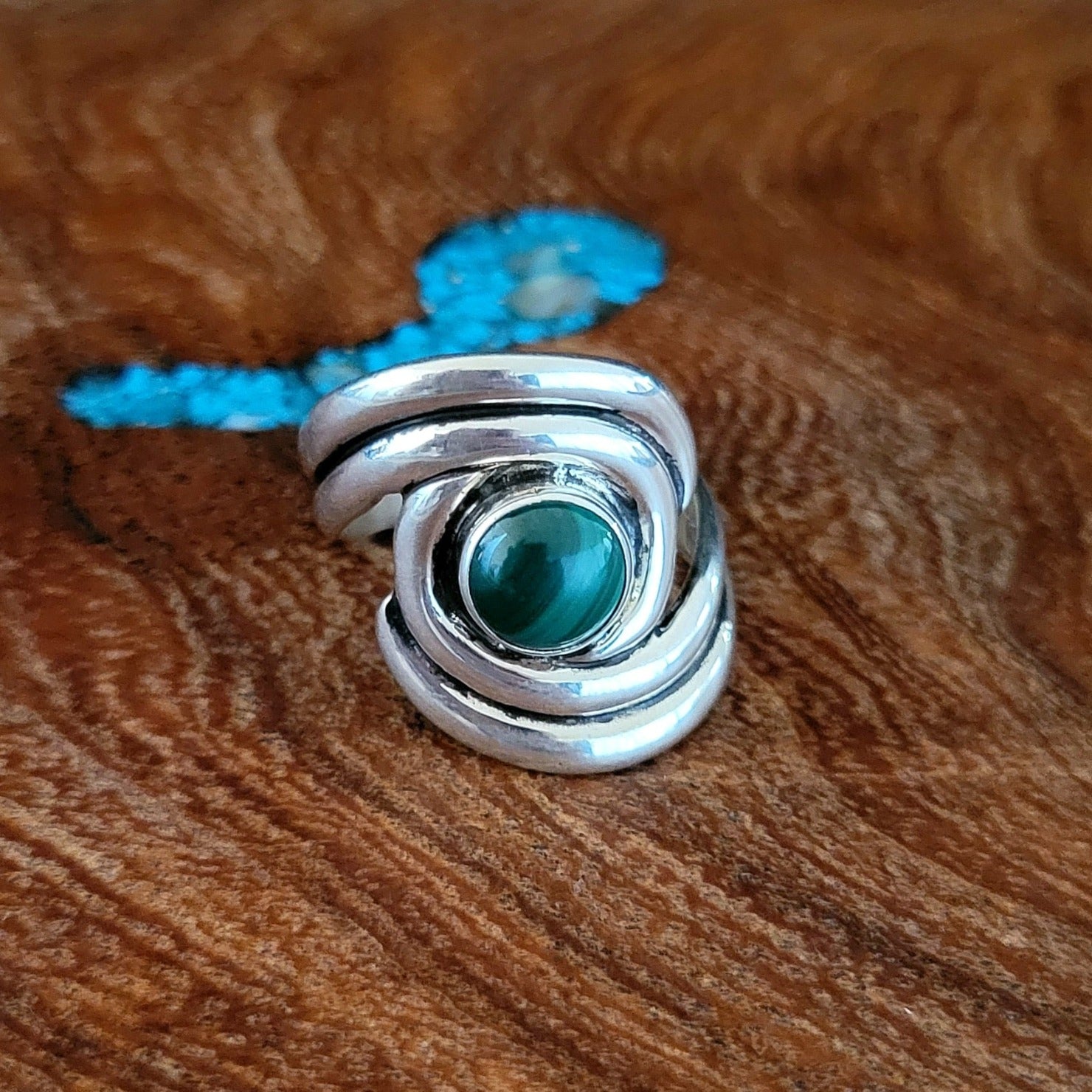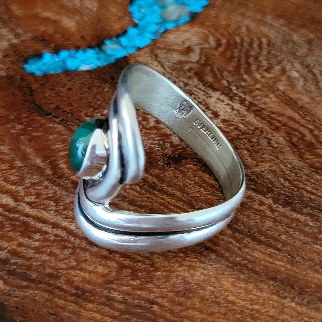 This authentic Navajo handcrafted ring is done in a gorgeous sterling silver Bypass Swirl design and features a nice Malachite stone at the center.