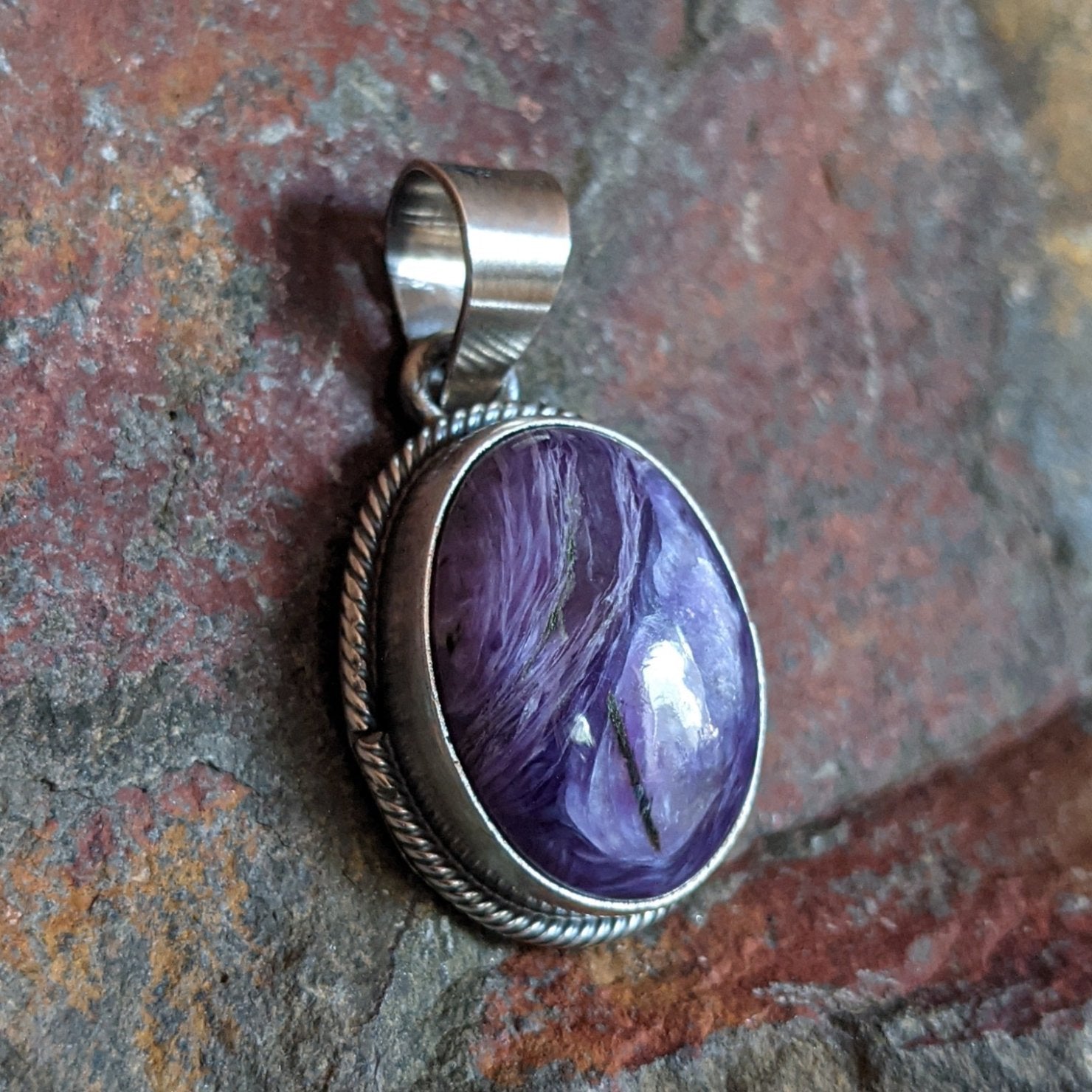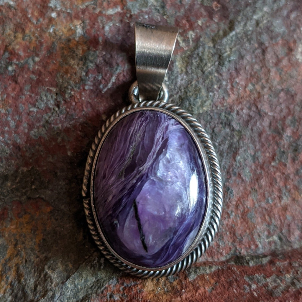 This charoite stone radiates rich purple hues, highlighted by its complex natural patterns. This piece has a patina finish, giving it a timeless look, while a twisted silver rope elegantly encircles the bezel, completing the pendant's design.